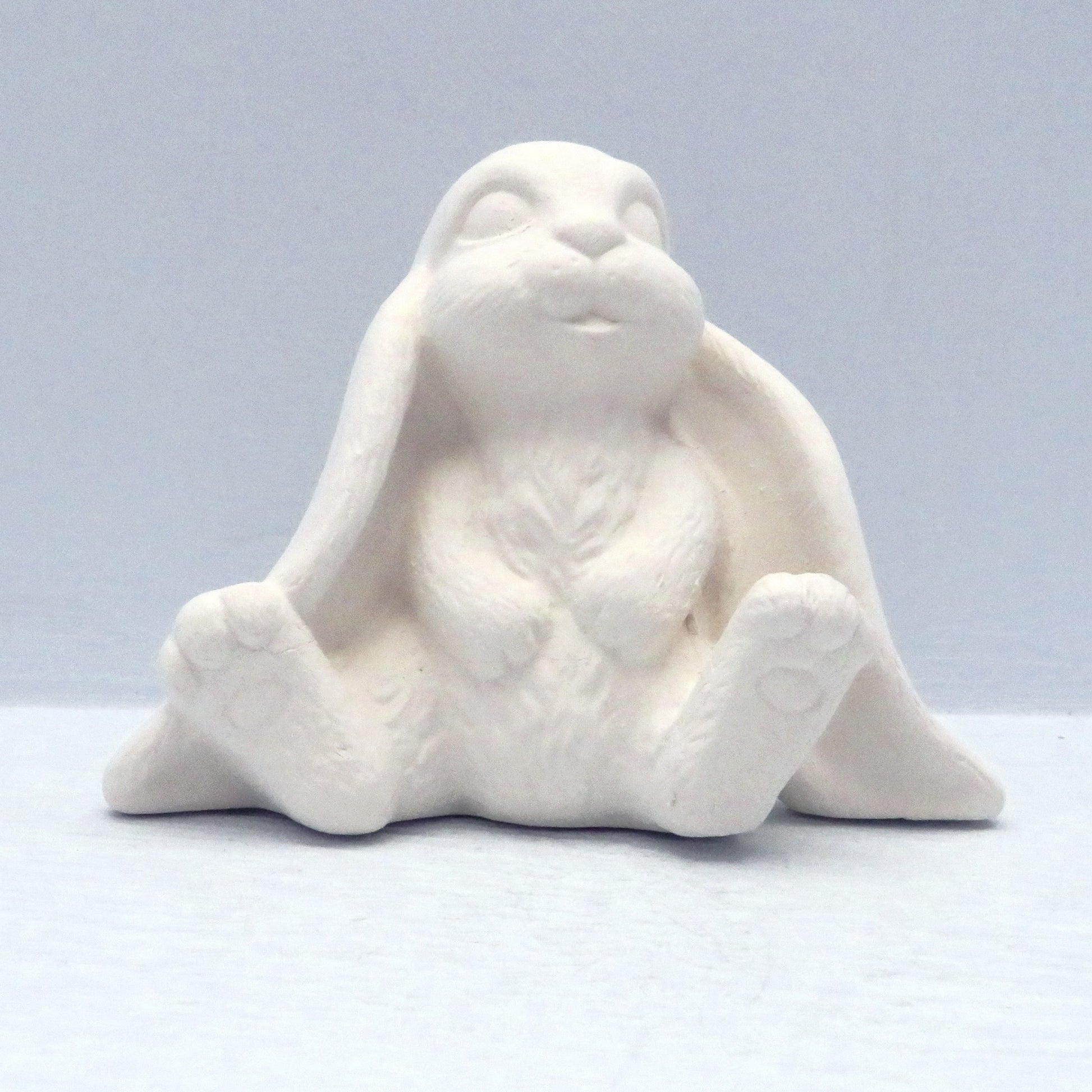 This piece of unpainted ceramics is 3 inches tall, 4 1/8 inches wide, and 2 1/4 inches deep. This unpainted bisque rabbit figurine is sitting with his feet stuck out in front of him. This lop eared bunny's ears are down along side of him, and his front paws are held close to his trunk.