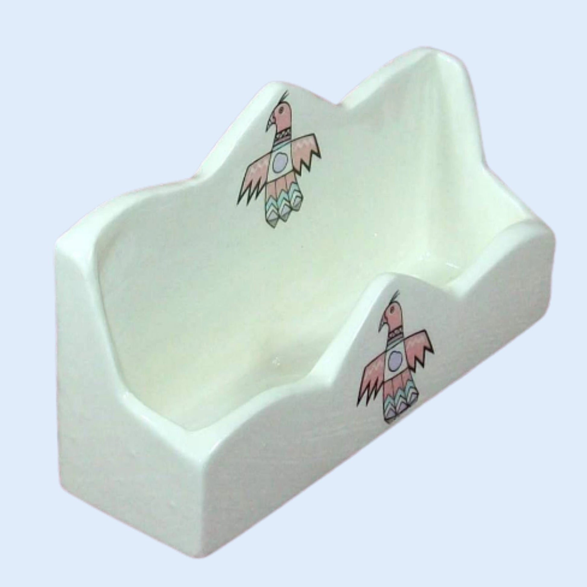 This handmade ceramic business card holder features a Thunder Bird in two places on fhe front side. This card holder is slip cast and glazed with a clear gloss glaze. I applied the two Thunder Bird decals and the piece was fired a third time to make the decal permanent.