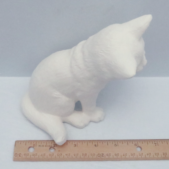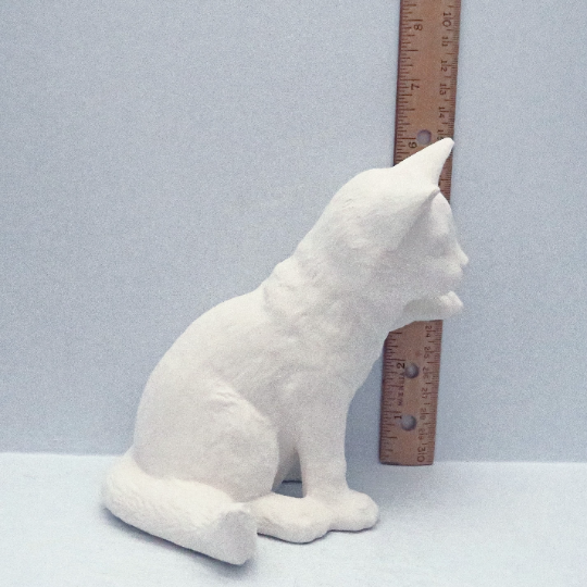 This handmade ceramic kitty statue is 6 inches tall and 6 1/2 inches wide from the front paw to the tail. It shows a lot of detail in the face and fur, and will look great with a touch of your creativity.