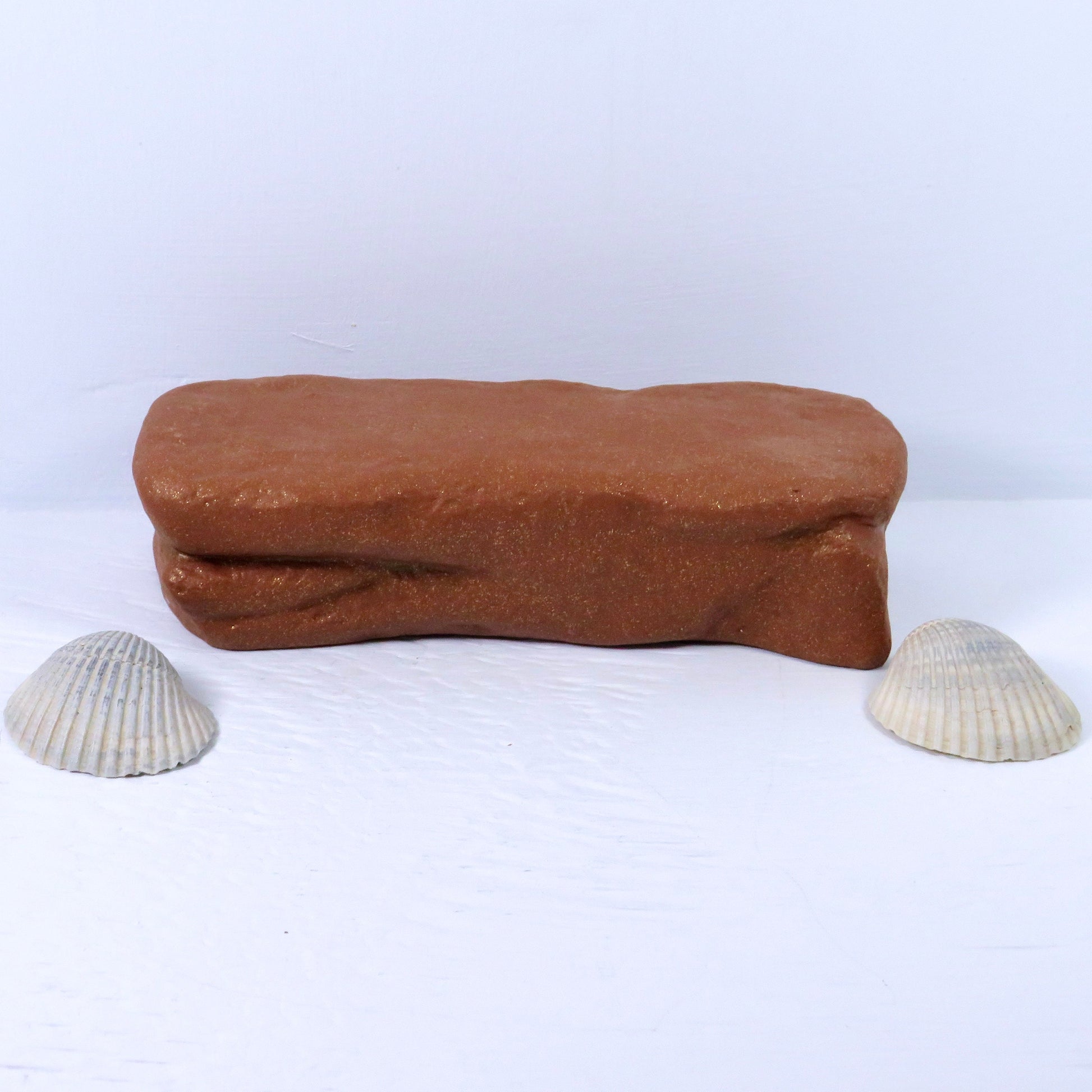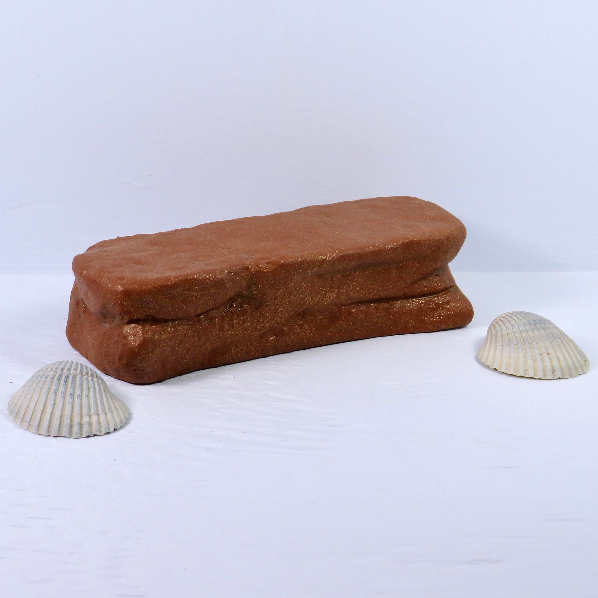 This ceramic stone pedestal is perfect for displaying ceramic or wood statues that appear to be lying or resting on the pedestal. The pedestal is 1 1/2 inches tall, 5 inches long, and 2 inches deep. It was painted brown and antiqued with a brown solution with gold flecks..