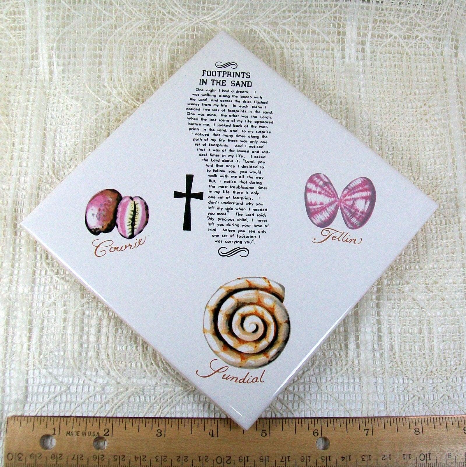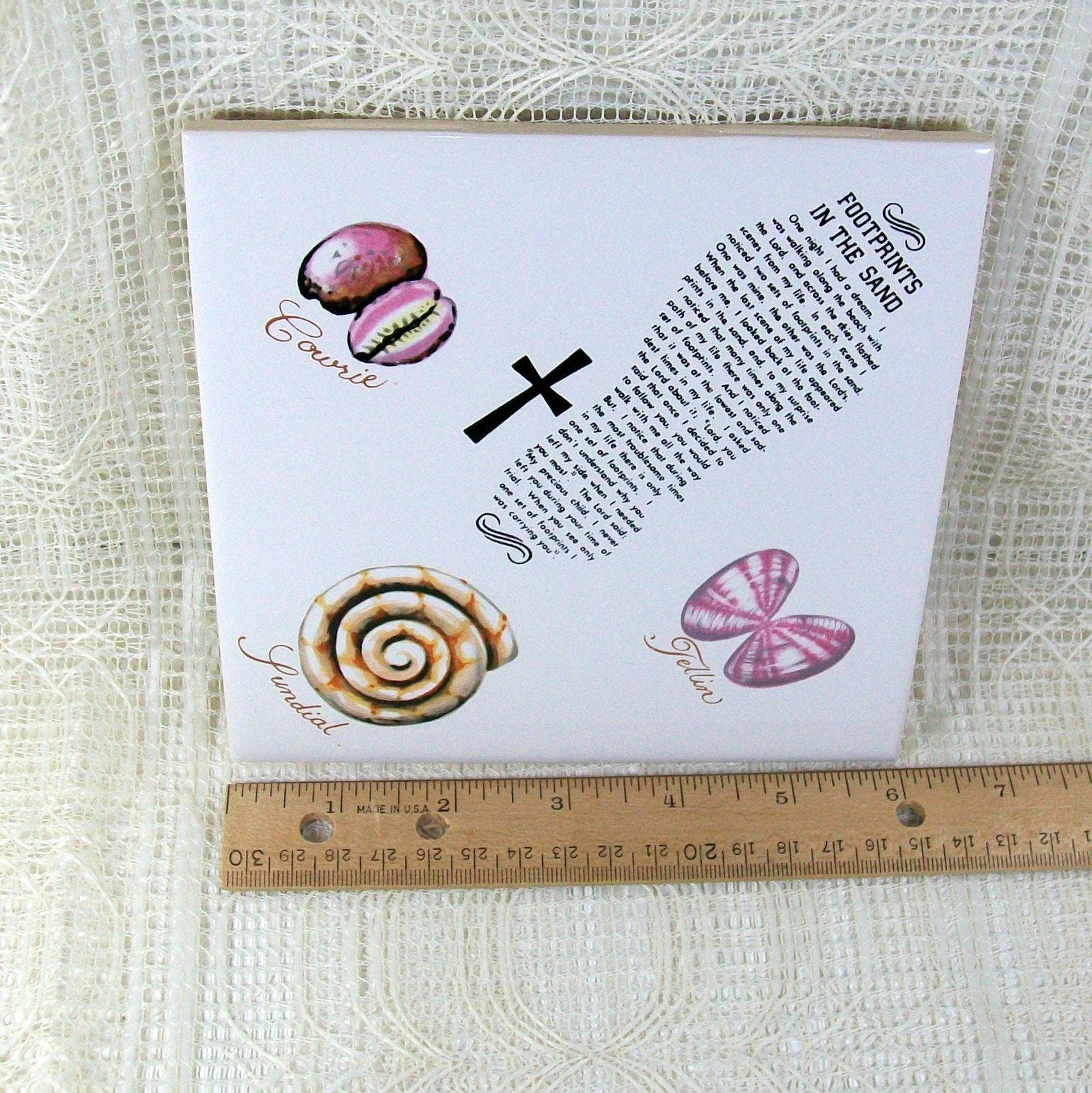 You will love using this ceramic tile trivet. This kitchen trivet features the "Footsteps in the Sand" poem and 3 sea shells. This gorgeous cup coaster measures 6 inches square, and has 5 feet on the bottom to protect delicate surfaces from scratching, while bringing beach decor to your kitchen or dining room.