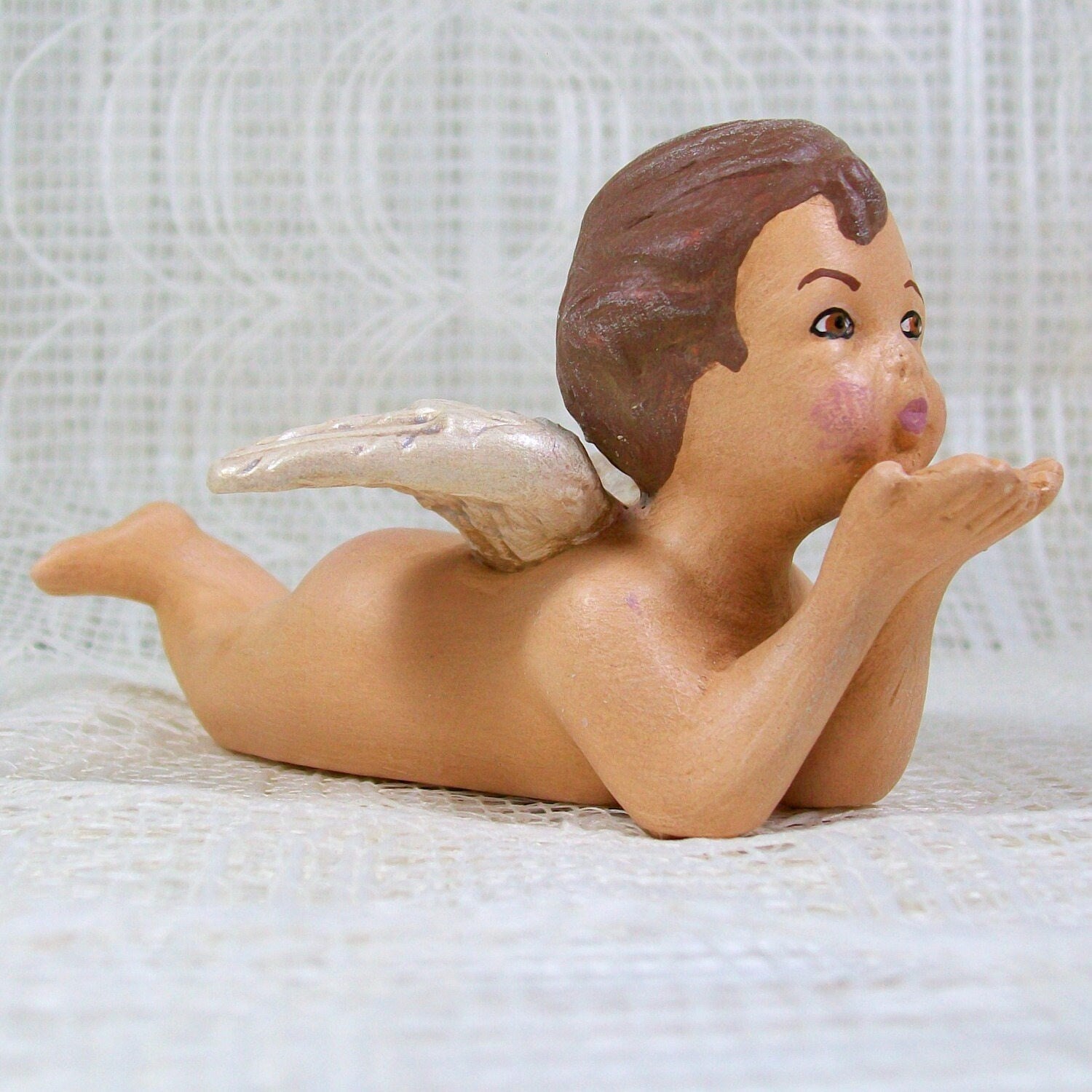 This ceramic angel is 4 1/2 inches long, 3 inches wide at the wings, and 2 1/2 inches tall. He was slip cast and painted with acrylic paints for a matte finish. This cherub figurine has brown hair and brown eyes and is lying on his tummy blowing a kiss. His wings have a pearl finish.