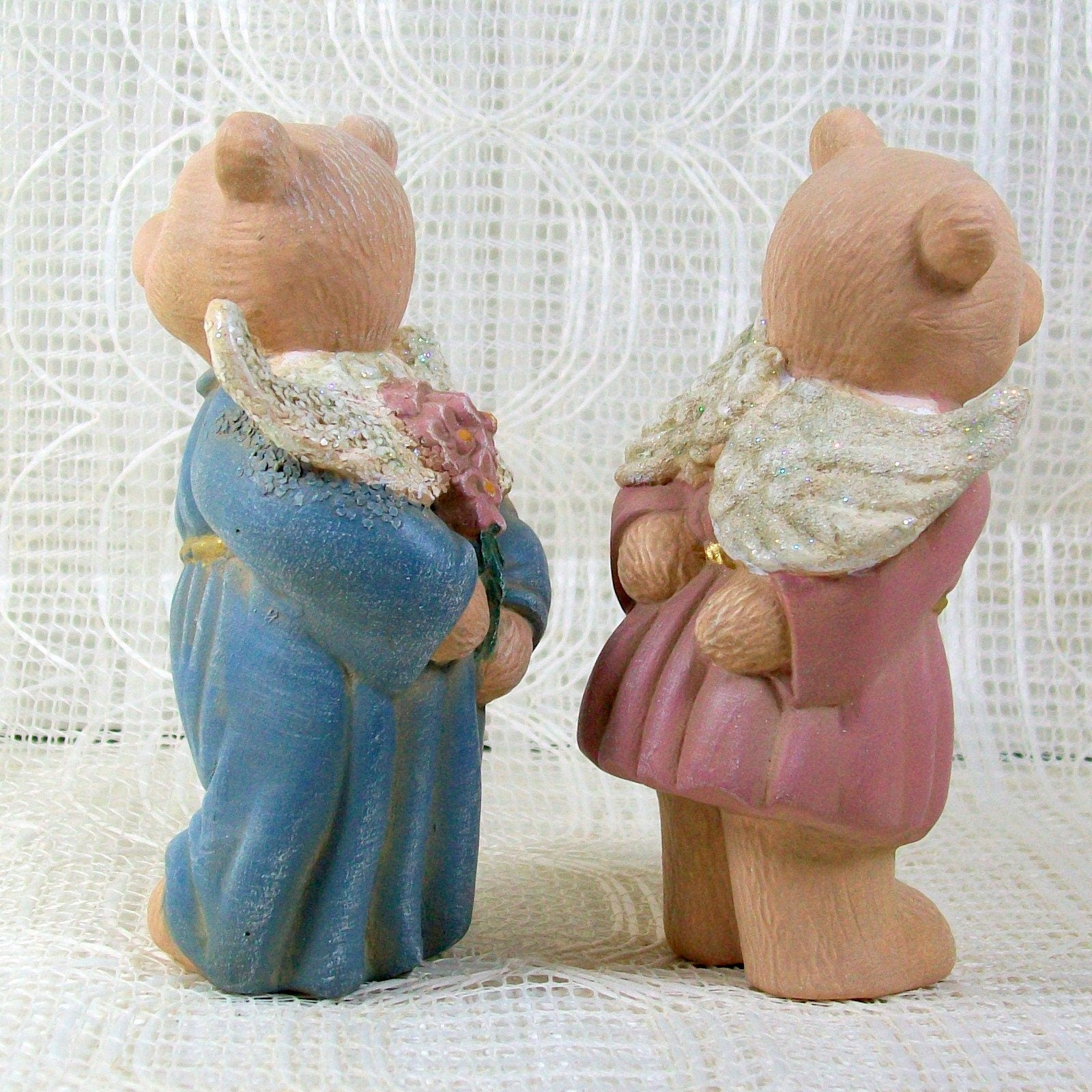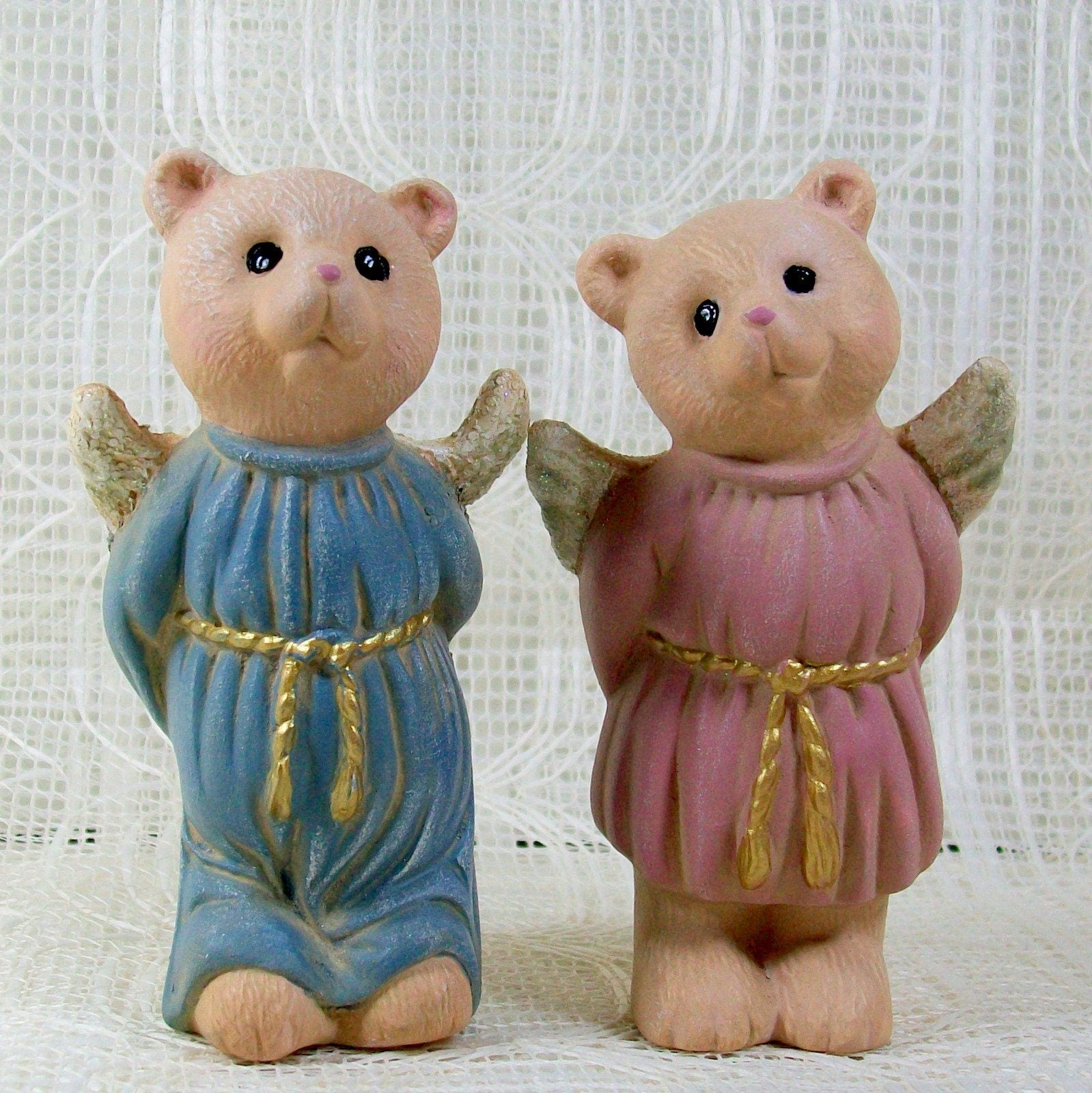 These adorable ceramic angel bear figurines must really love each other! And if you look closely, Barney, the boy angel bear, has a bouquet of pink flowers behind his back for Bernice, his true love.
