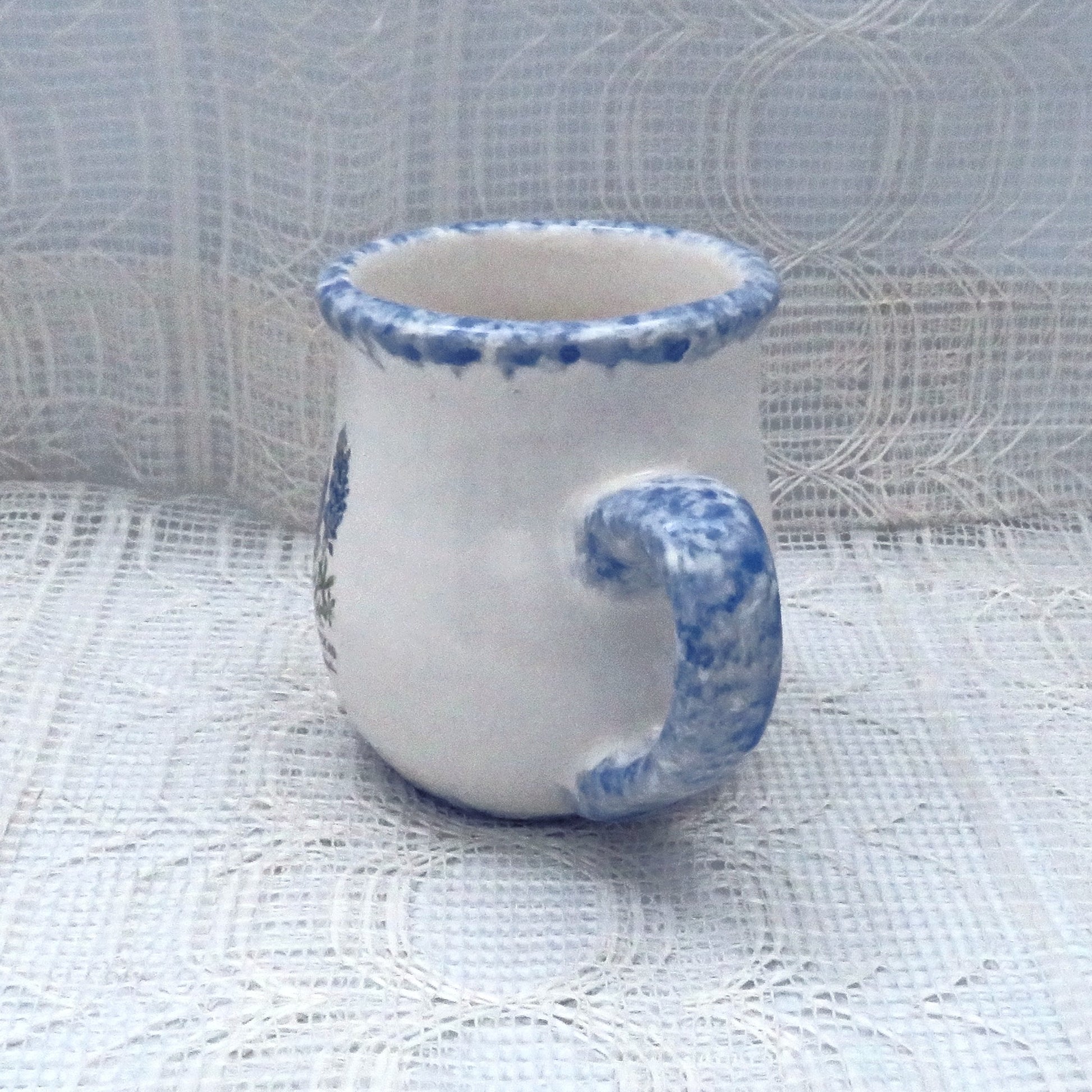 This mug was slip cast in my studio. It has been fired 3 times. This beverage container holds approximately 9-10 ounces of liquid It is almost 4 inches tall and 3 inches in diameter, 4 1/2 inches with the handle. The mug is white with blue trim around the rim, the base, and the handle. The bluebonnet decal has 2 bluebonnets with some leaves and the name "Texas" underneath it. Because they are handmade, there may be slight differences in the thickness of the blue trim.
