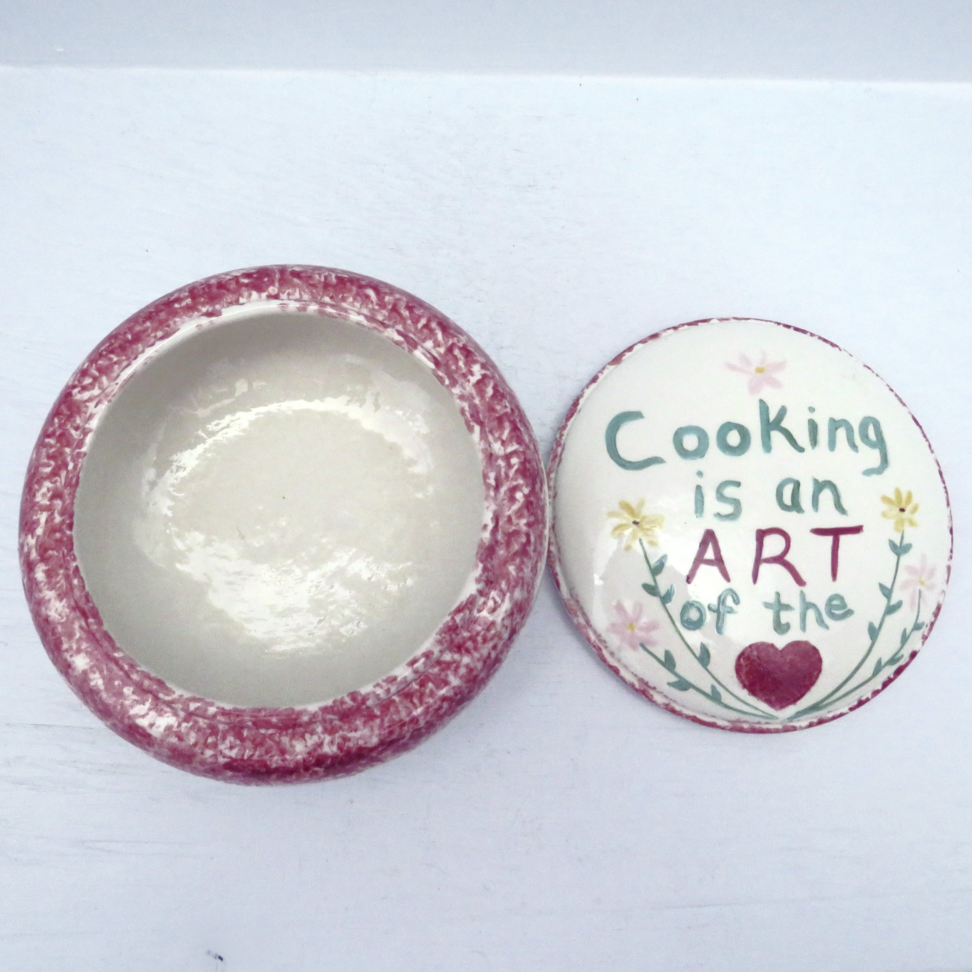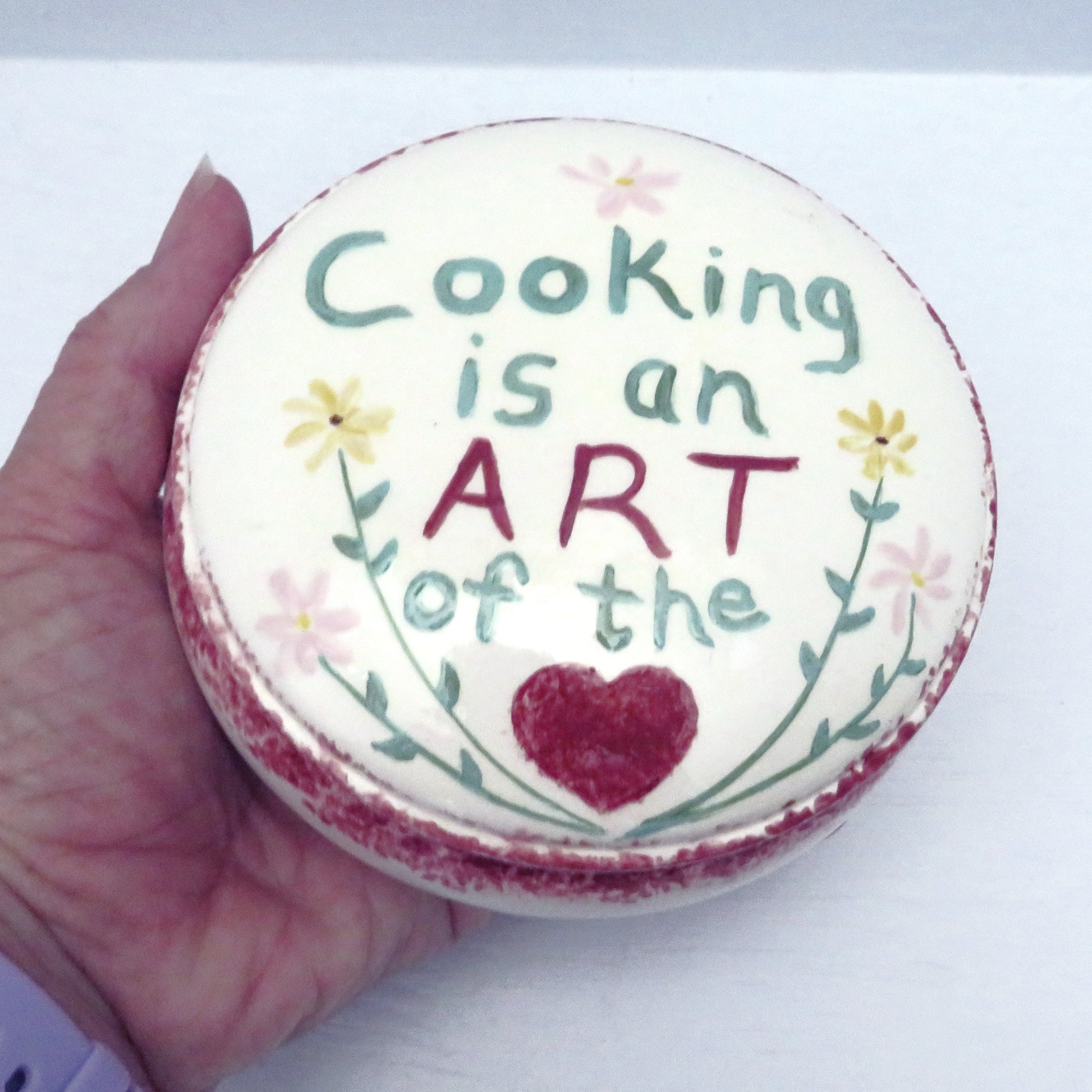 This round trinket box with lid was slip cast and hand painted painted with underglaze before the first firing. 3 coats of food safe glaze were applied to the bisque and the piece was fired again. It is 4 1/2 inches in diameter and approximately 2 1/2 inches tall. The words "Cooking is an Art of the Heart," with the word "heart" being a picture of a heart, are written on the box in an aqua color. The heart and the trim are done in raspberry. There are two yellow and pink flowers painted as a partial frame to the phrase.