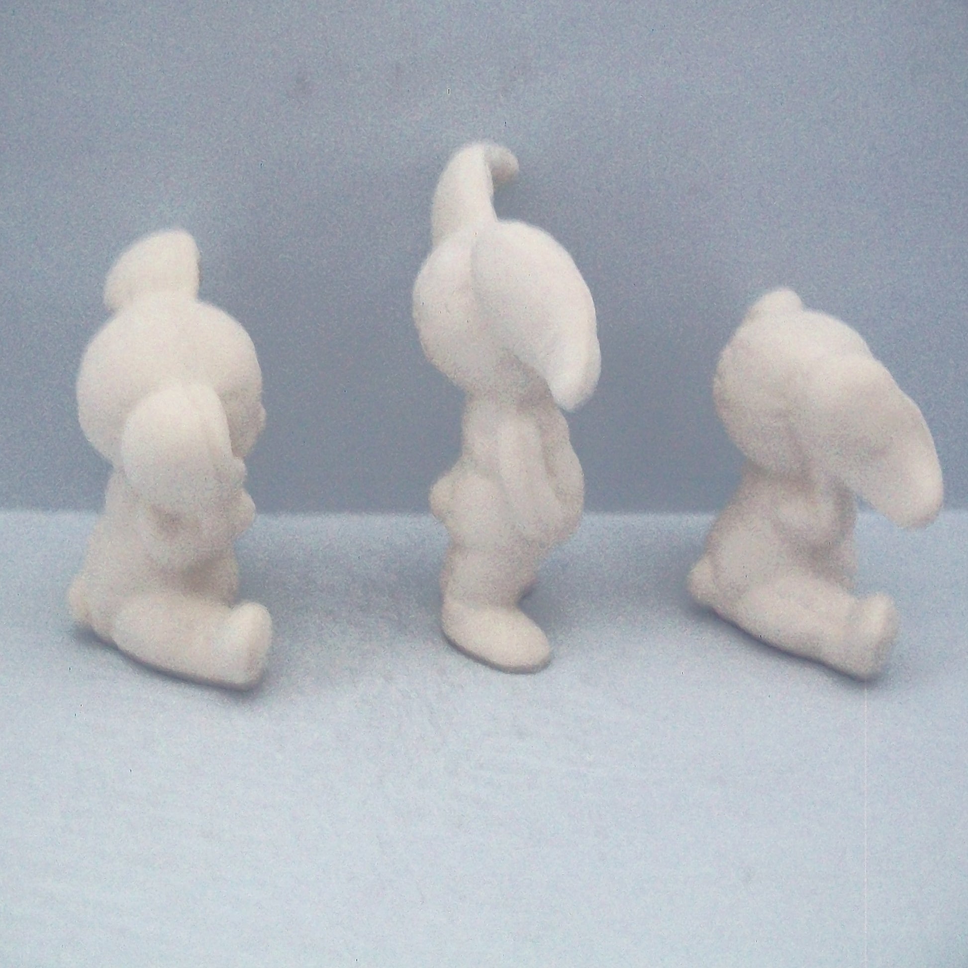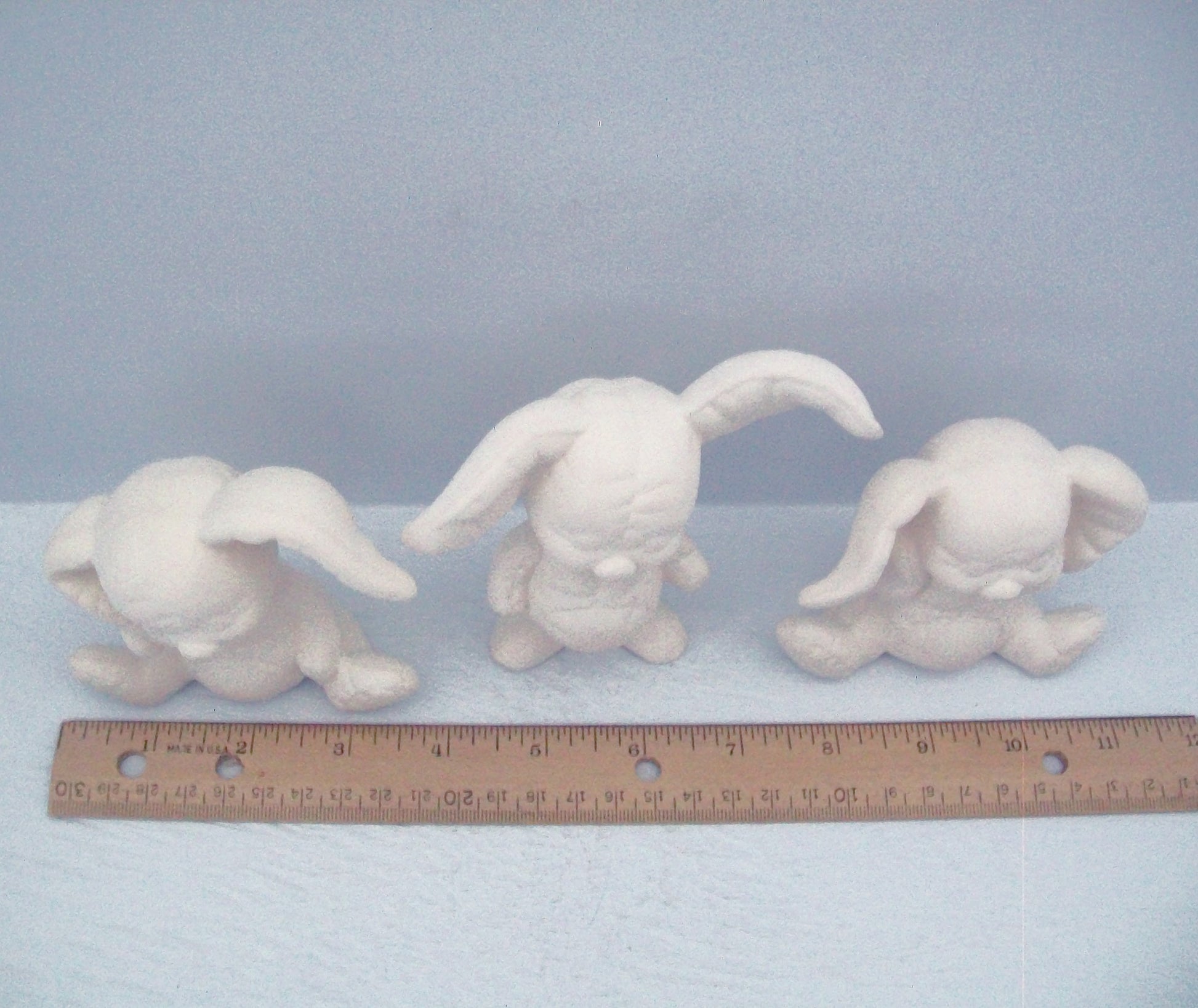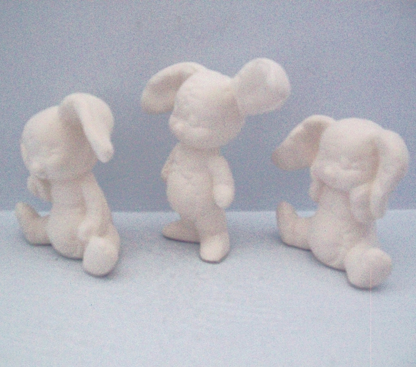 This set of three bunny statues are posed in sitting and standing. They range in size from 3 inches to 4 1/4 inches tall and up to 3 3/4 inches wide.