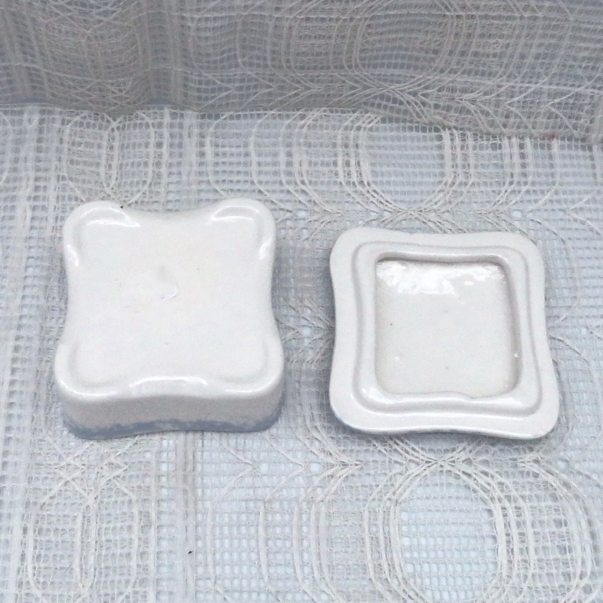 This jewelry dish was slip cast, glazed, and fired in my studio. It is 3 1/4 inches wide, 3 1/4 inches deep, and 1 1/2 inches tall with the lid on. It can be used as a paper clip holder, a jewelry box, a candy dish, or simply as part of your inspirational decor.