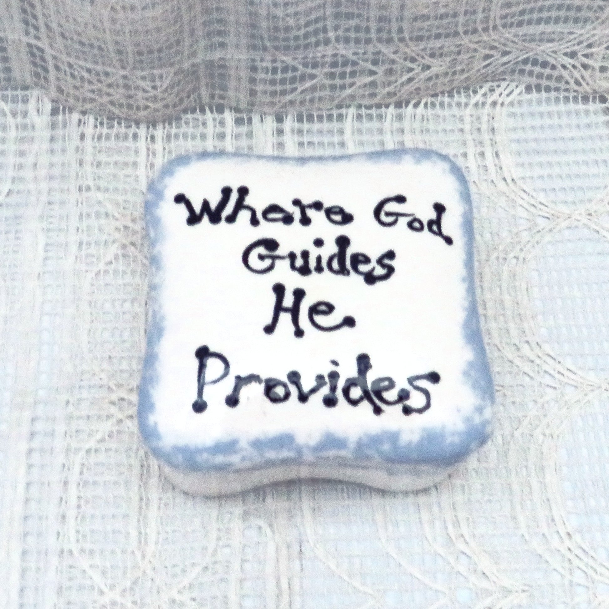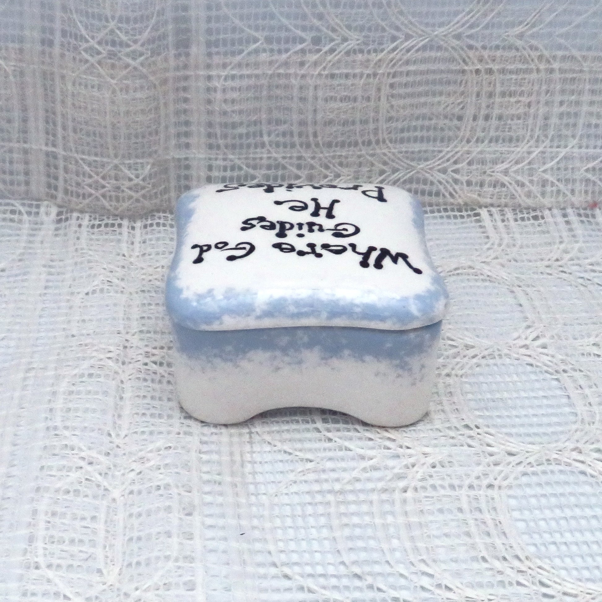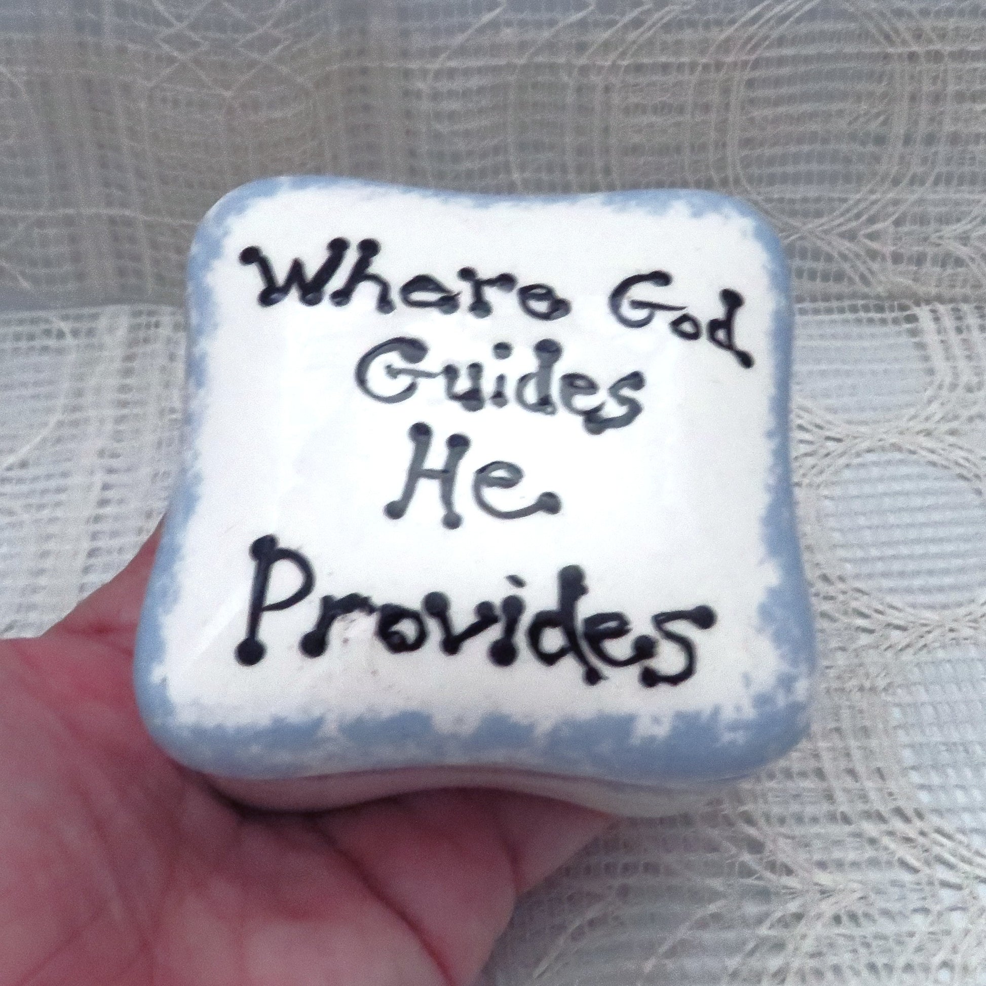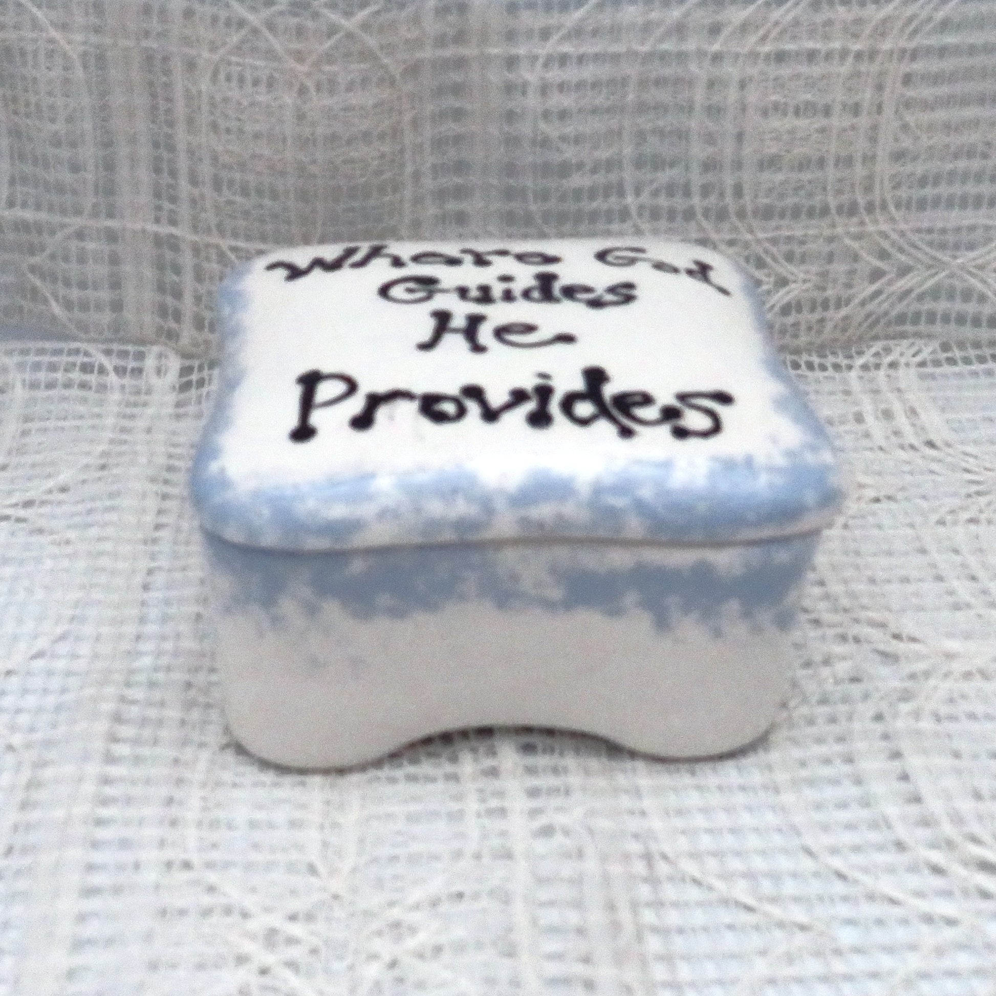 This treasure box is glazed white with blue trim around the edges. The sentence, "Where God Guides, He Provides is written in black handprinted lettering. It has a glossy finish.