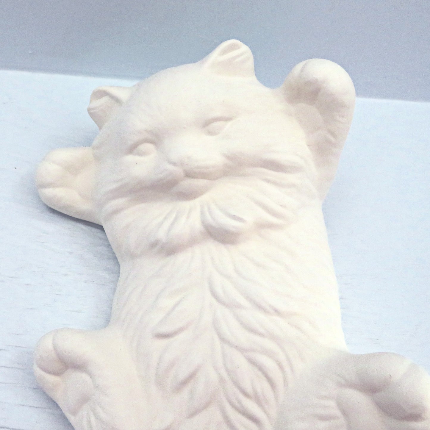 This adorable unpainted ceramic cat figurine will make you want to pet it This kitty statue is posed on her back with her legs outstretched. The detail in the statue shows long hair and a sweet face.