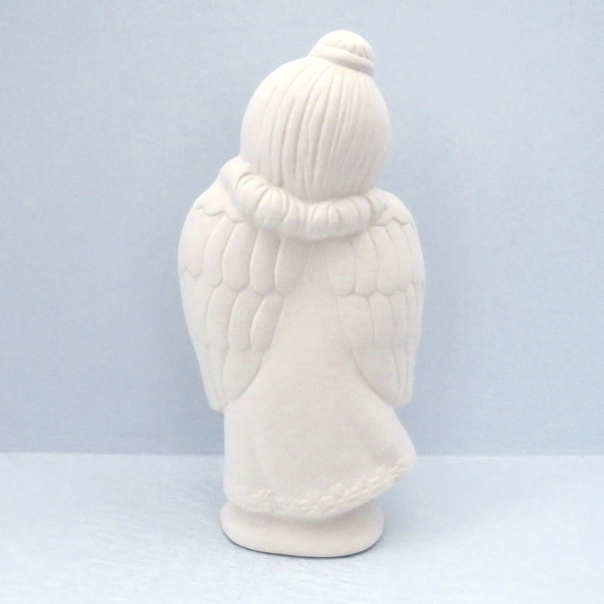 This bisqueware angel is 9 1/2 inches tall and 4 1/2 inches wide, and 2 1/2 inches deep. This unpainted ceramic angel was slip cast, cleaned, and fired in my studio to cone 04. This ready to paint ceramic angel statue will be gorgeous when painted with acrylics, color wash, or glazed and fired again to cone 06. She will be a treasured addition to your angel decor.