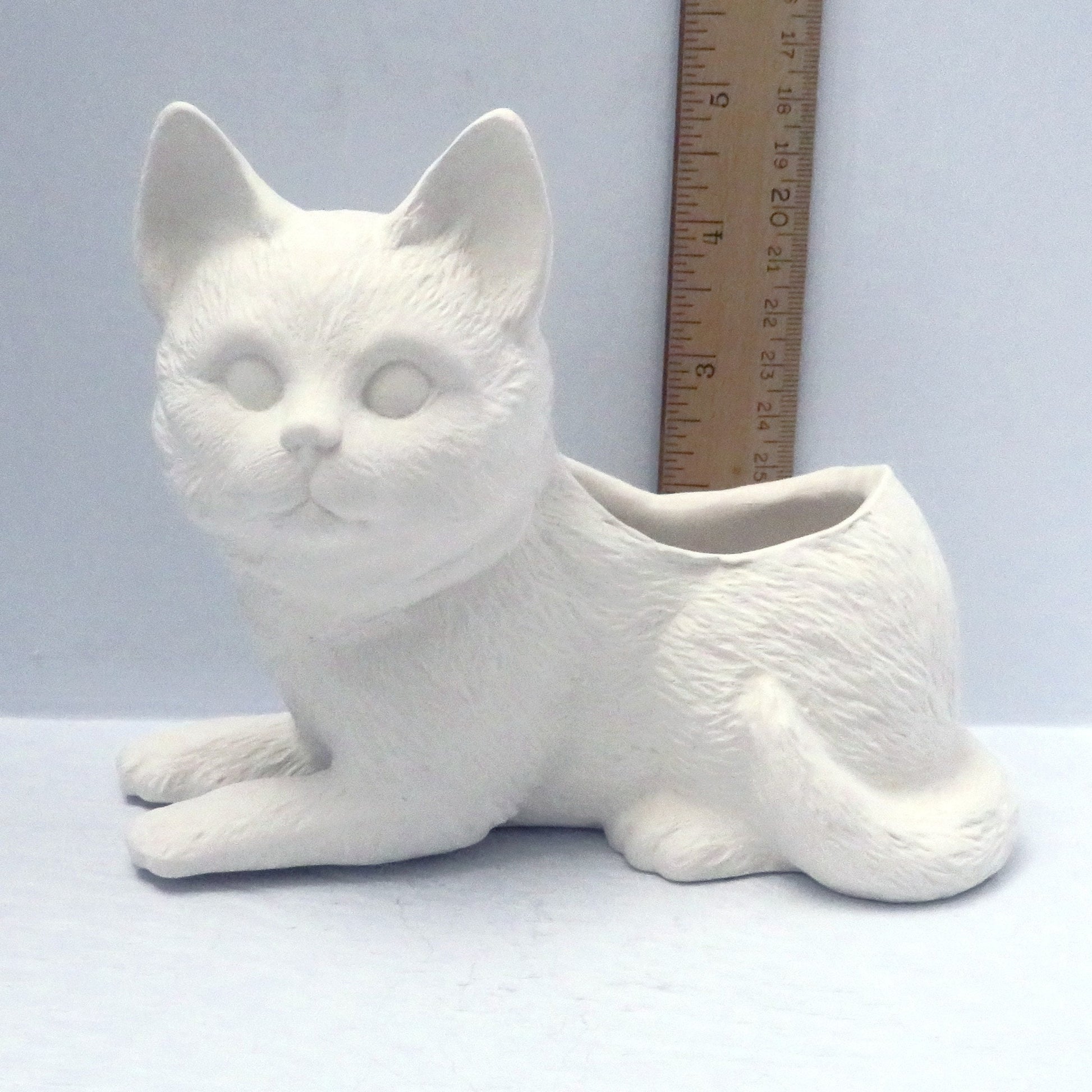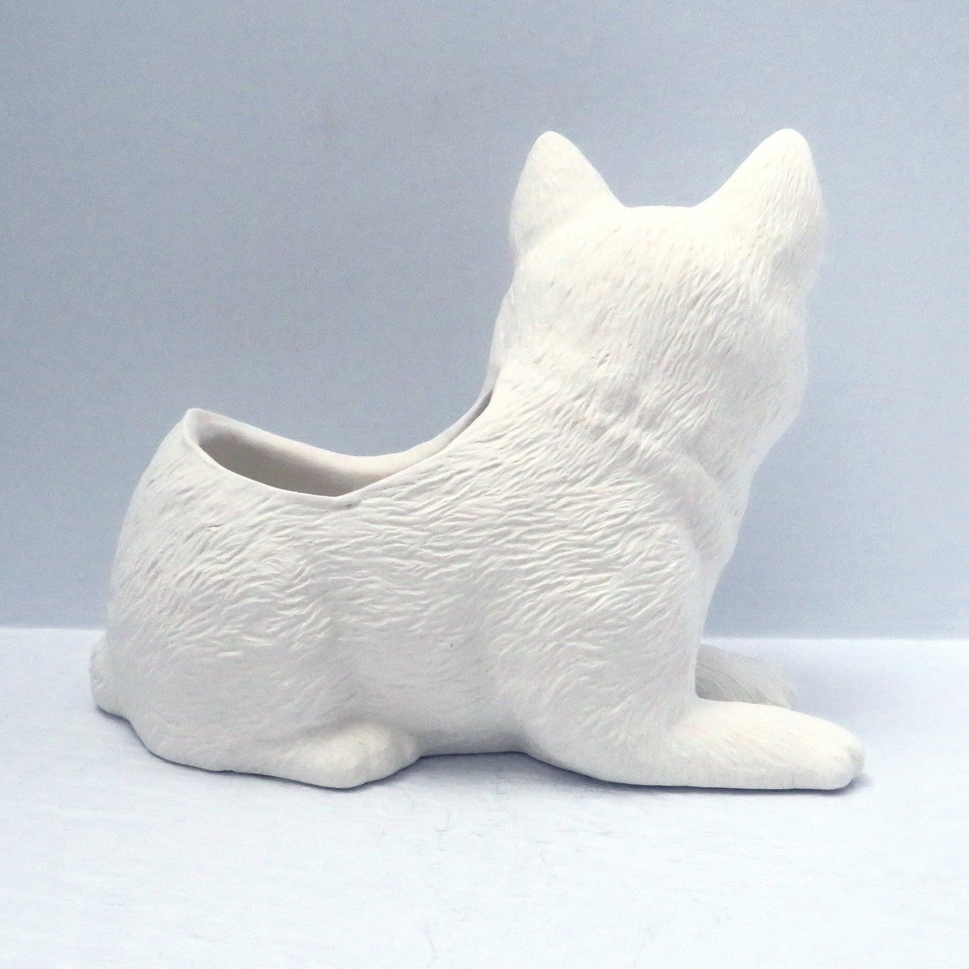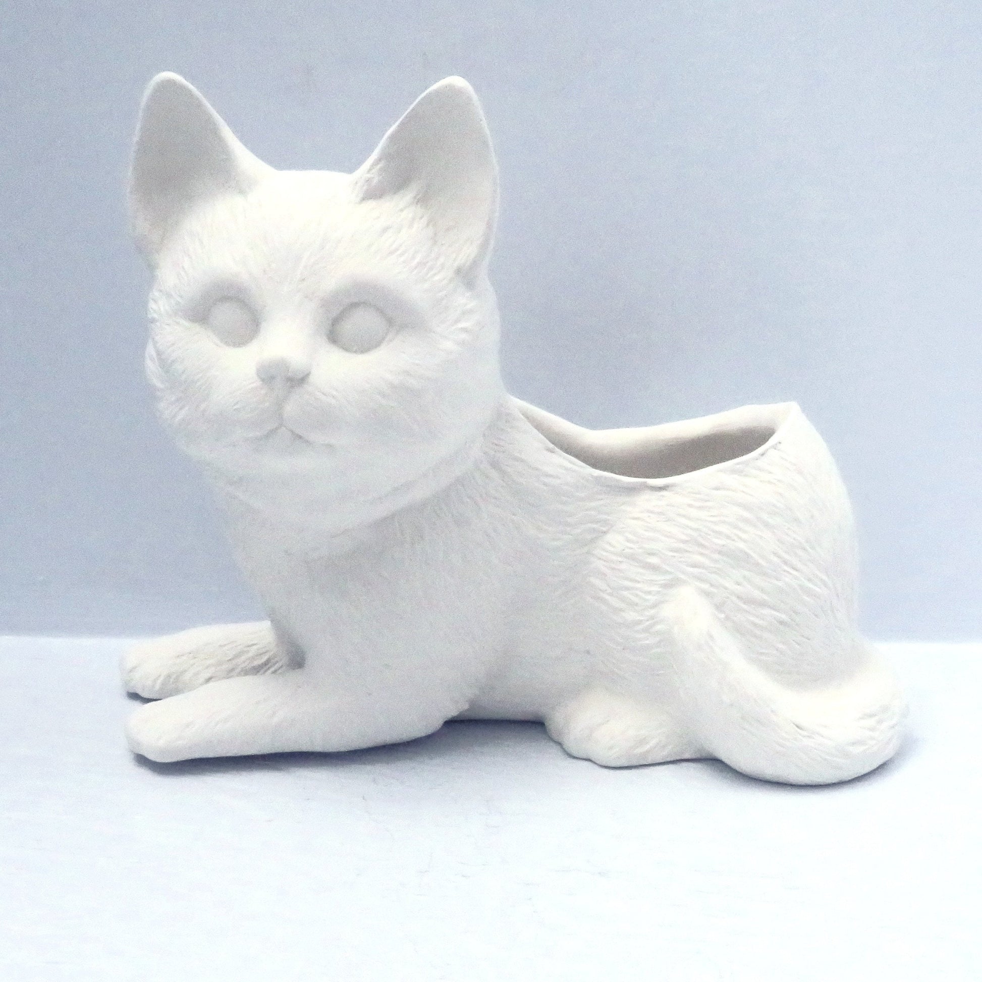 This unpainted ceramic cat bisque figurine doubles as a small planter, perfect for succulents or a small plant. There is a hole at the bottom for drainage. This figurine depicts a cat lying down with its head up. It was slip cast in my studio and the back was cut out for the planter. It was fired to Cone 04 and is ready to be glazed to Cone 06 or painted with acrylic paints