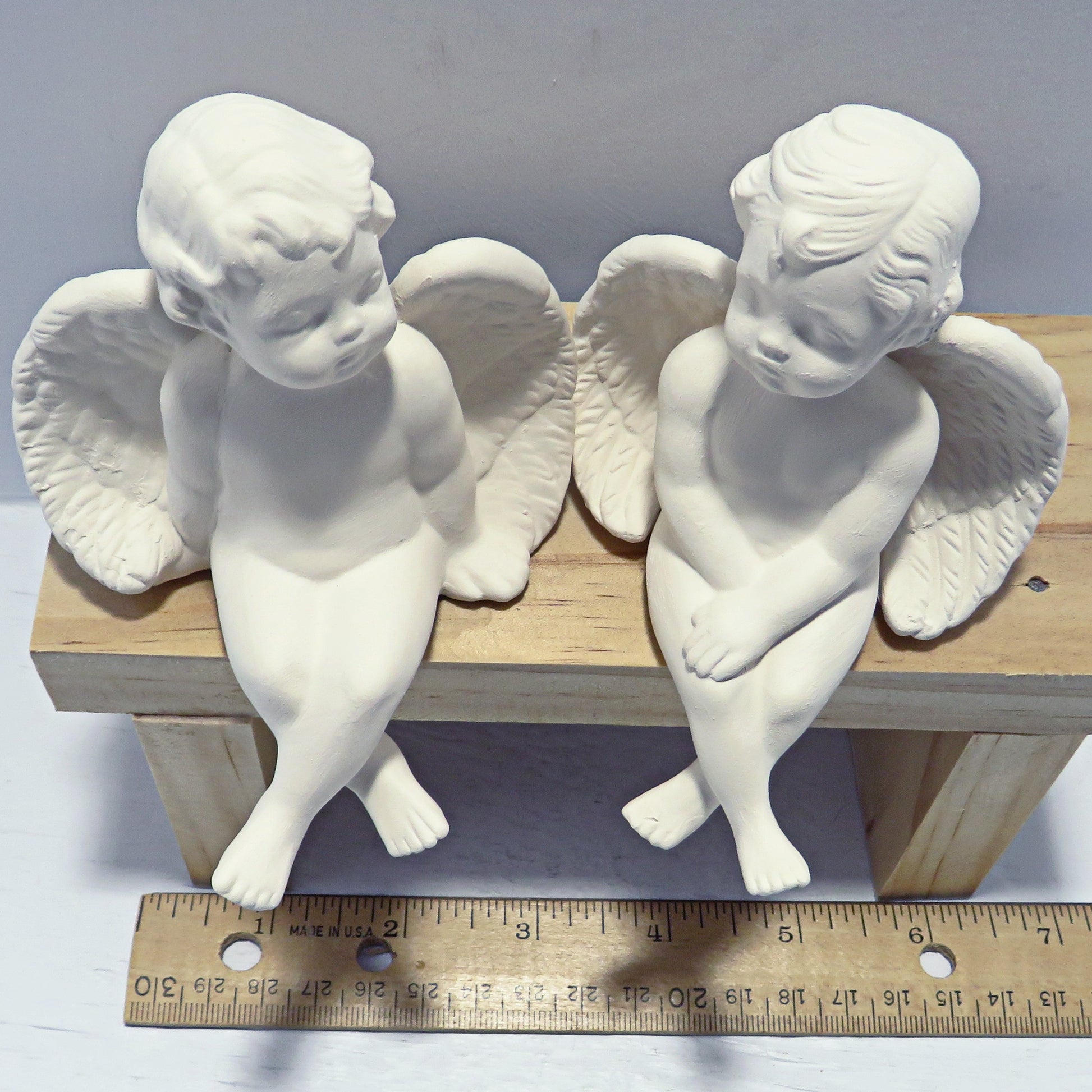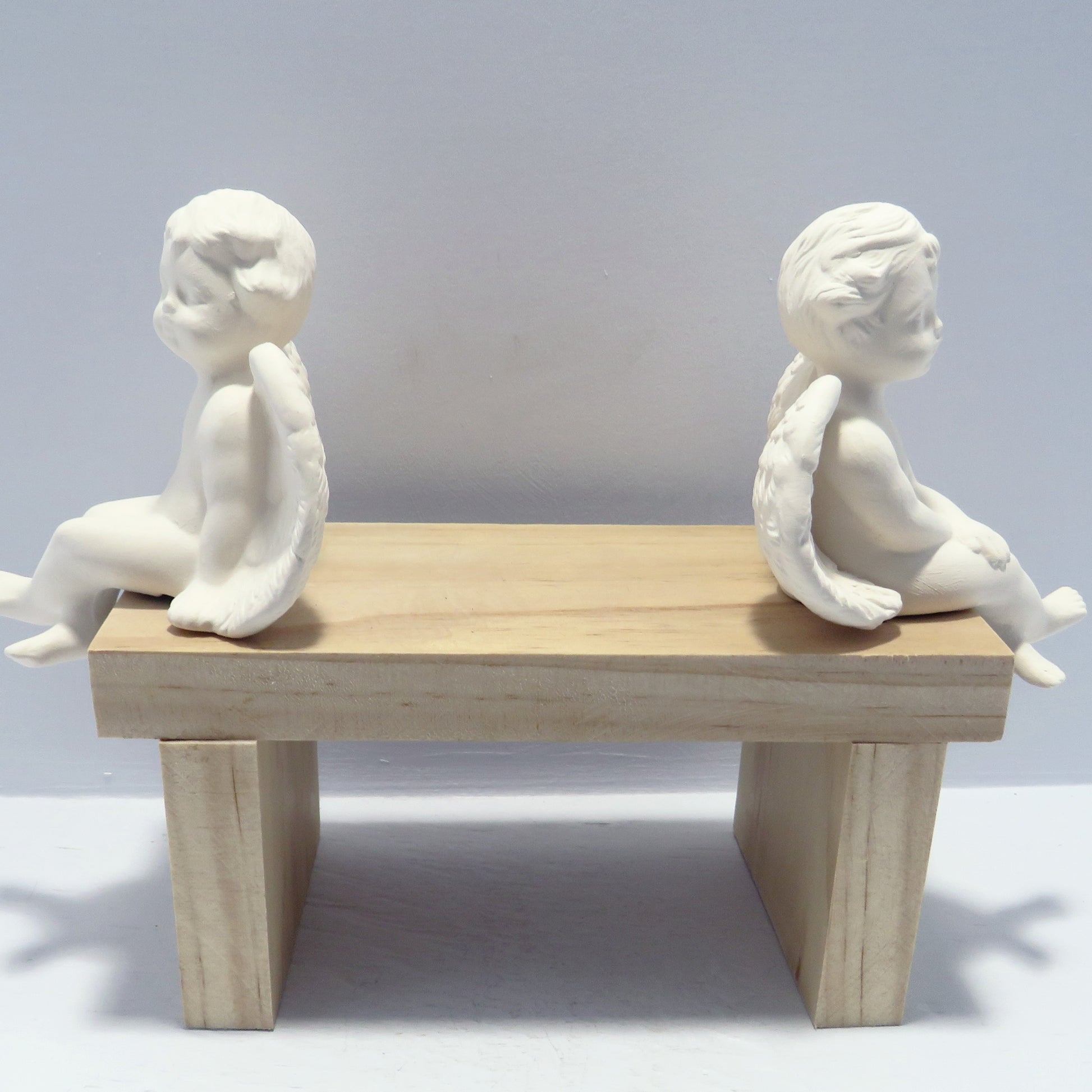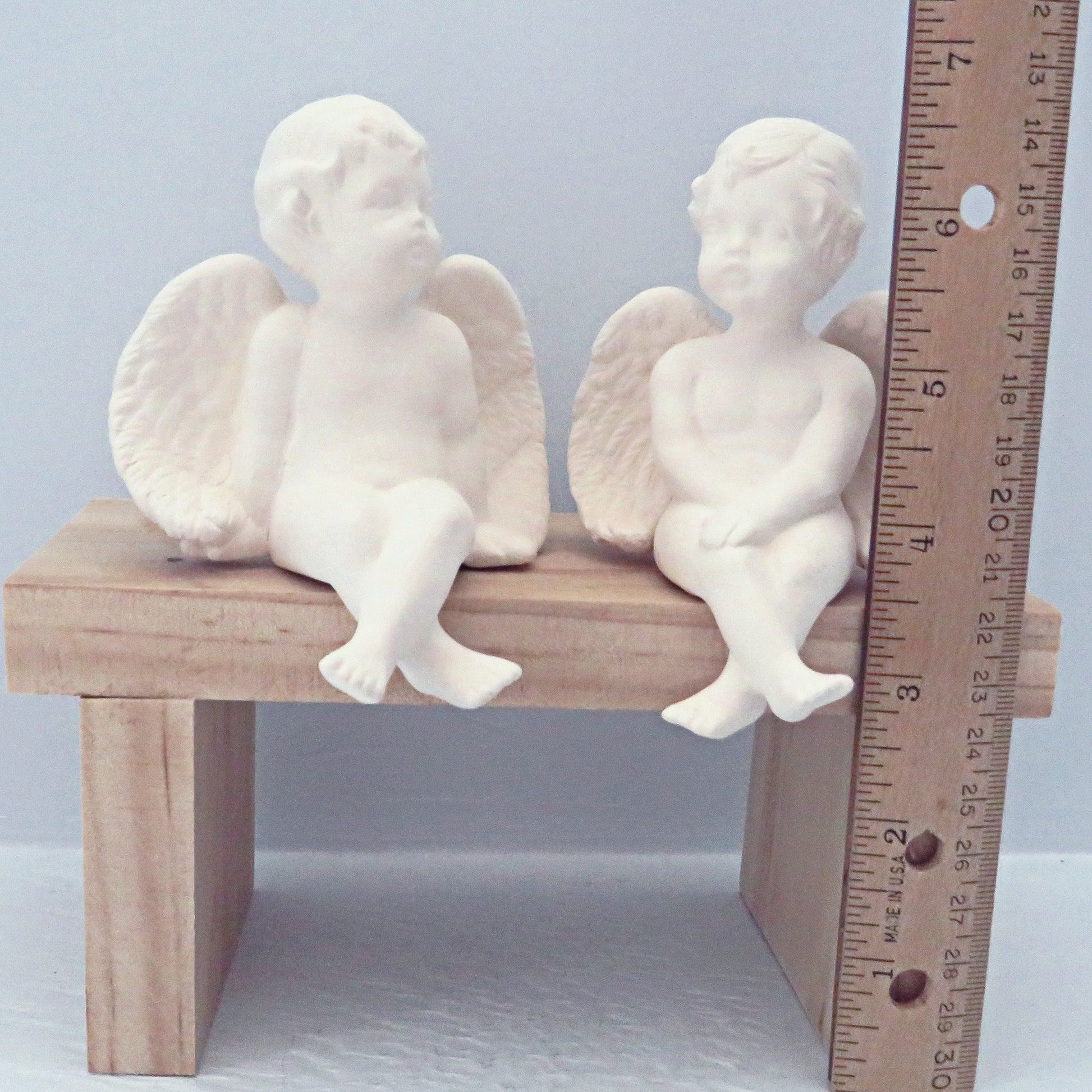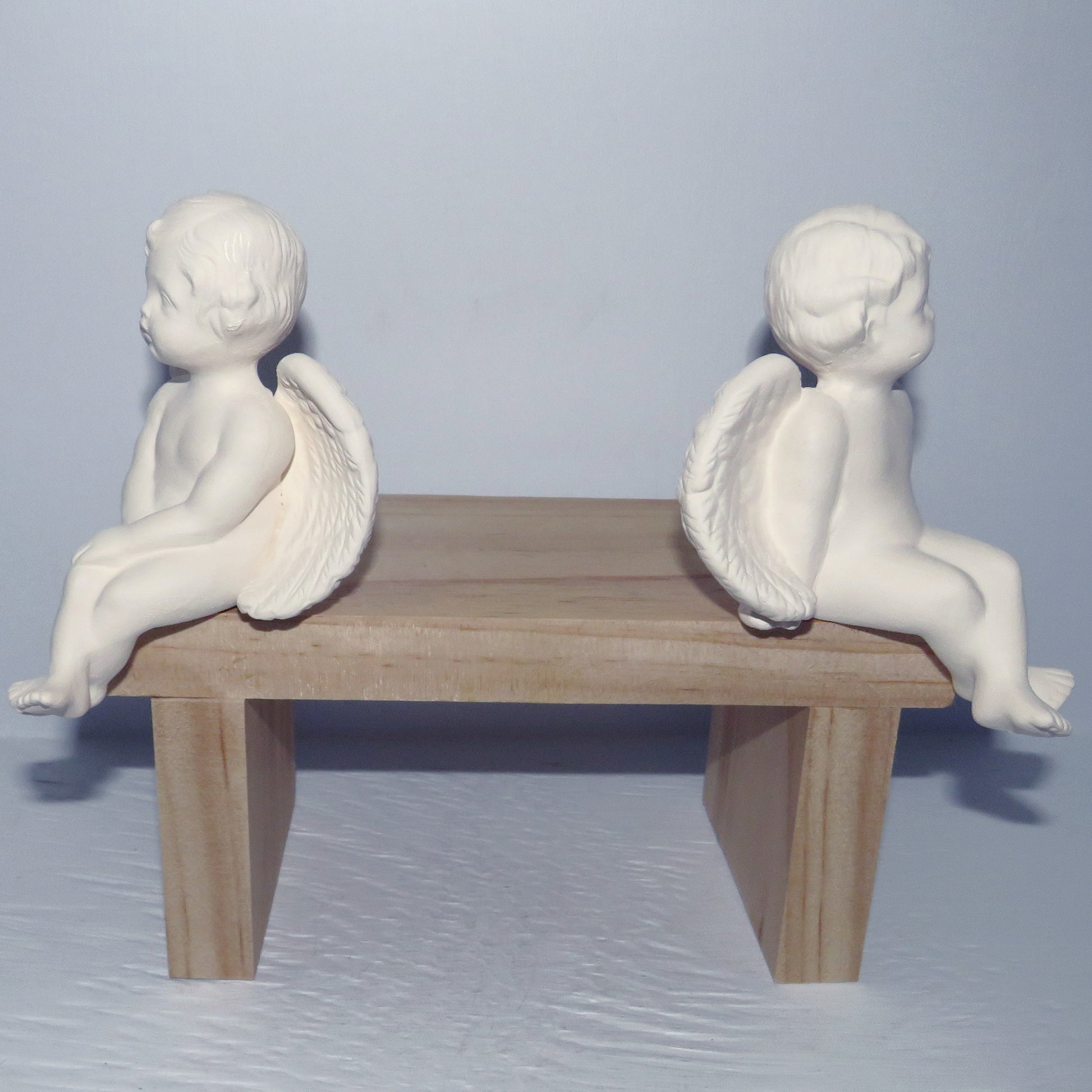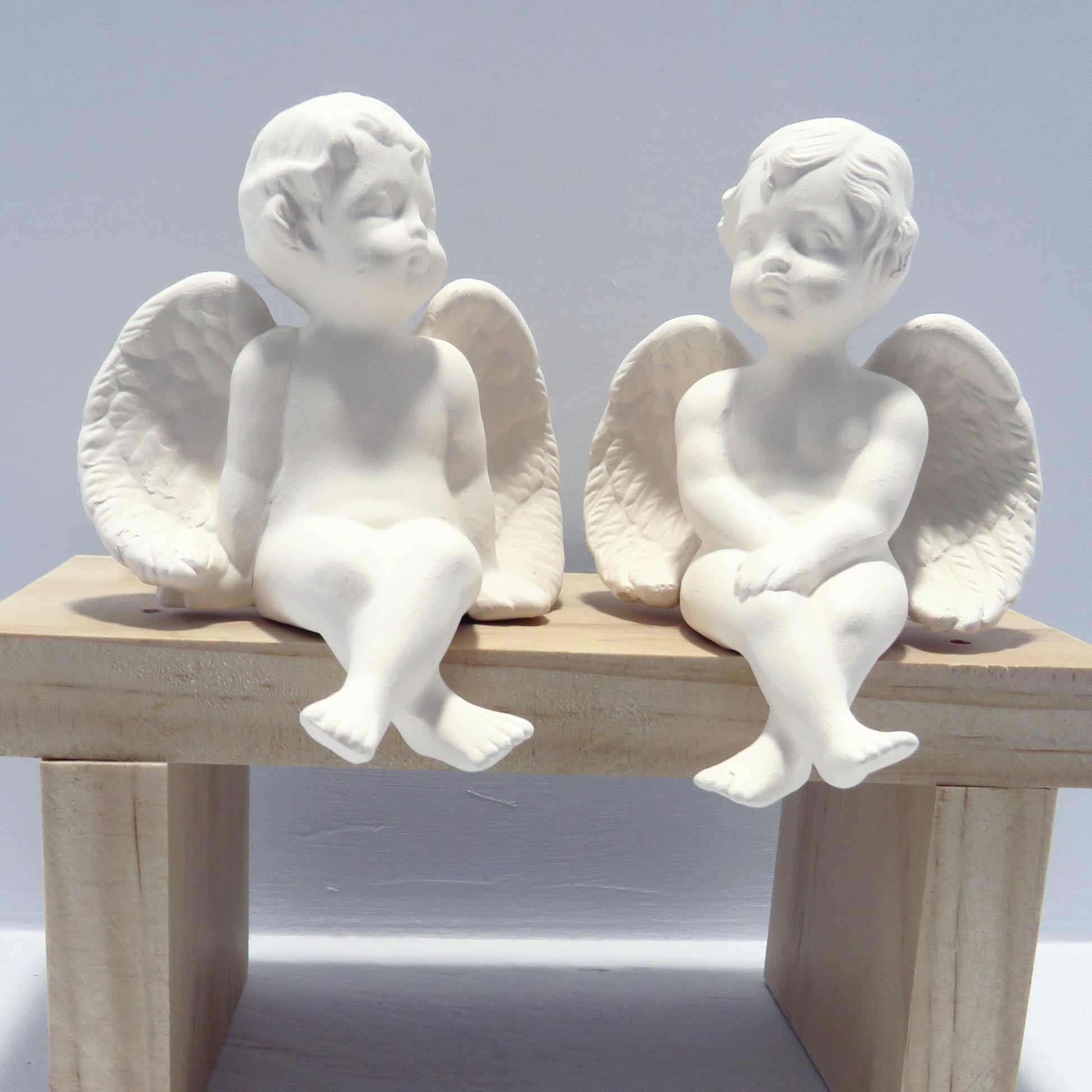 These 2 little handmade ready to paint cherub figurines look like they are in deep conversation! They are sitting on a bench with their heads turned toward each other. These paintable ceramic cherubs were slip cast in my shop and fired to cone 04. They are ready to paint with acrylics or to glaze and fire to cone 06.