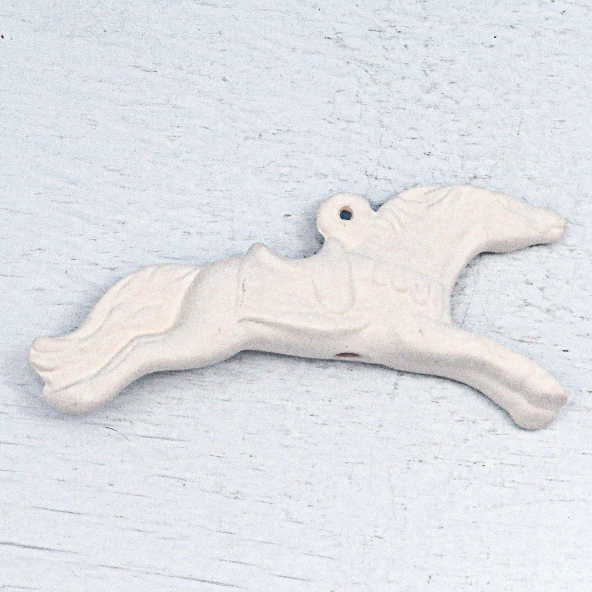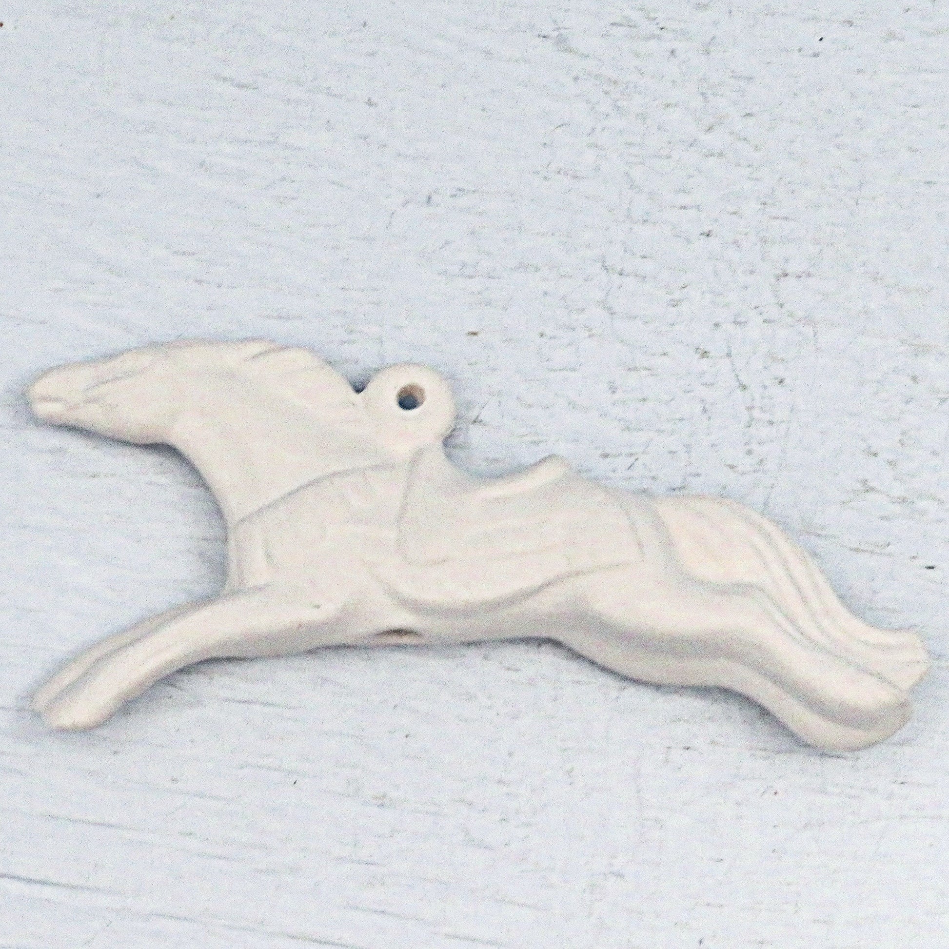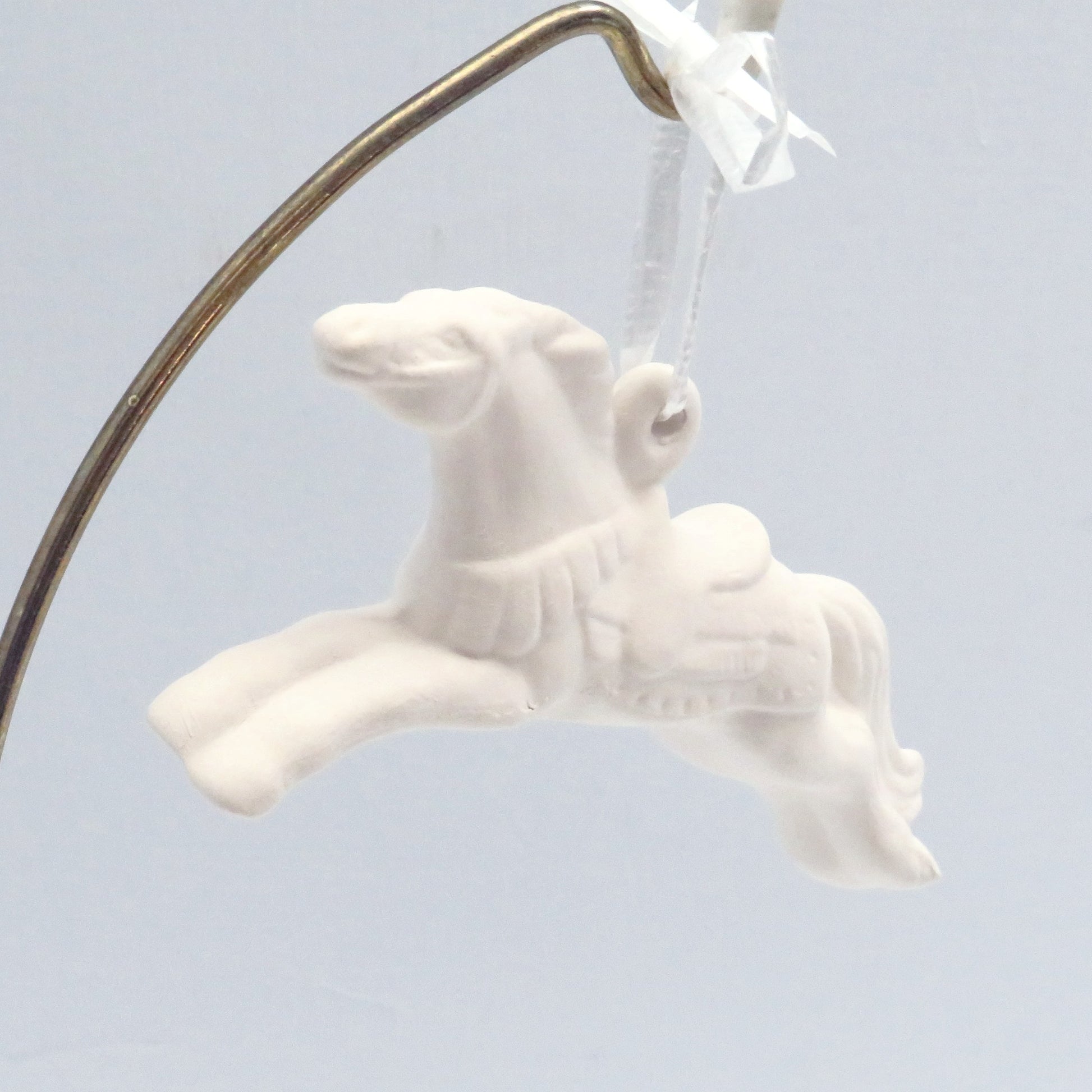 This handmade ceramic leaping carousel horse ornament is ready for you to paint or glaze and refire to cone 06 if you have a kiln available. It has a mall loop for you to put ribbon or an ornament wire. It can be used for a Christmas tree ornament or with a hanger on a shelf.