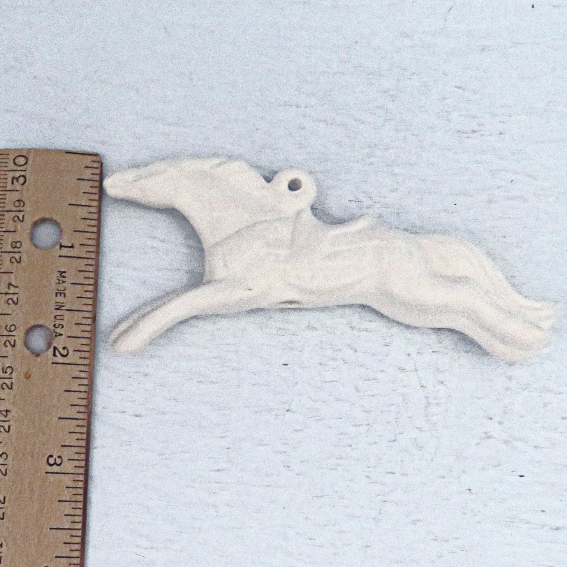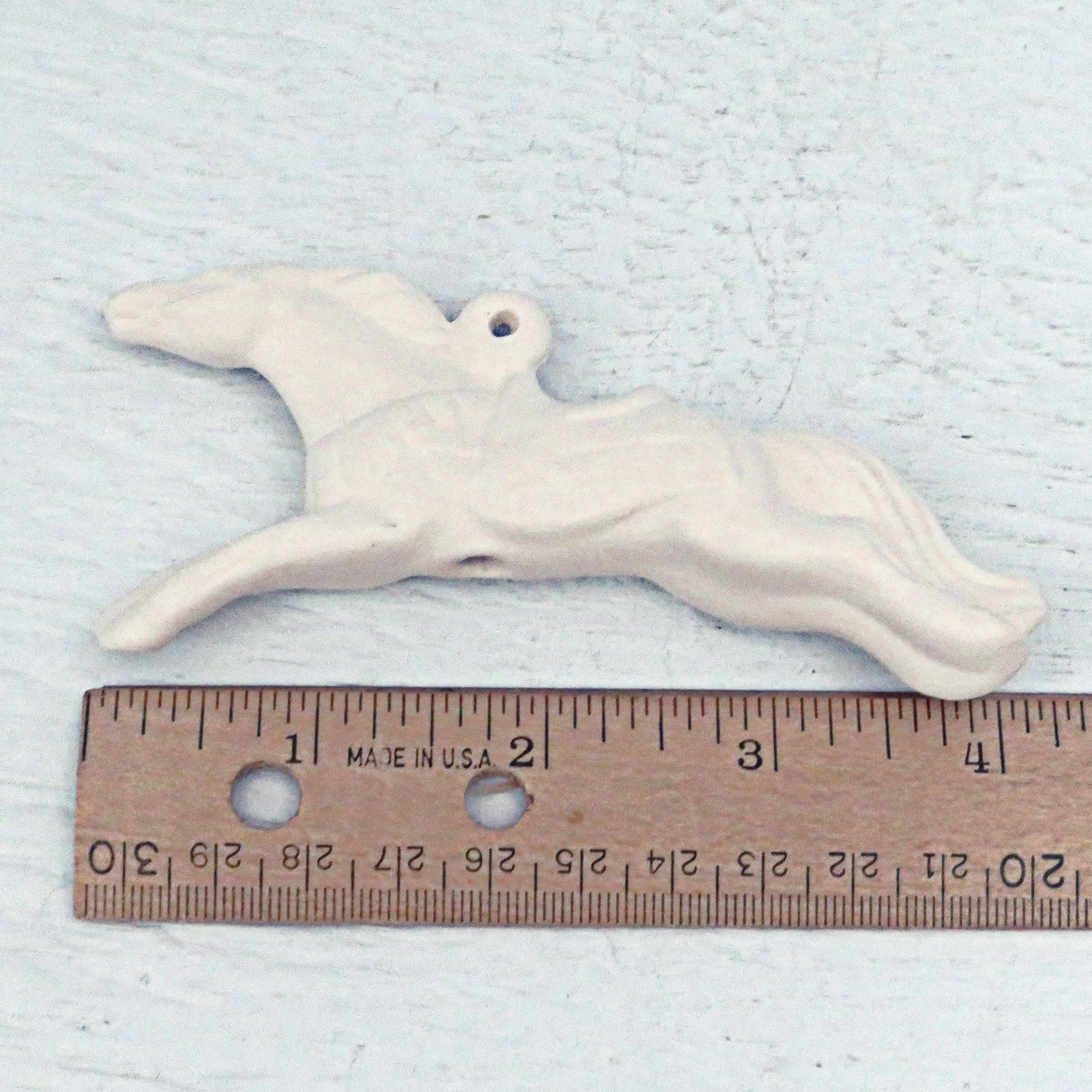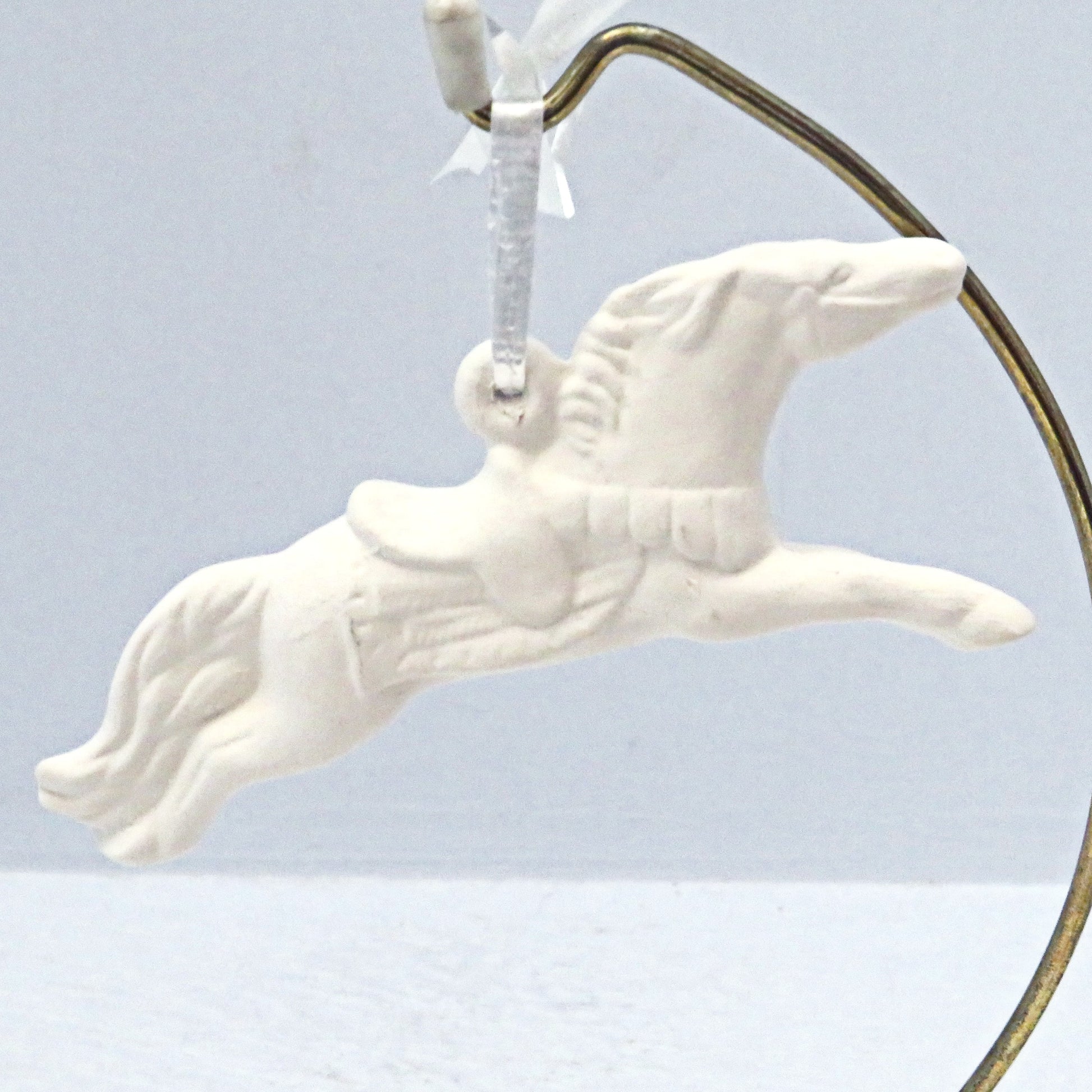 This handmade ceramic leaping carousel horse ornament is ready for you to paint or glaze and refire to cone 06 if you have a kiln available. It has a mall loop for you to put ribbon or an ornament wire. It can be used for a Christmas tree ornament or with a hanger on a shelf.