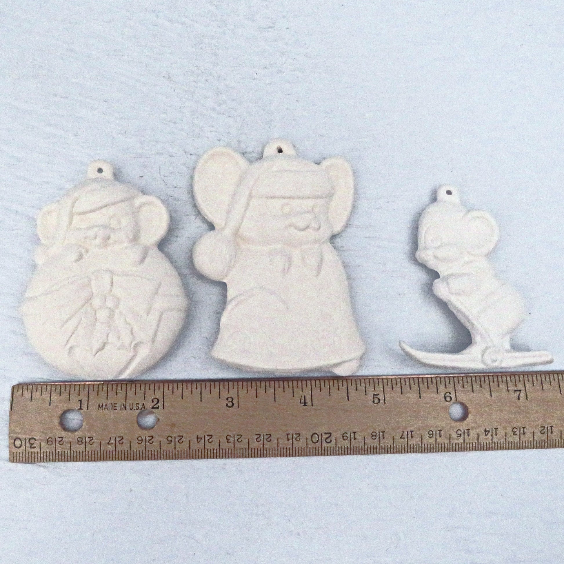 This listing consists of 3 different mouse ornaments. They were slip cast in my shop and fired to cone 04. The tallest ornament is the Mouse and the bell at 3 1/2 inches tall. They are ready to paint with acrylics or to glaze if you have access to a kiln.