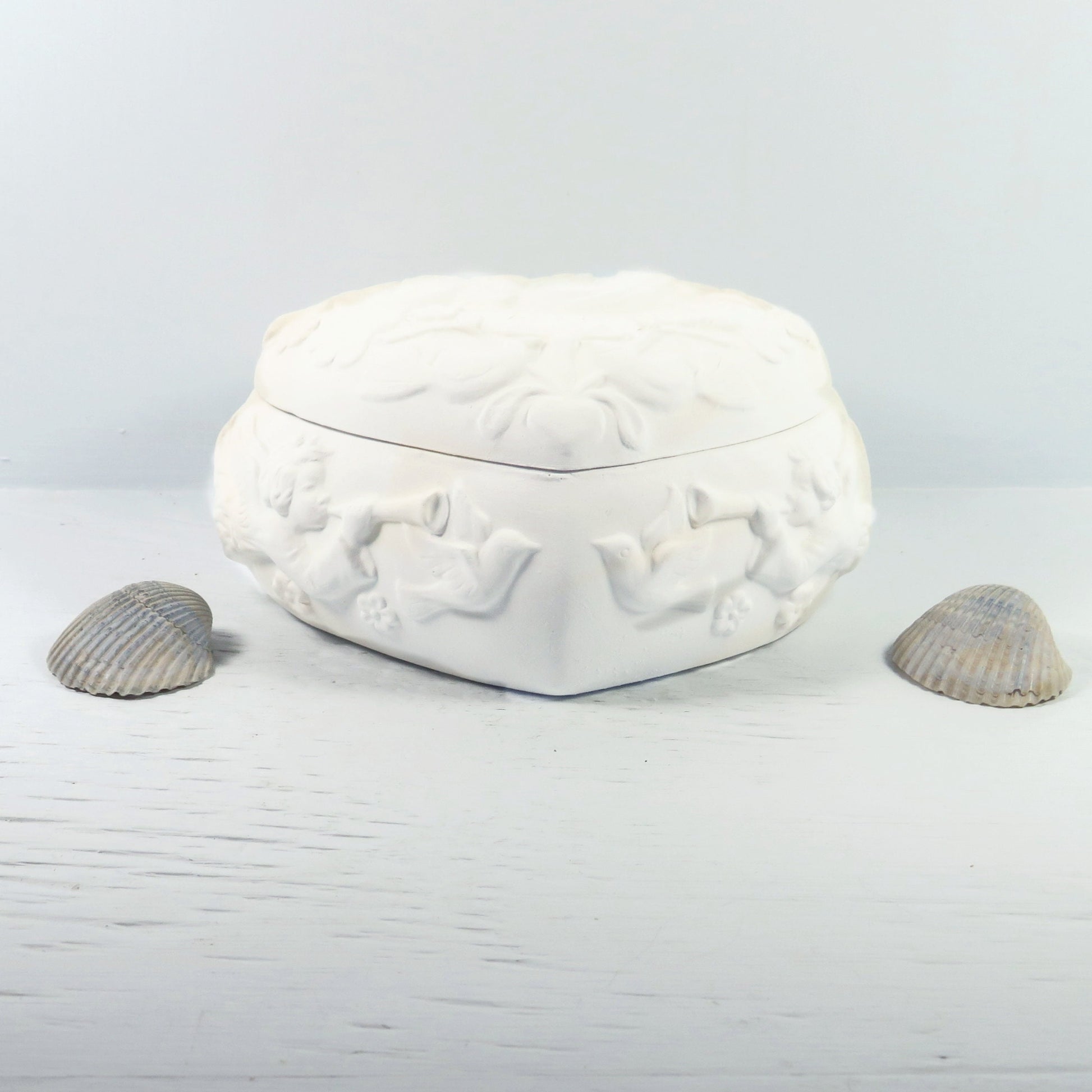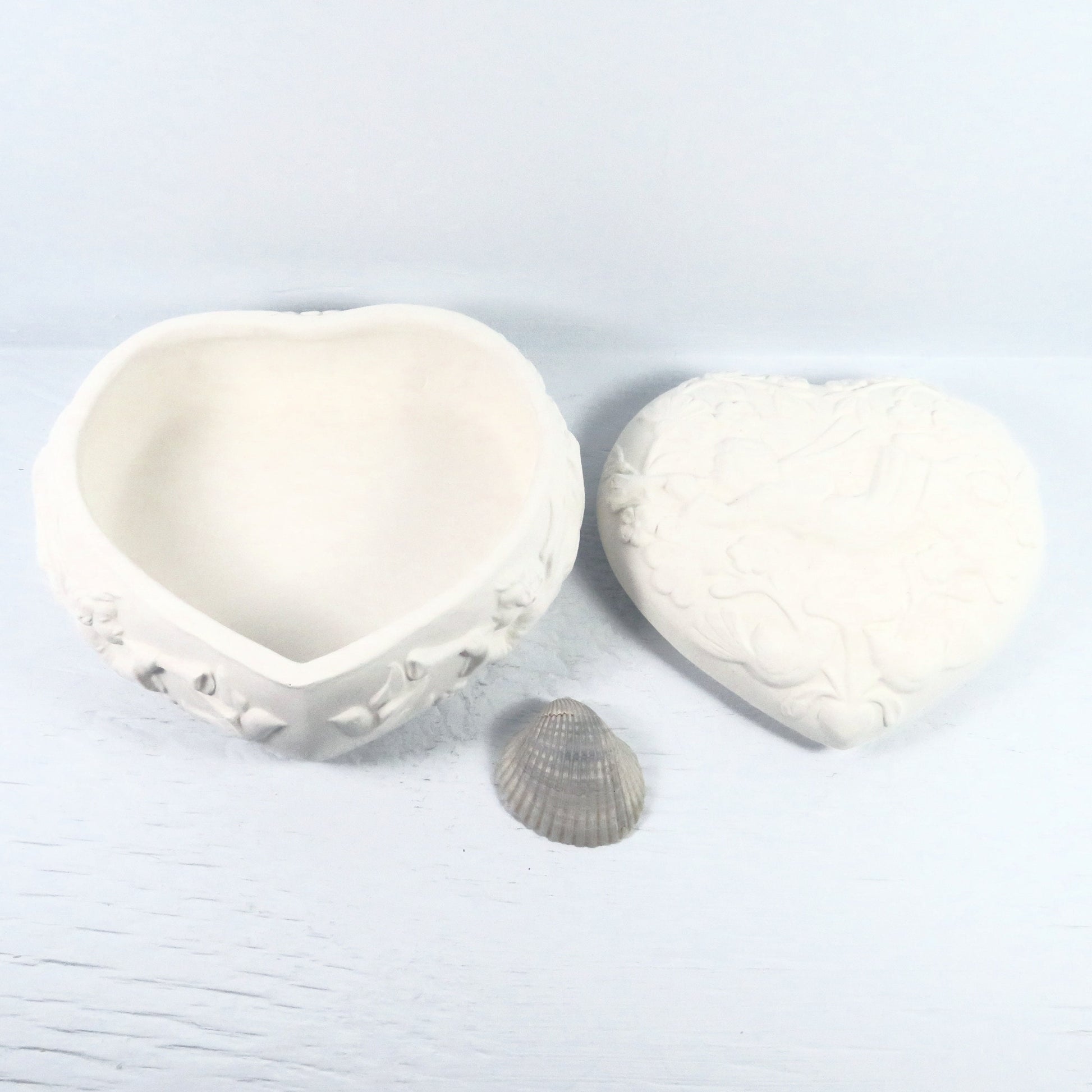 This unpainted heart shaped ceramic trinket dish is perfect for your angel decor. This covered jewelry dish was slip cast and fired to cone 04 in my studio in Texas. It is ready to paint with stains, acrylic paints, or glazed and refired.