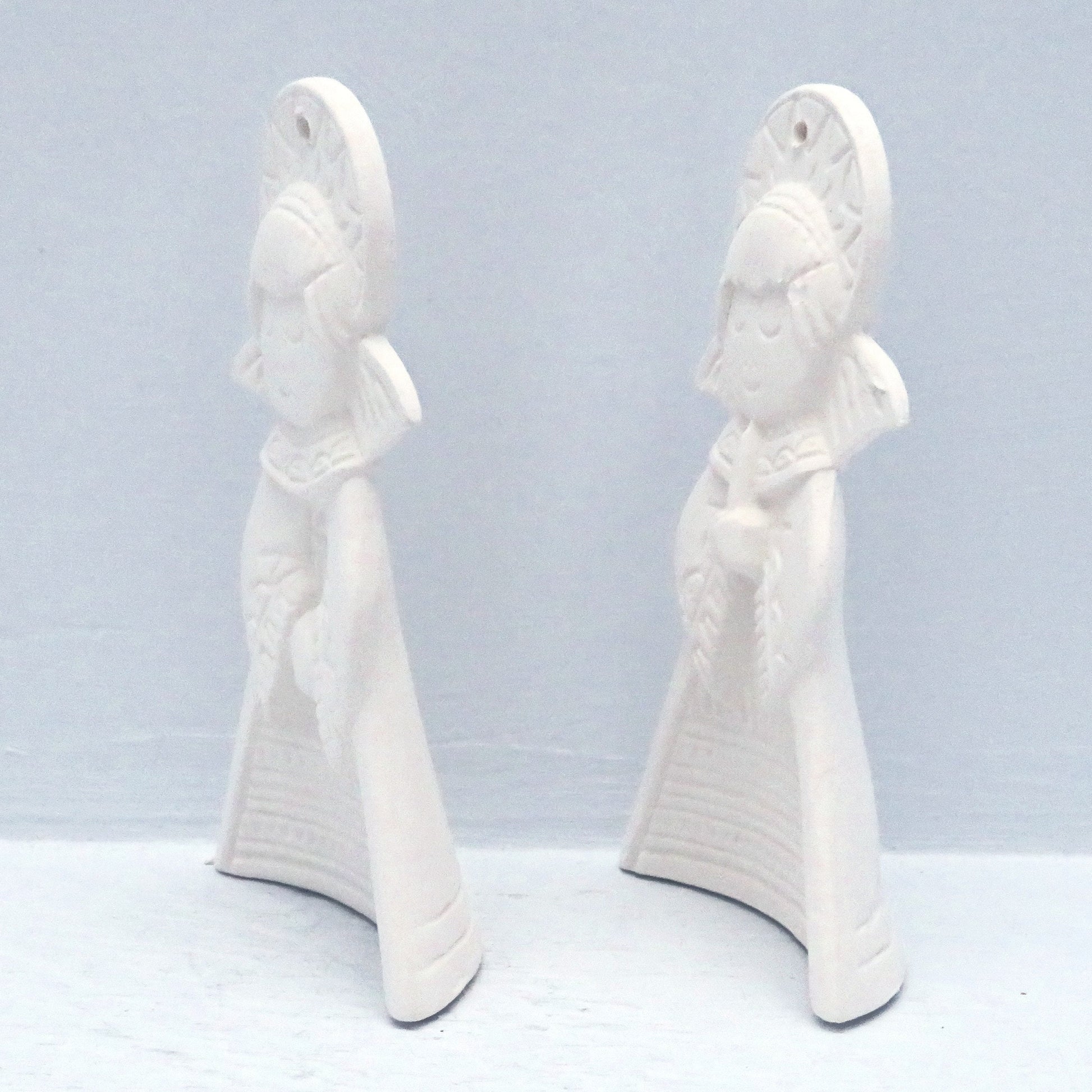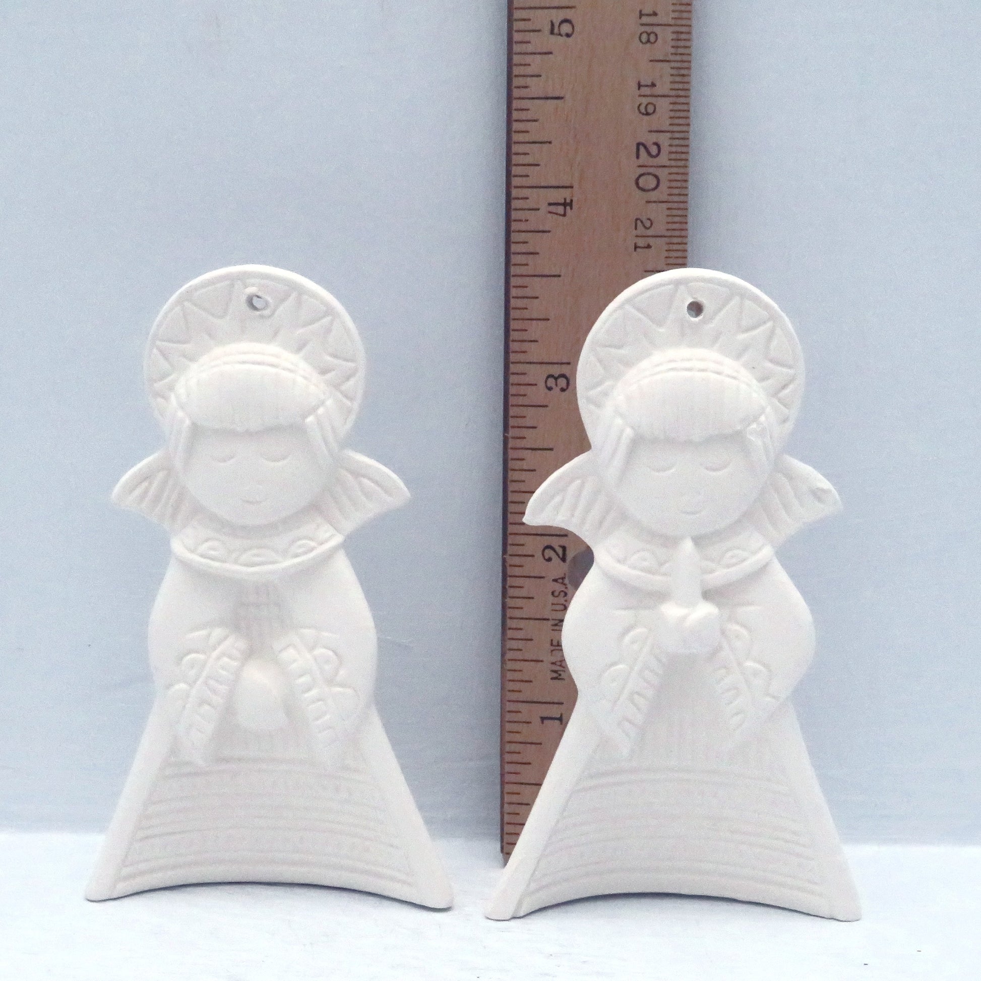 These angel decorations are 3 1/2 inches tall and 2 1/8 inches wide. There is a small hole in the halo for a Christmas tree hook or a ribbon. They were slip cast in my studio and fired to cone 04. These small angel figurines are ready to paint with acrylic paints or to glaze and refire, if you have access to a kiln. This listing consists of 2 angel ornaments. A 17 inch piece of thread is included to help you hang your Christmas tree ornaments.