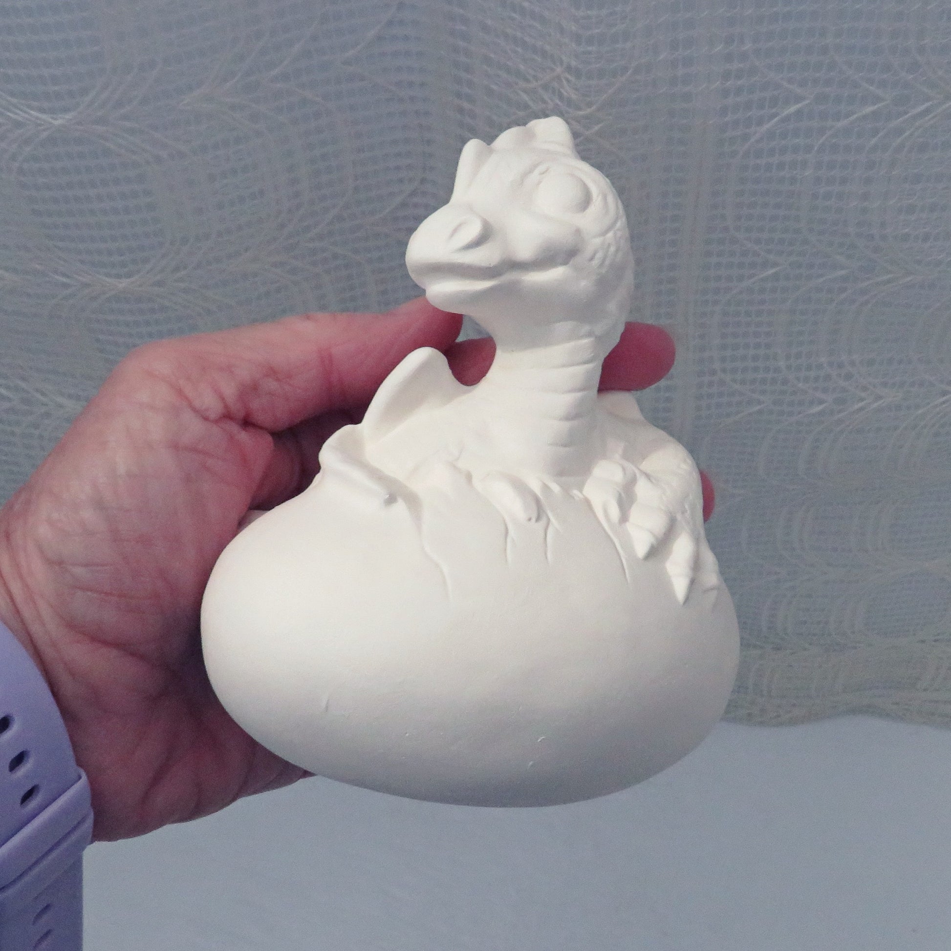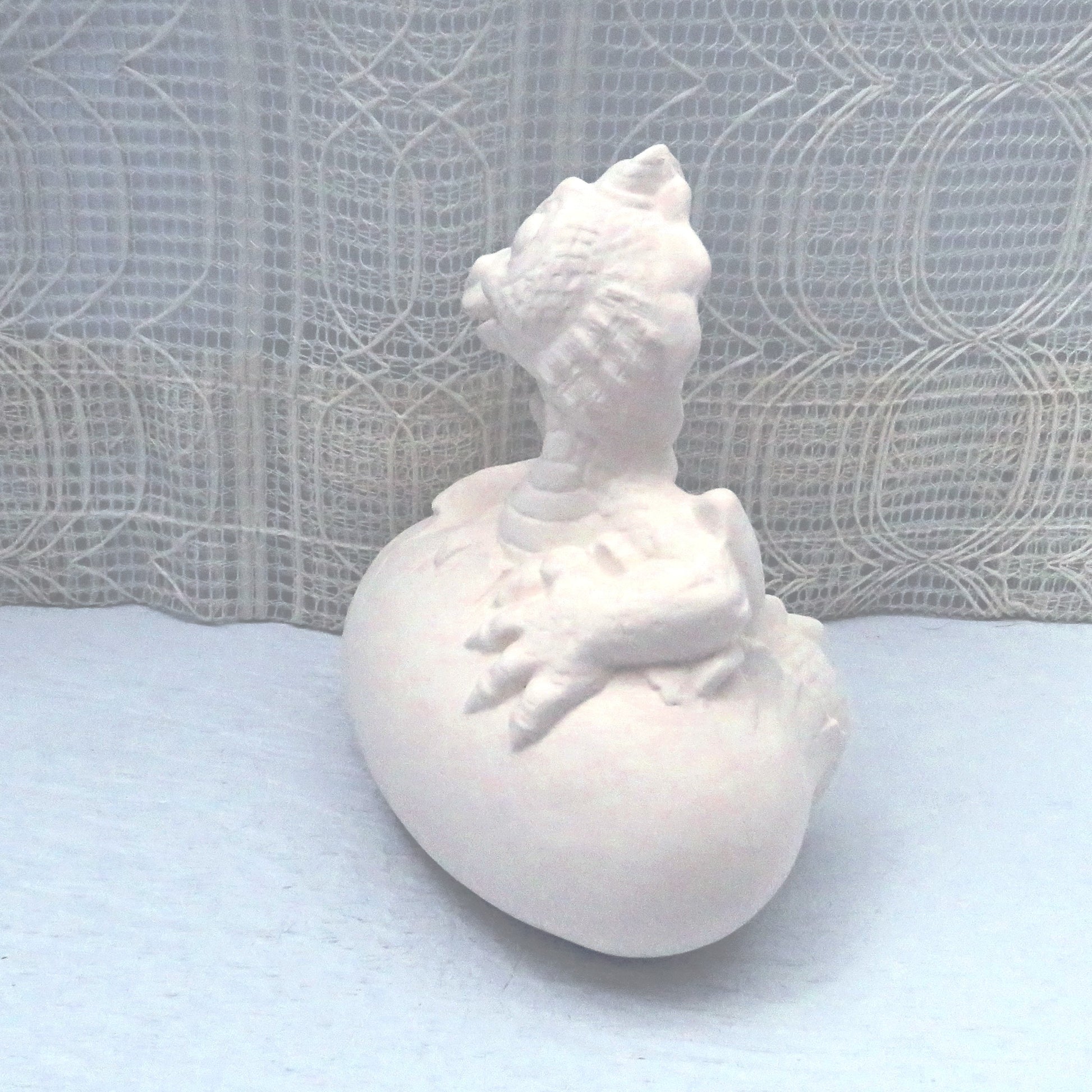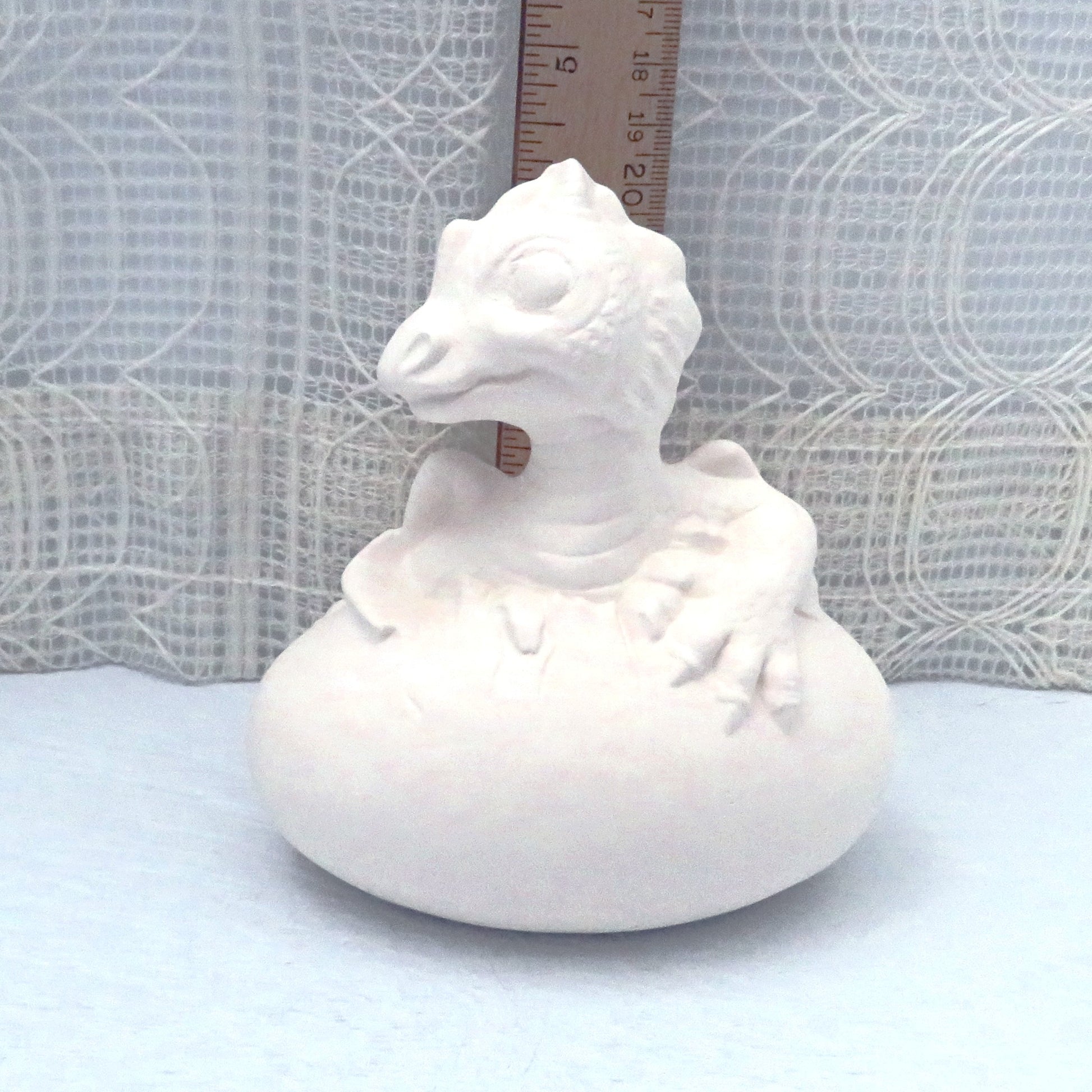 Unleash your artistic side with our Handmade Unpainted Ceramic Baby Dragon with Egg Figurine! This paintable dragon statue is the perfect addition to any dragon lover's collection. Let your imagination run wild and create a unique dragon decor or give as a special dragon gift. This ceramic dragon figurine is ready to paint with acrylics or to glaze. She has just stuck her head through the egg shell and is getting her first glimpse of the world.