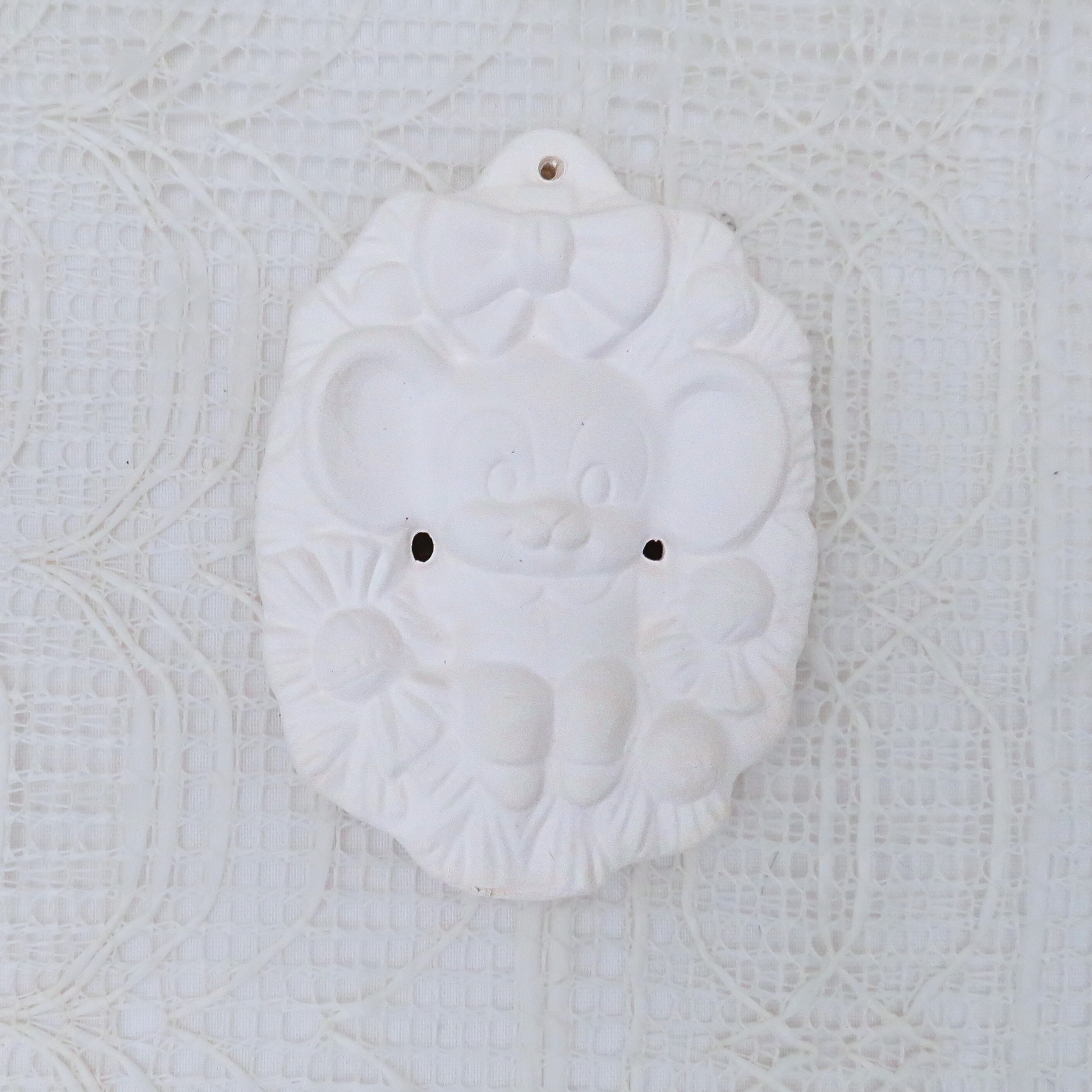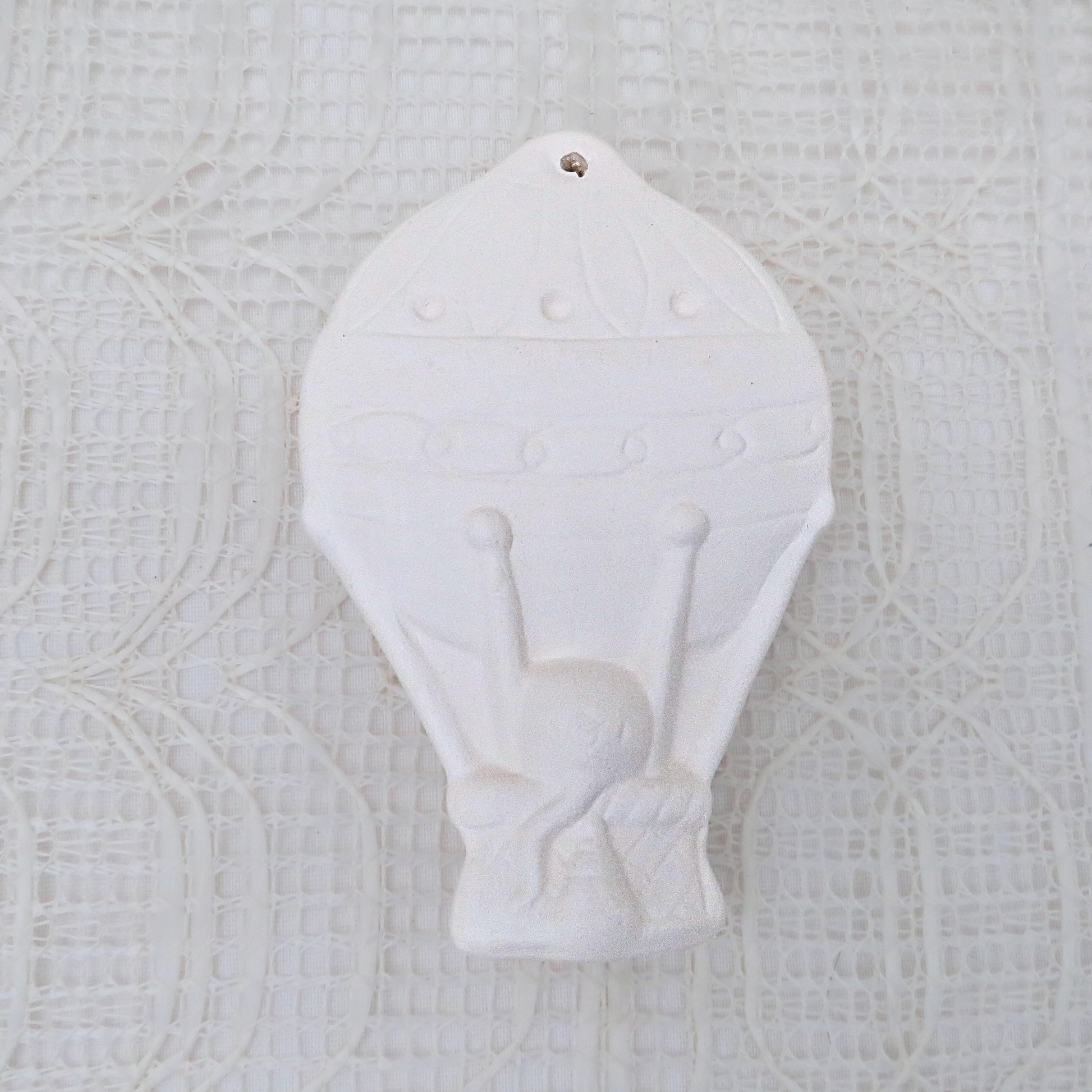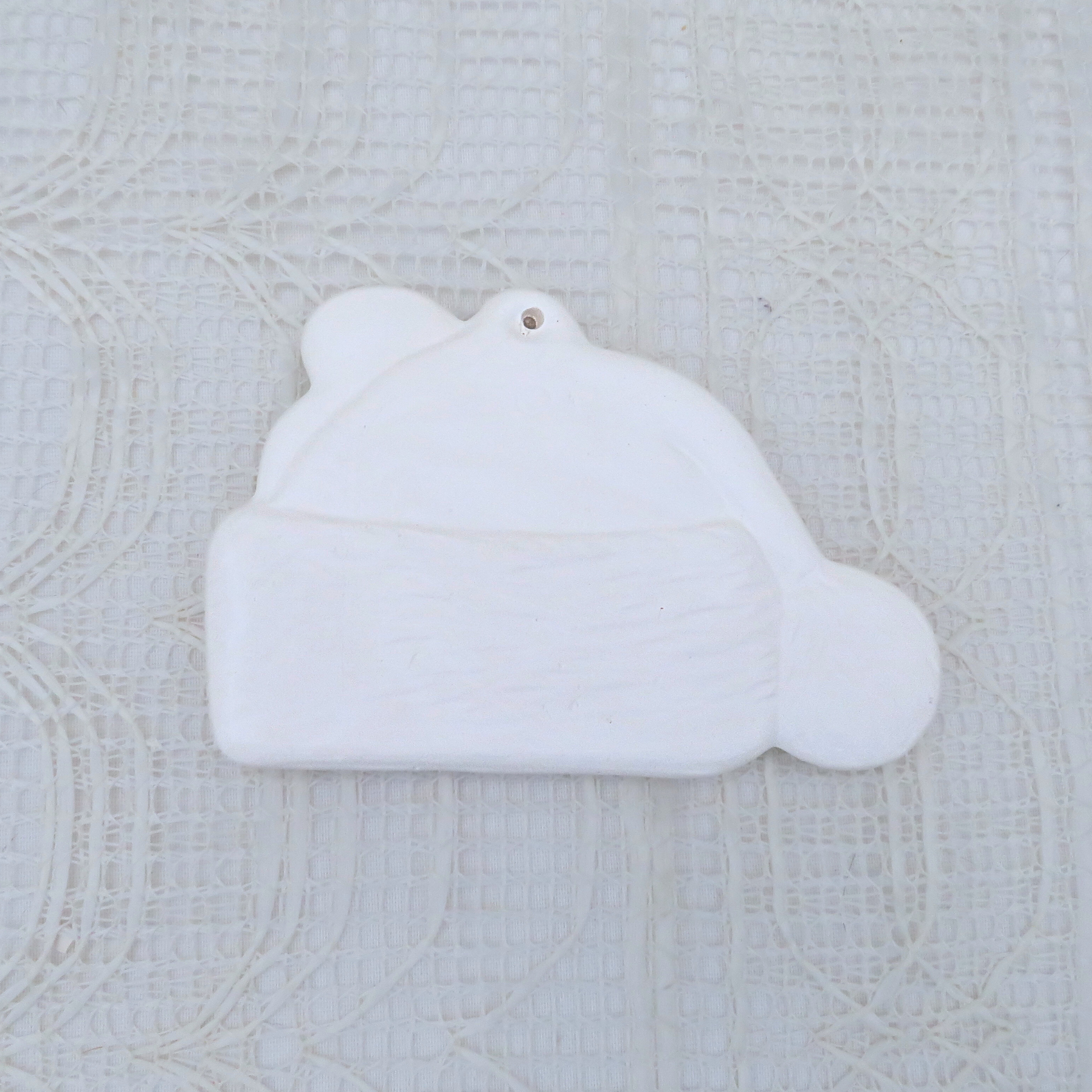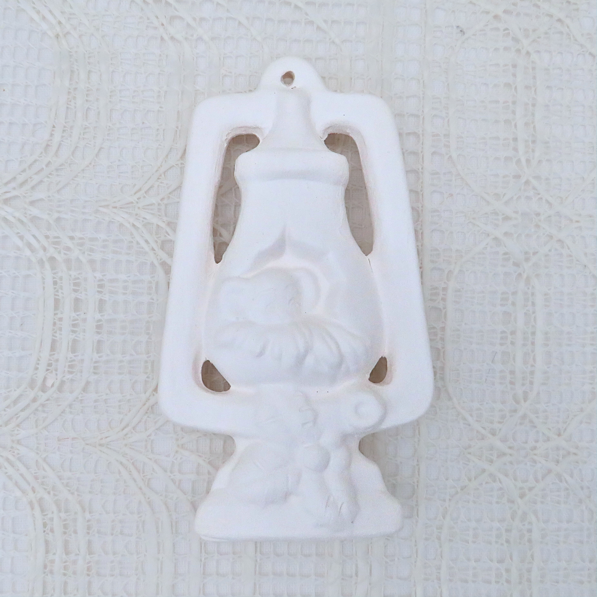 These ornaments were slip cast in my studio and fired to cone 04. They are ready to paint with acrylic paints or to glaze and refire to cone 06 if you have access to a kiln.