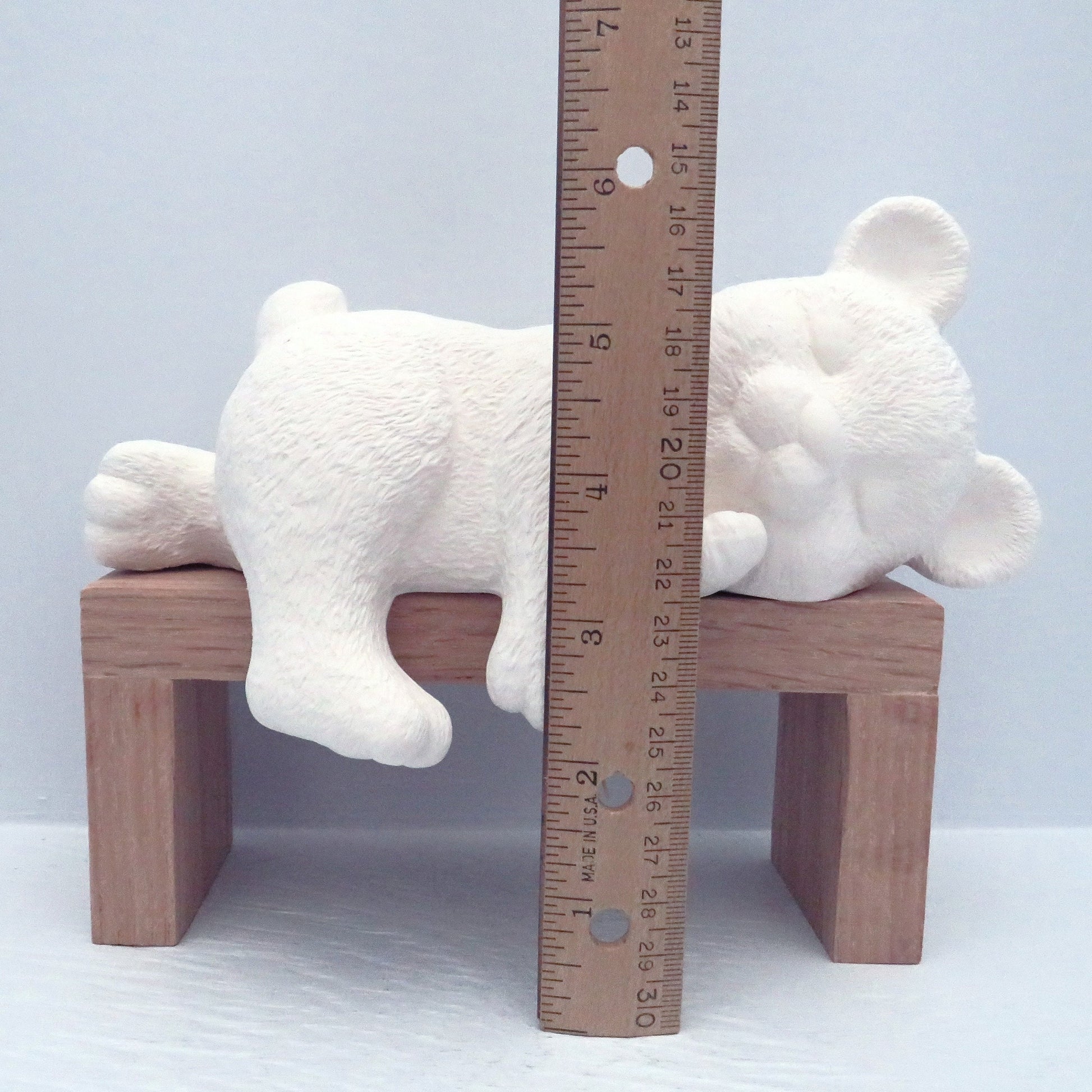 This handmade unpainted ceramic bisque sleepy shelf bear figurine was slip cast in my studio and fired to cone 04. It is ready to paint with acrylic paints or to glaze and refire, if you have access to a kiln. This paintable ceramic resting bear statue is 8 inches long and 4 inches tall. It is 3 1/2 inches deep. This bear figure needs to rest on a shelf or a pedestal. The pedestal in the above photos is not included in this listing.