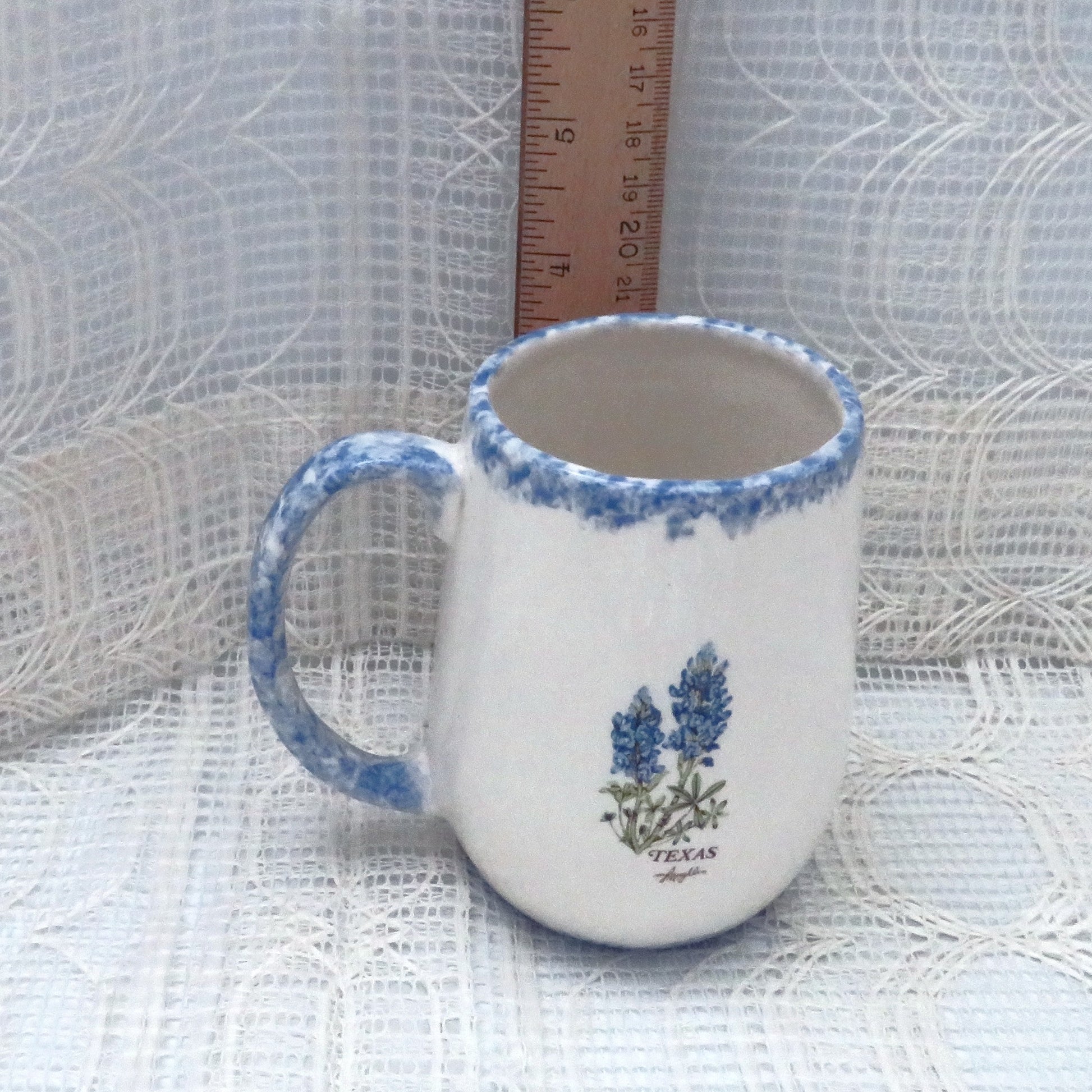 Do you love bluebonnets? If you do, you know they don't last long! But you can start your morning with Texas bluebonnets with this beautiful 10 ounce mug. This white mug is trimmed in blue and features a bluebonnet on each side.For