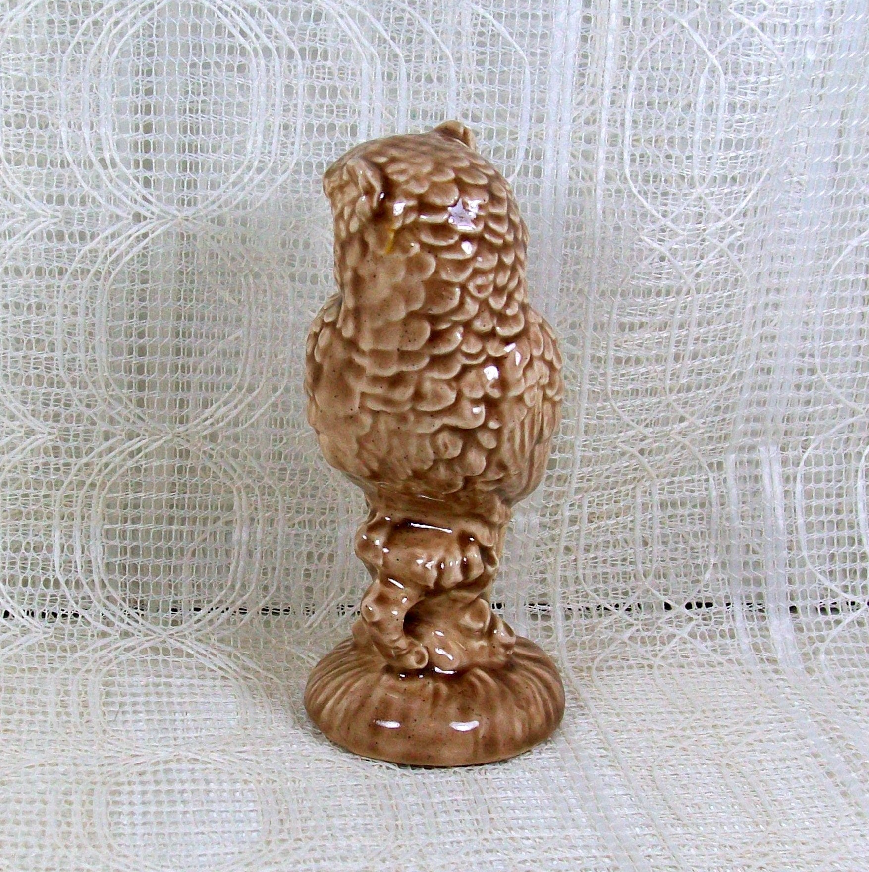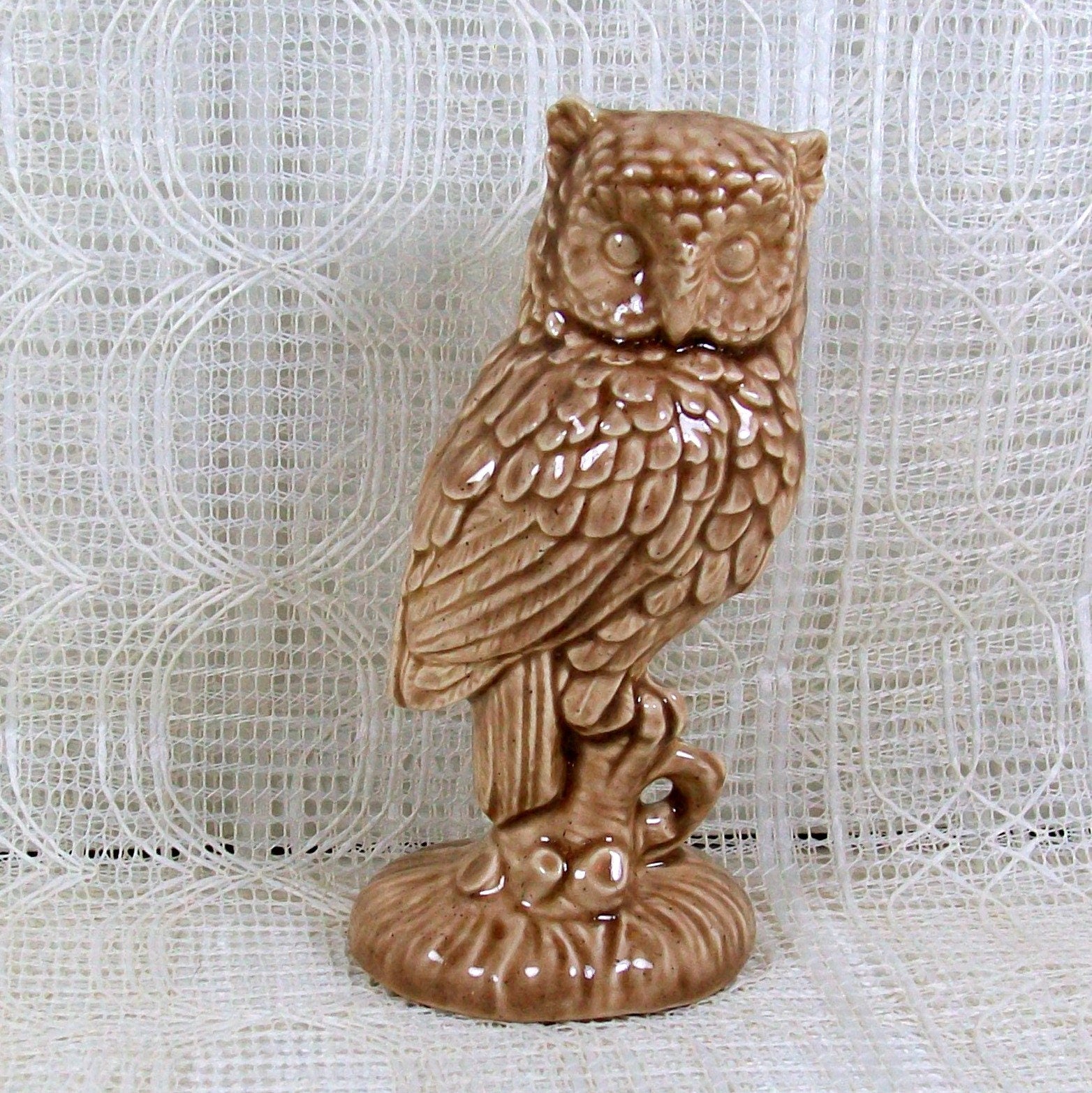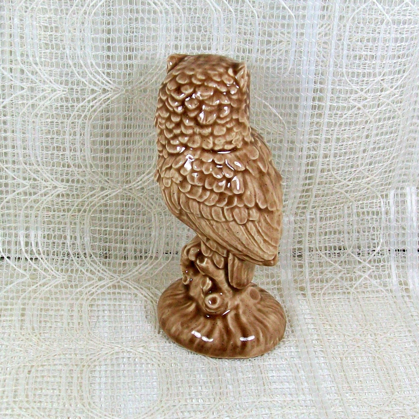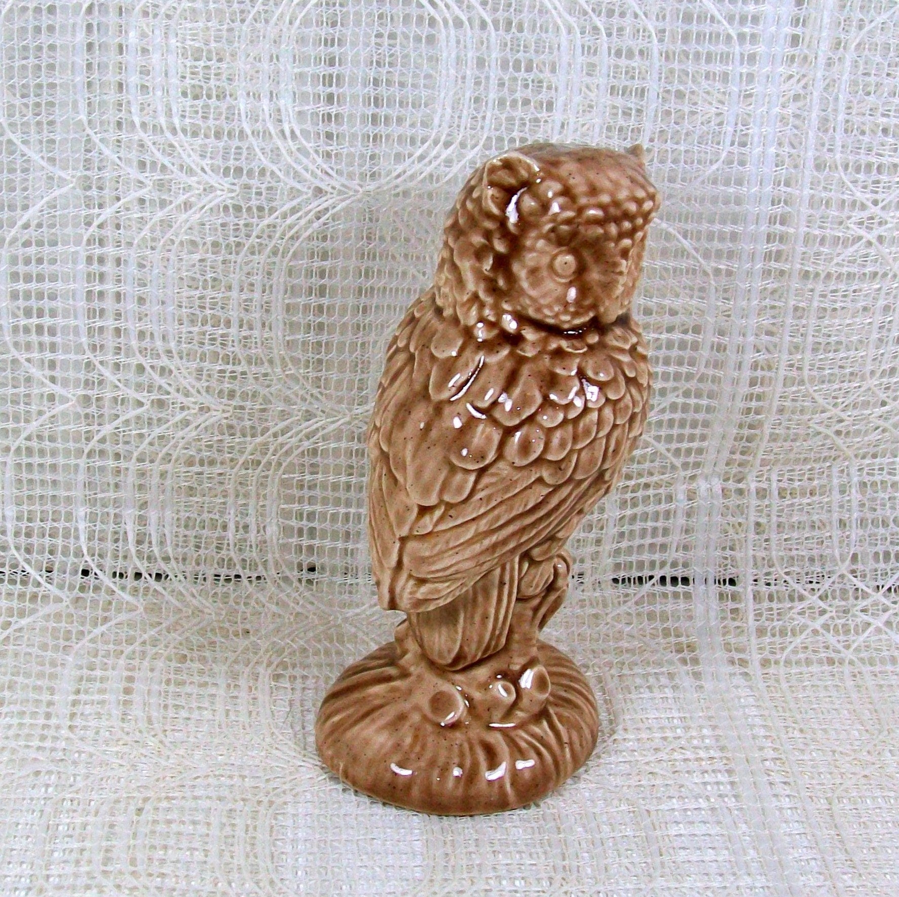 This owl figurine was slip cast and glazed in my studio. It stands 5 inches tall and is 2 1/2 inches wide. This bird figurine is posed as if it is sitting on a branch with its head turned to the right. This bird statue is glazed in a beige color and appears antiqued with brown. The glaze has a glossy finish, giving this ceramic bird a shiny appearance.