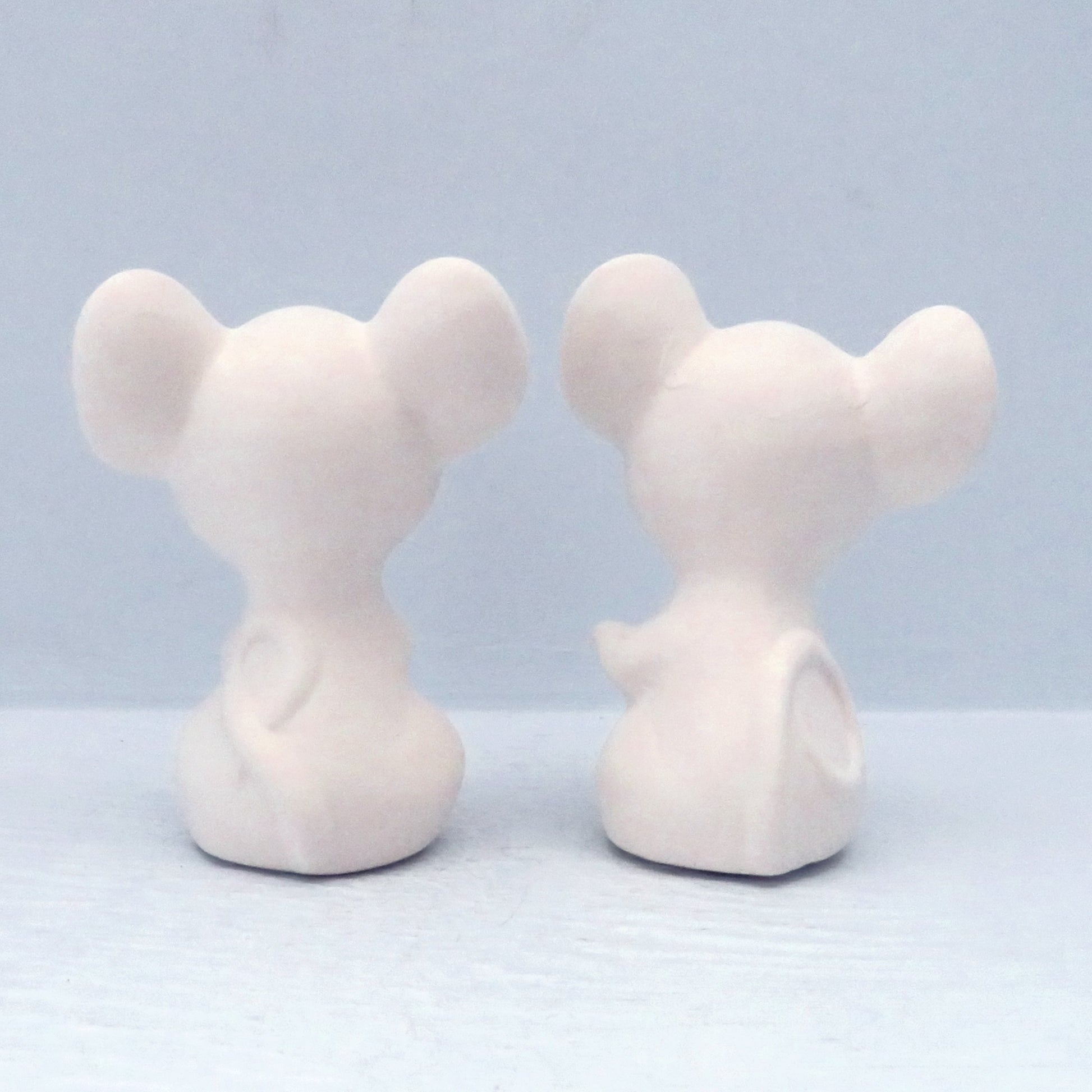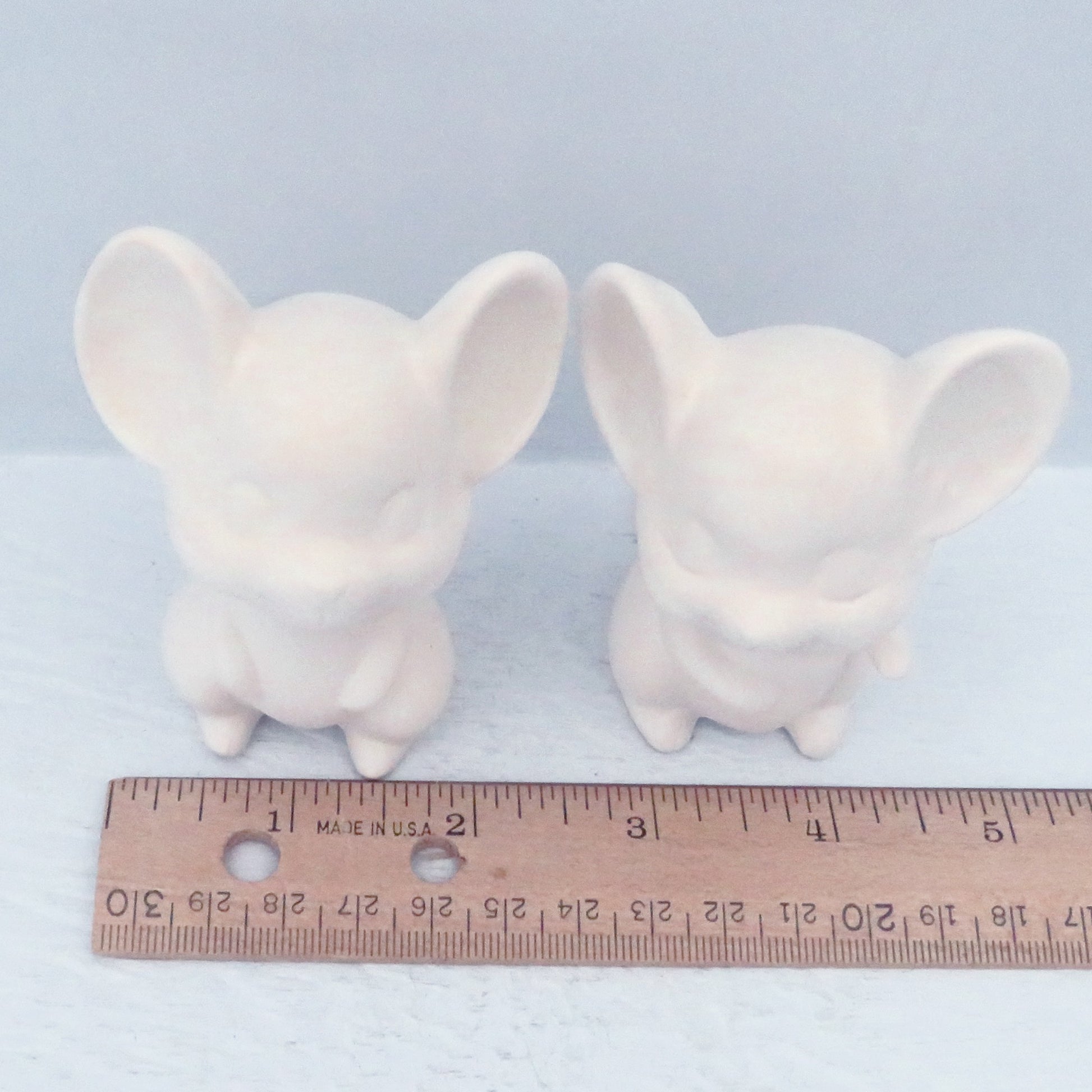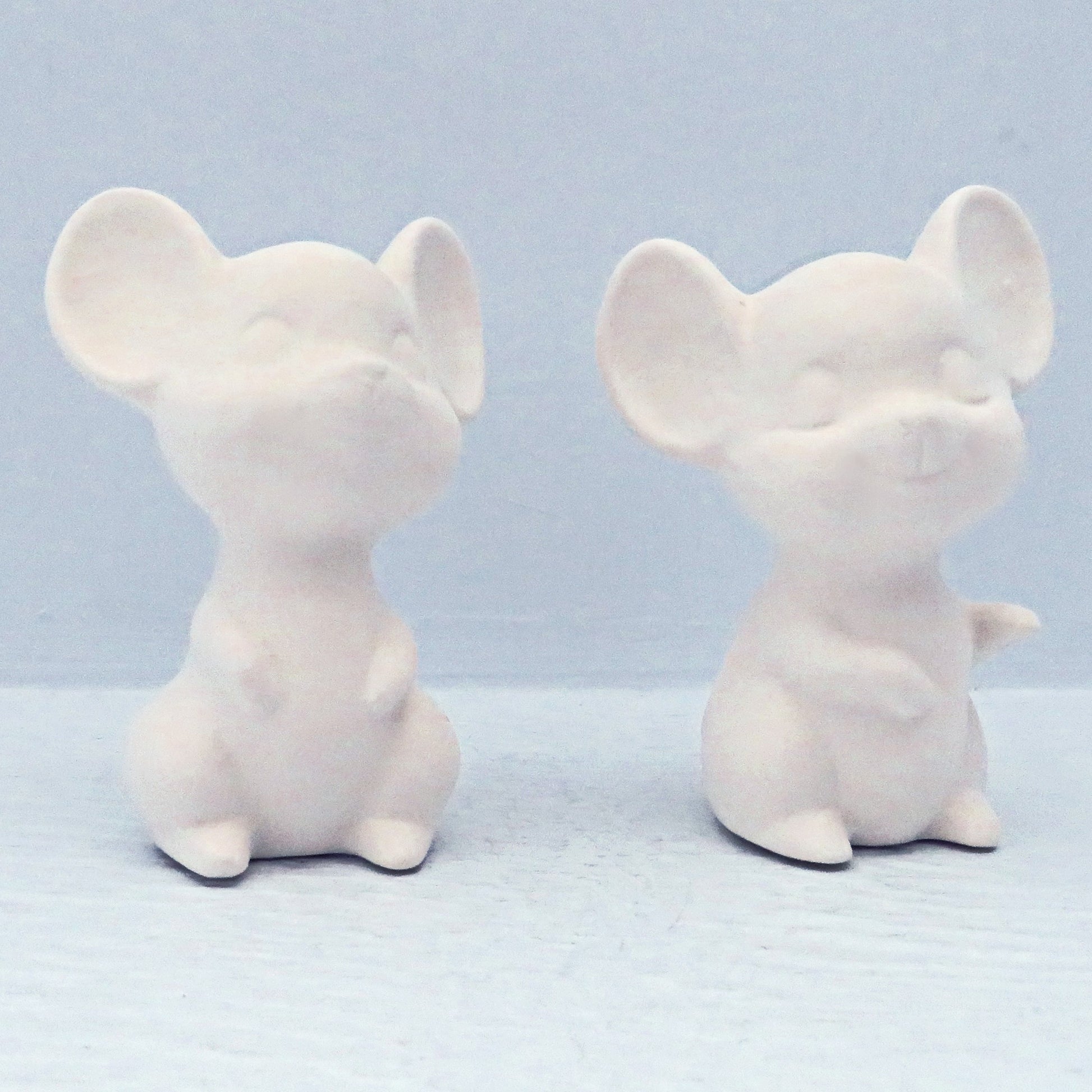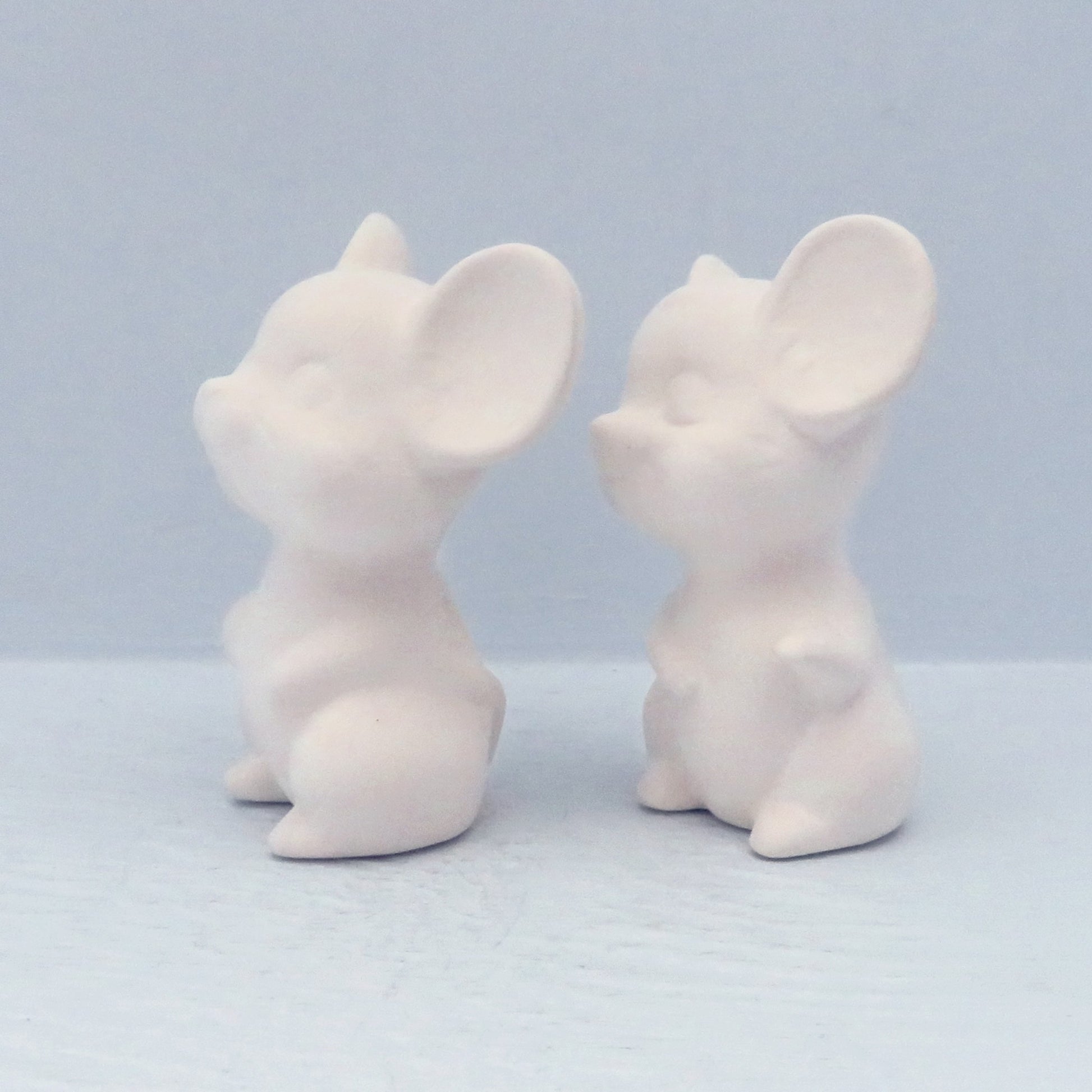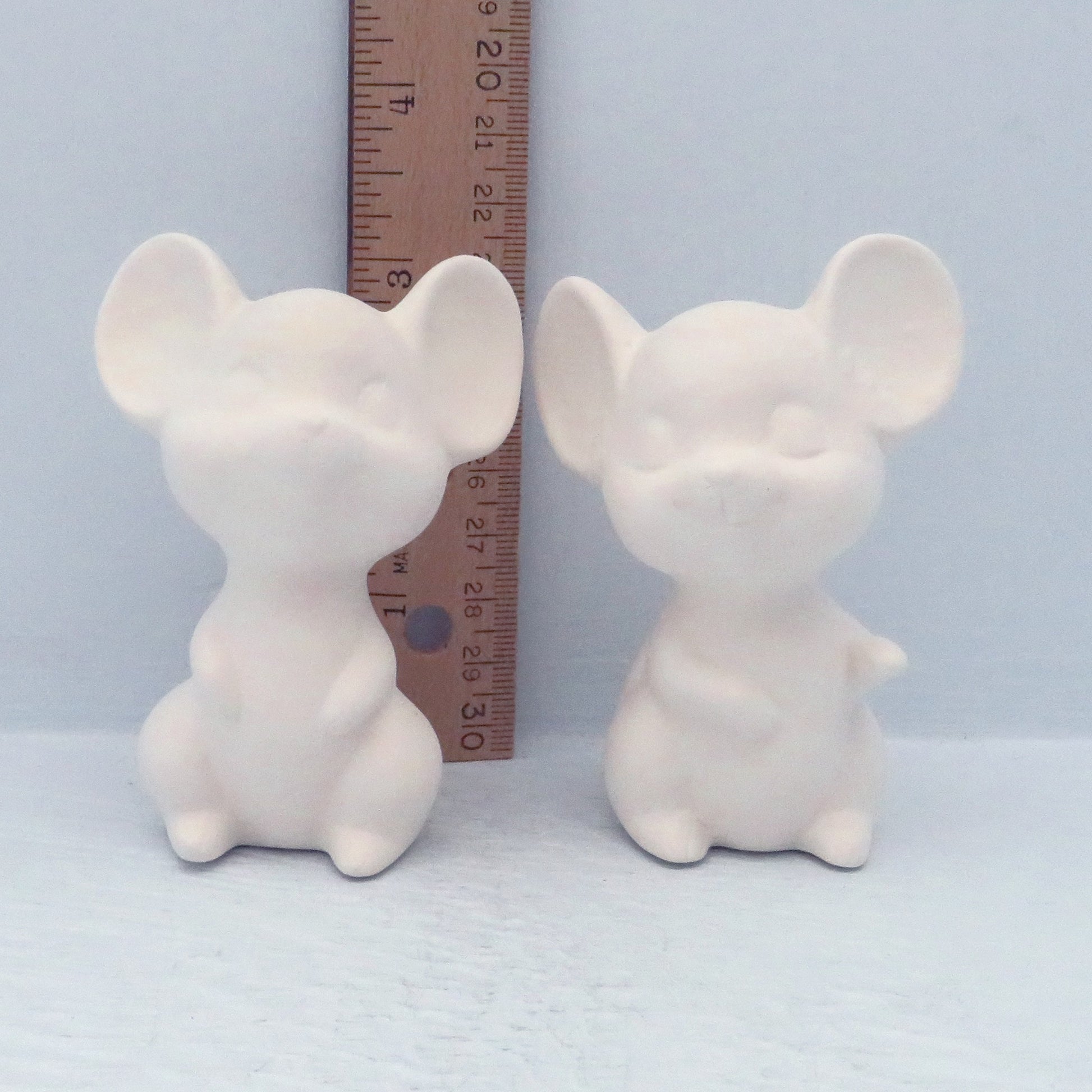 These mouse decorations were slip cast and fired in my kiln to cone .04. They are ready to be painted with acrylic paints or glazed and fired if you have access to a kiln. Each mouse is approximately 3 1/4 inches tall and 2 1/2 inches wide at the ears. This listing consists of 2 mice.