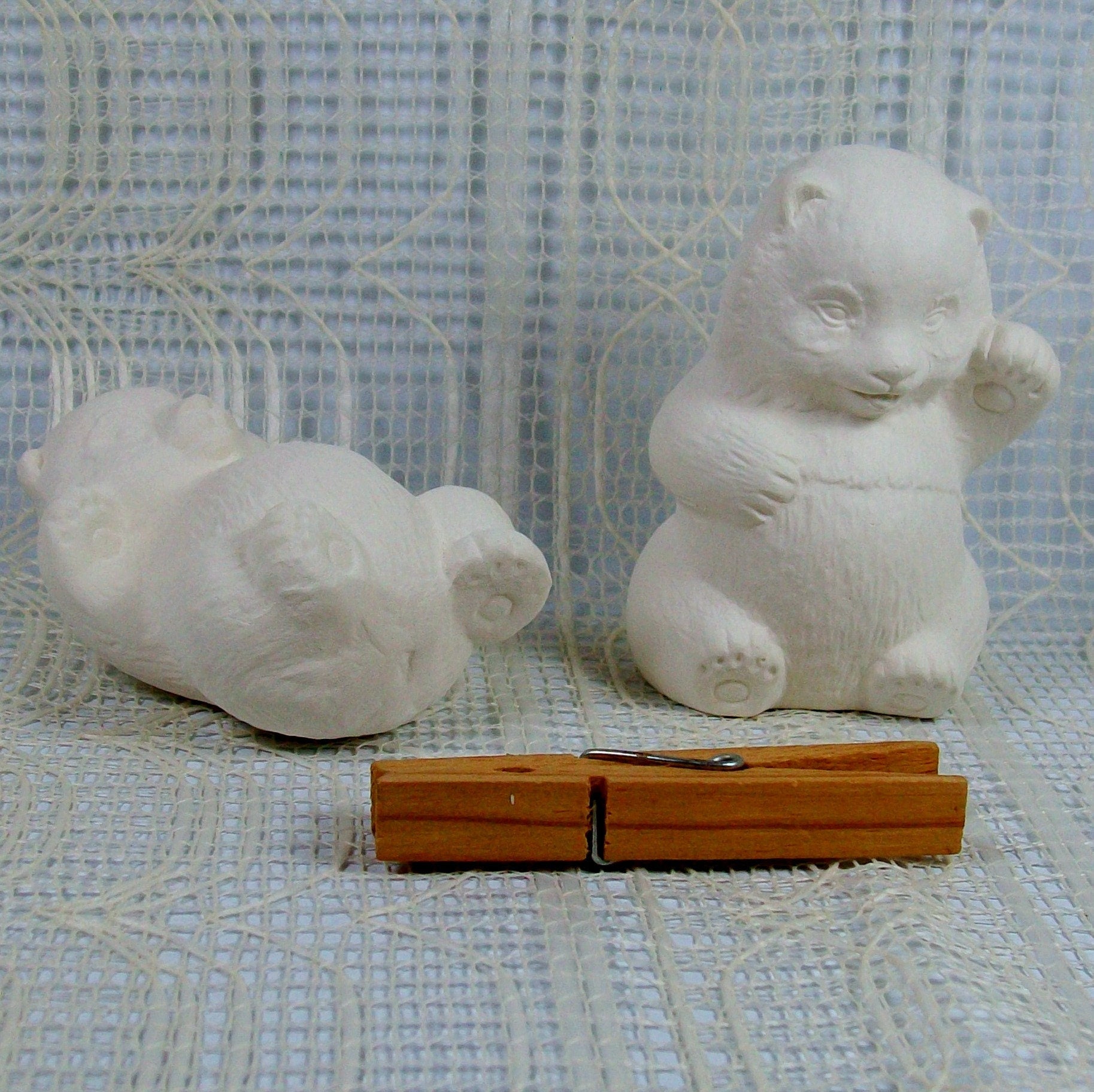 These adorable ready to paint ceramic panda figurines will bring a smile to your face. These unpainted ceramic pandas look ready to play, with one sitting up and waving a paw, and the other frolicking on his back.