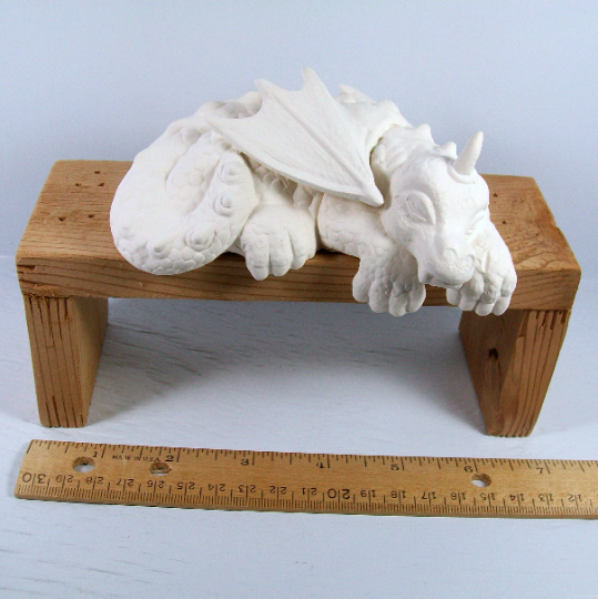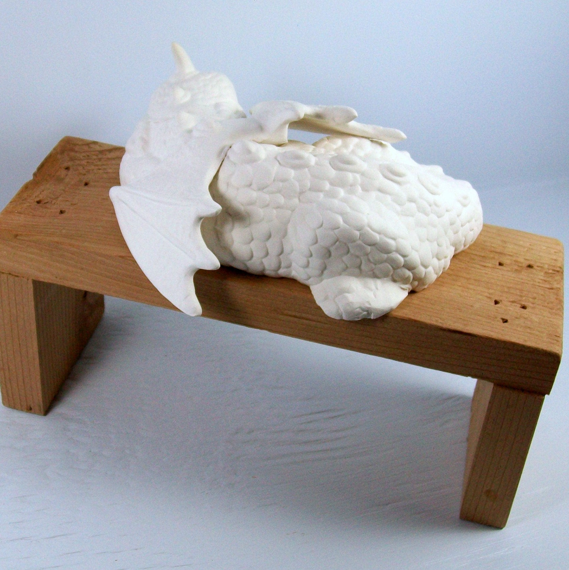 This handmade ceramic bisque dragon statue will be so to fun work with . This dragon figurine is lying on a bench with her feet hanging off and her wings lying flat across her back.
