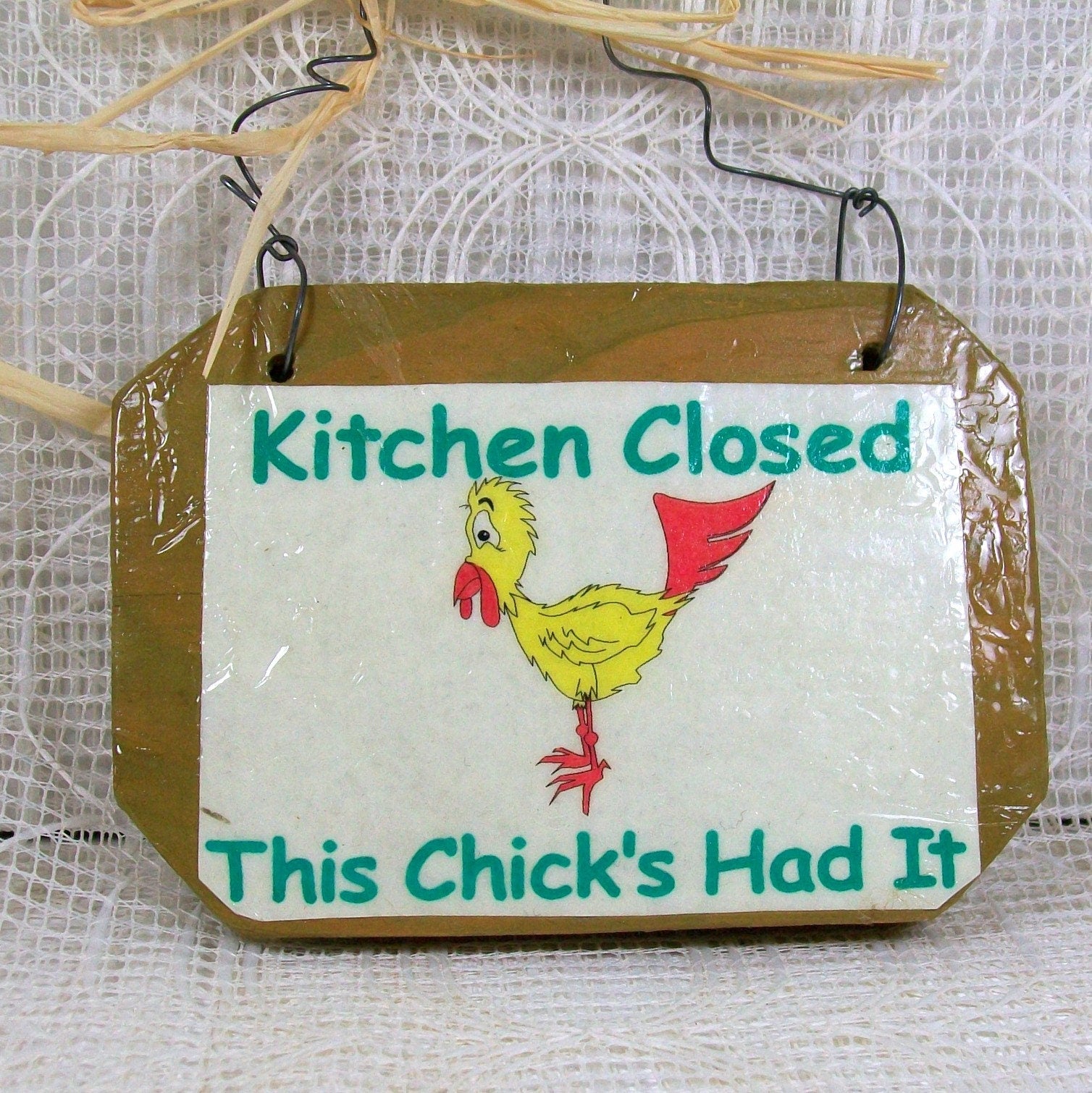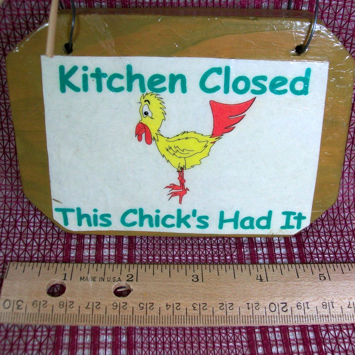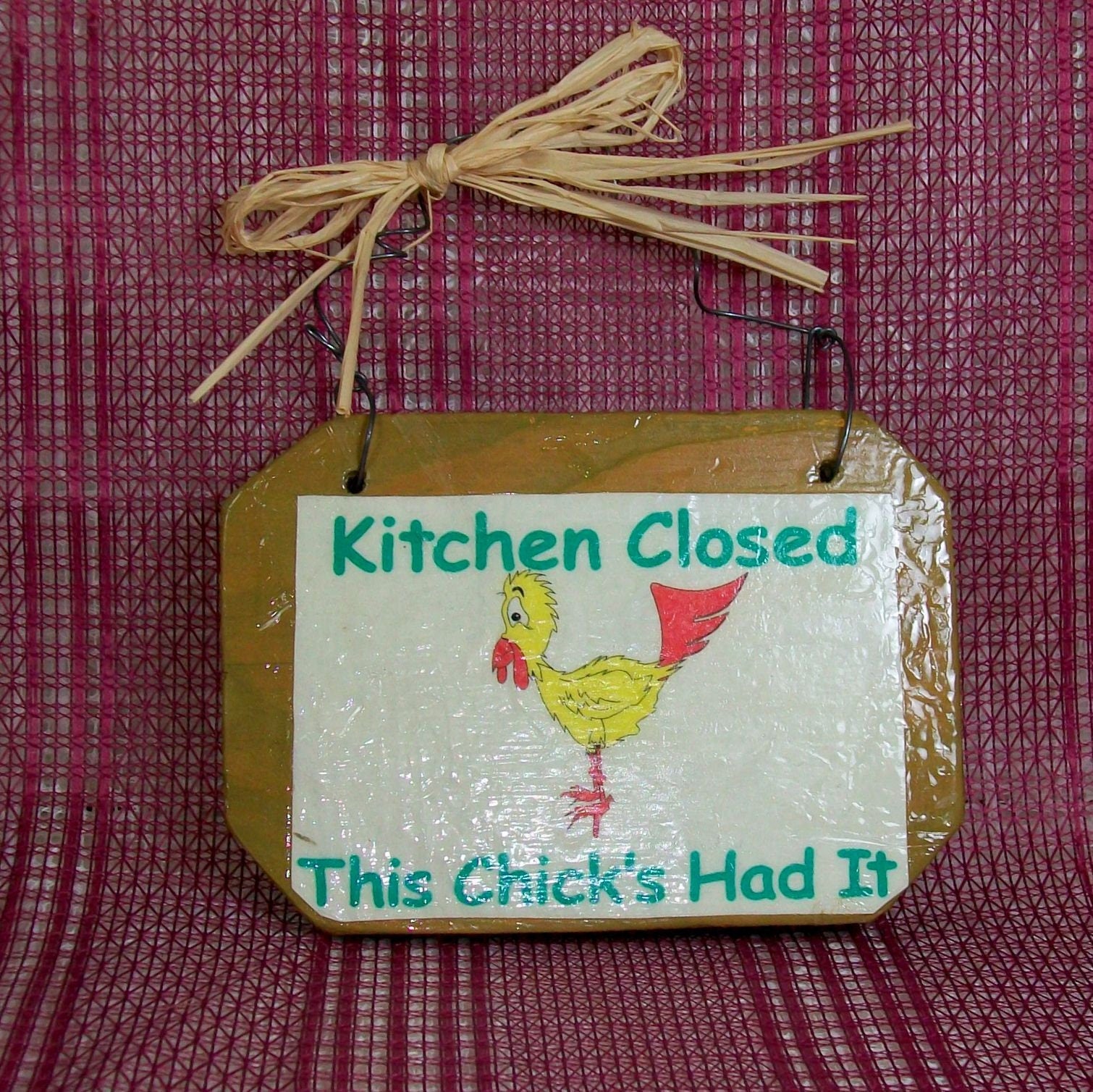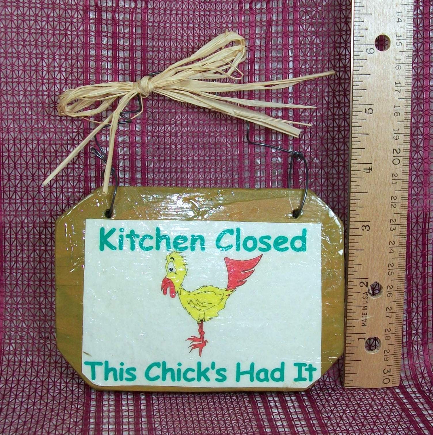 This cute kitchen sign features a harried appearing yellow chicken with an orange tail, orange feet, and orange beak. Above the chicken are the words "Kitchen Closed." Below the chicken are the words "This Chick's Had It." The letters are printed in a blueish green. This piece has a glossy finish due to the decoupage medium.