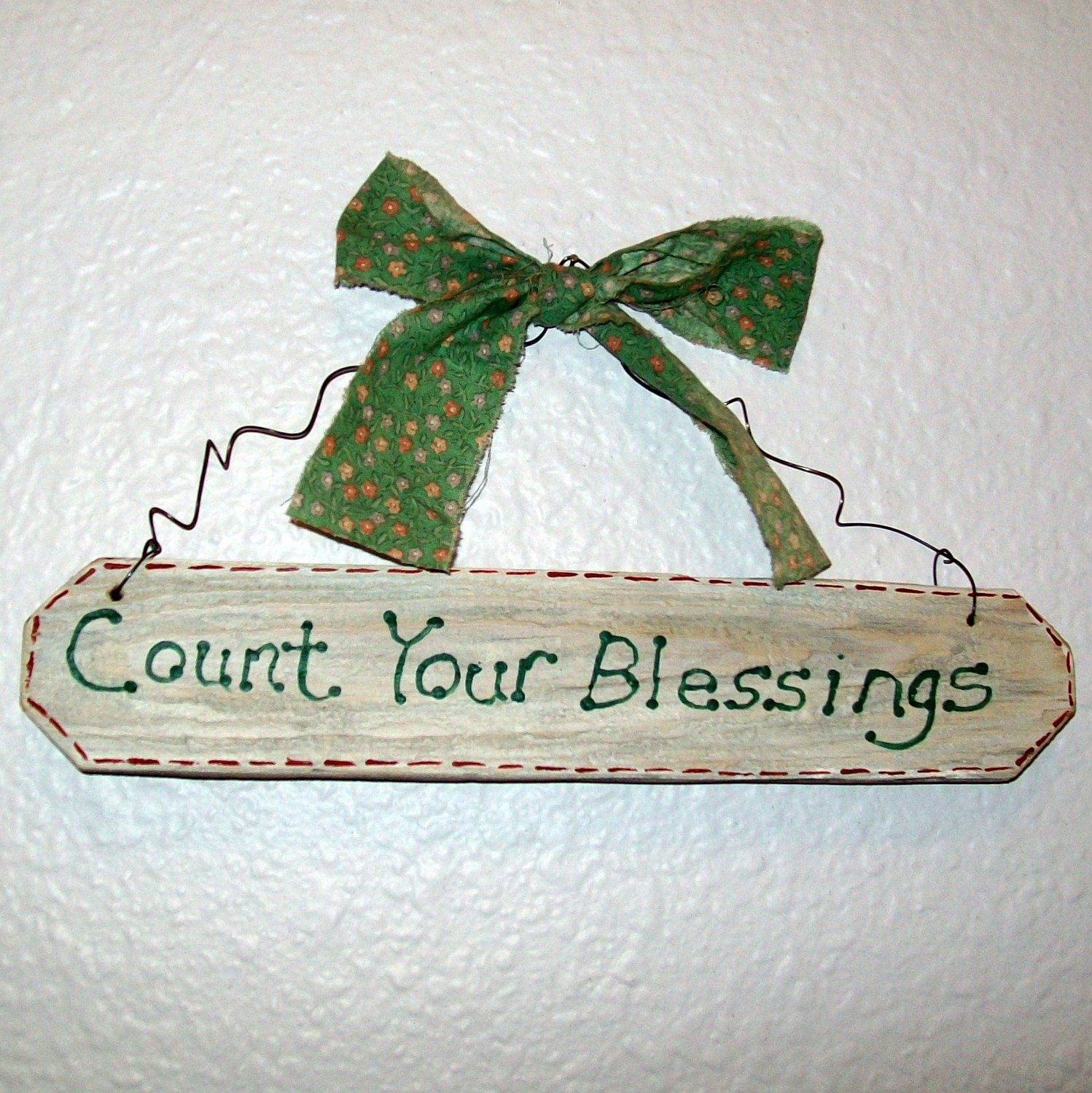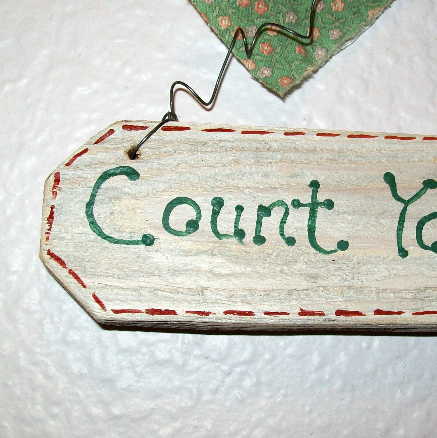 This country wall decoration was made from a left over piece of wood from a construction project. It was stained and painted white. The words "Count Your Blessings" are hand painted in a tole style with light green paint, The wooden sign is edged with small burgundy lines. 2 holes were drilled in the top and wire was attached and coiled for a hanger. A green fabric bow accents the wire.