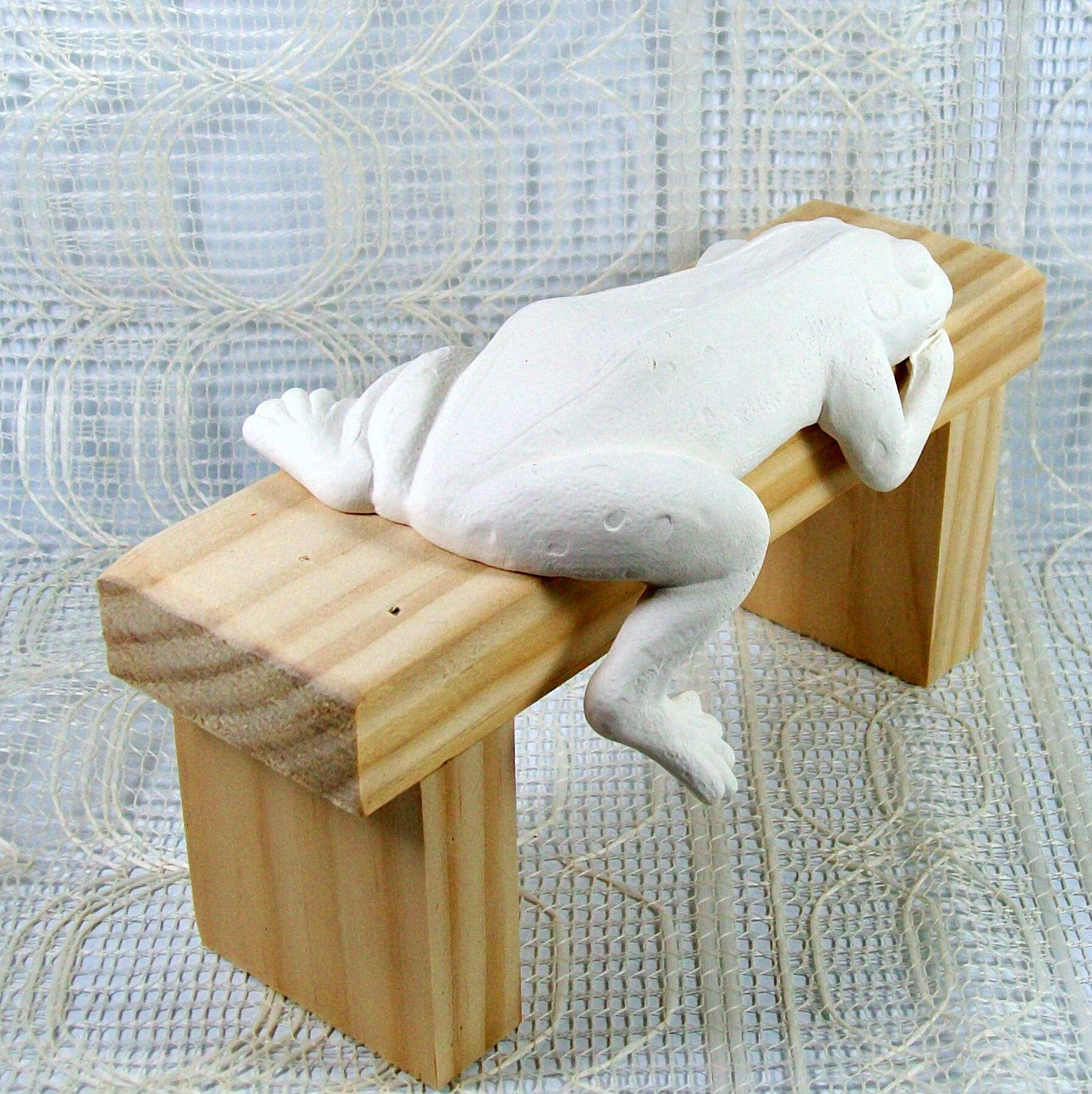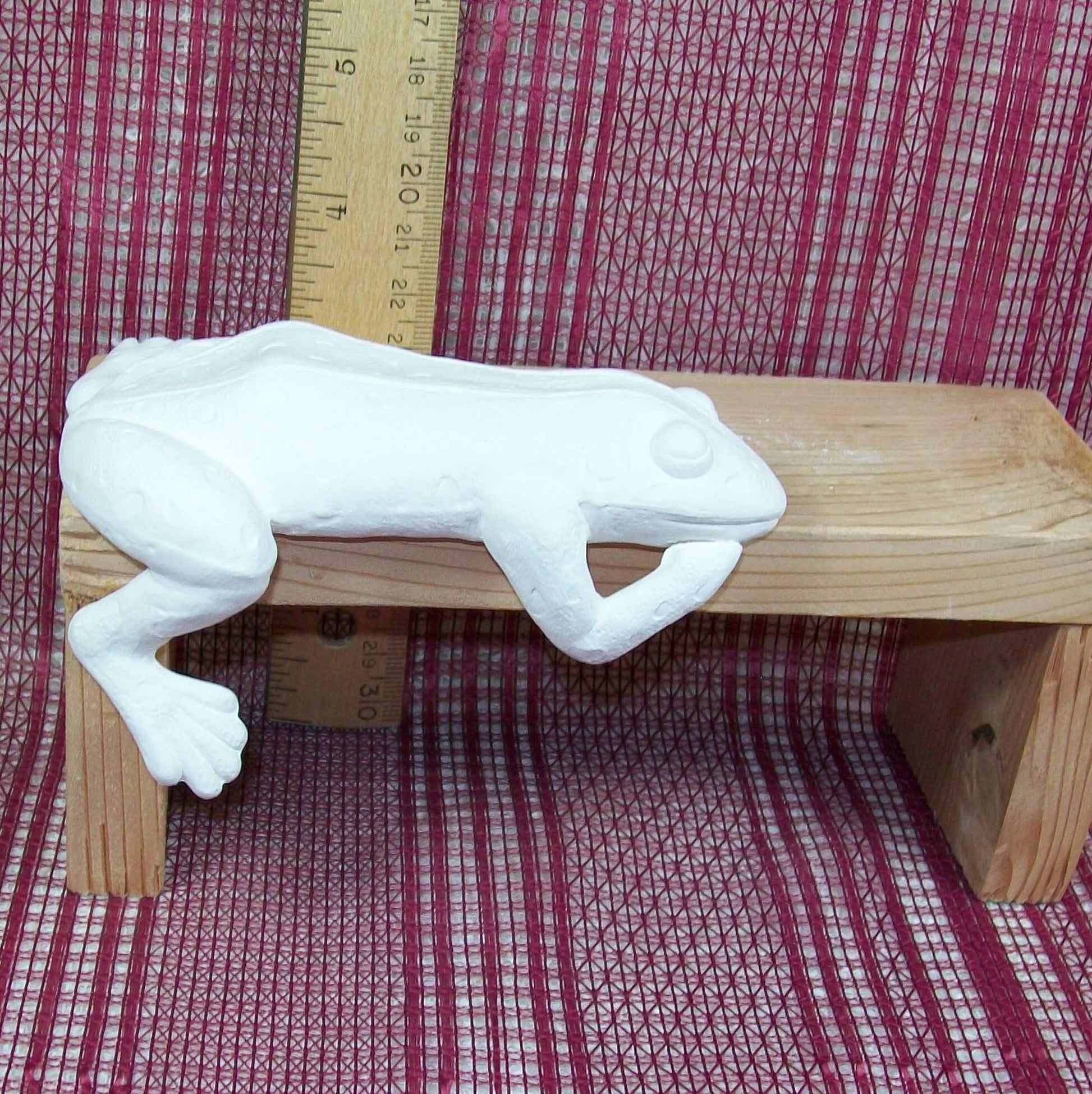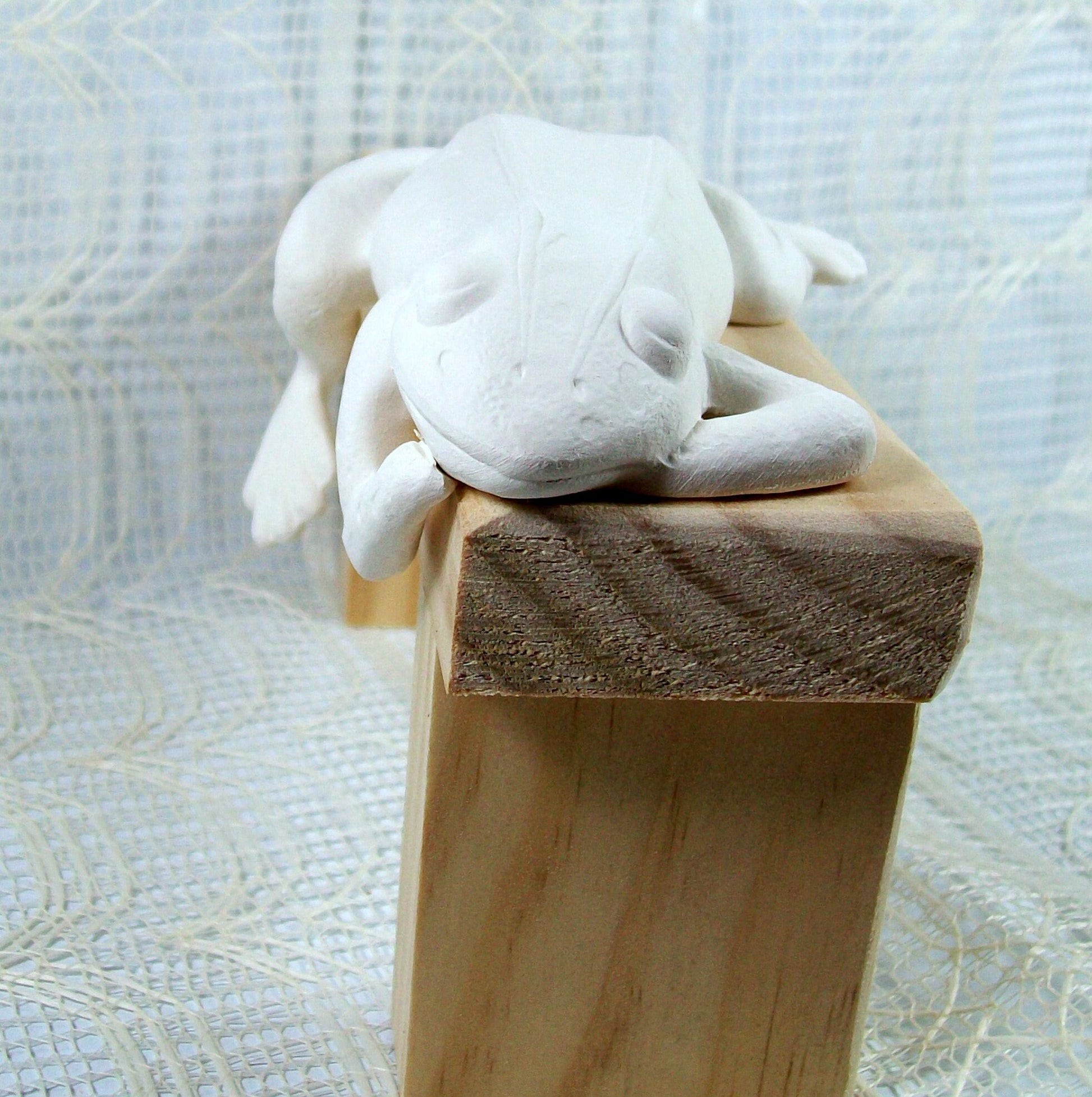You will love painting this adorable shelf frog figurine. This paintable ceramic frog statue is posed lying down on the shelf with right hind leg and right front elbow hanging off the shelf. The front foot is placed under the frog's chin.
