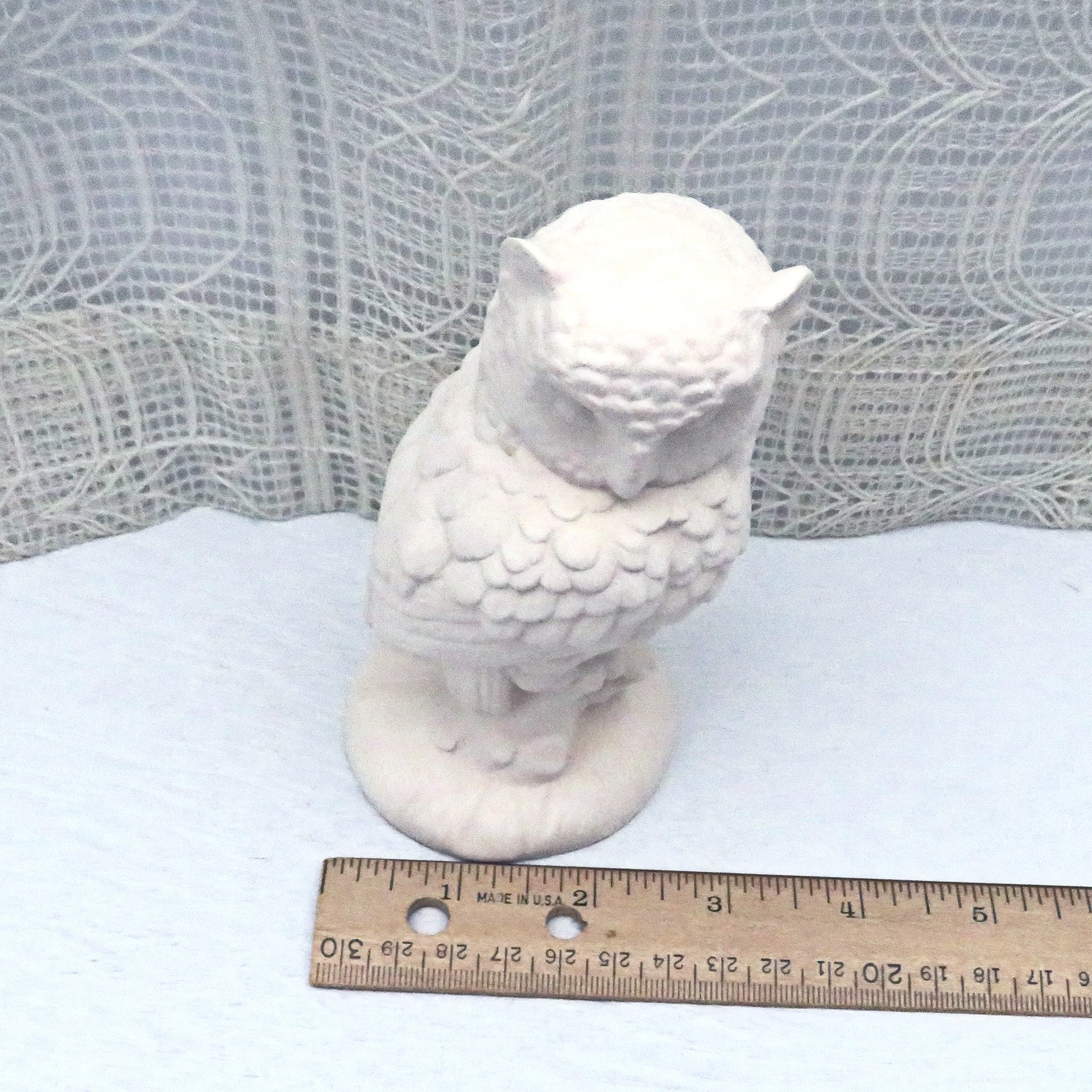 This handmade ceramic bisque owl figurine was slip cast and fired to cone .04. This ready to paint owl statue is 5 inches tall and 2 1/2 inches wide. This paintable ceramic owl shows a lot of detail on the body and head and can be painted with acrylic paints or glazed and fired to cone.06 if you have access to a kiln.