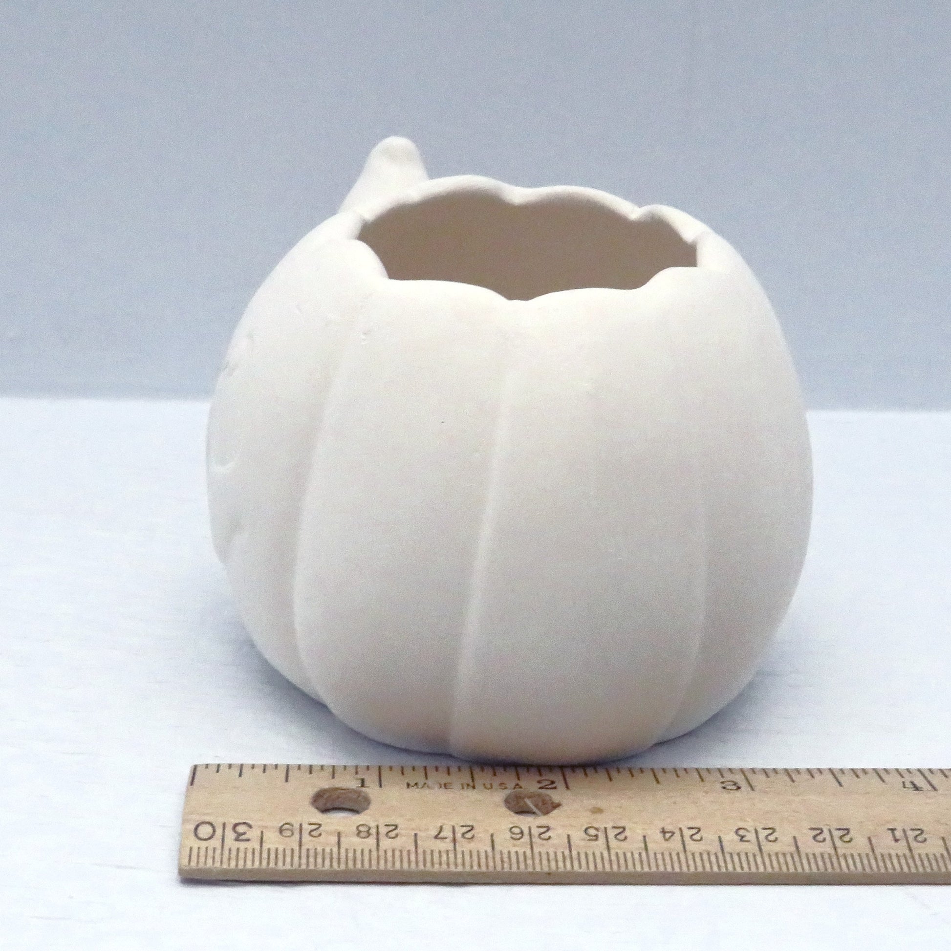 You'll be ready for Halloween decorating with this ready to paint ceramic pumpkin and ghost statue. This pumpkin figurine has a face drawn on in like a jack-o-lantern. It's top is open. Sitting next to the pumpkin statue is a ghost with a pumpkin body. It is 5 3/4 inches wide, 2 3/4 inches tall, and 2 3/4 inches deep