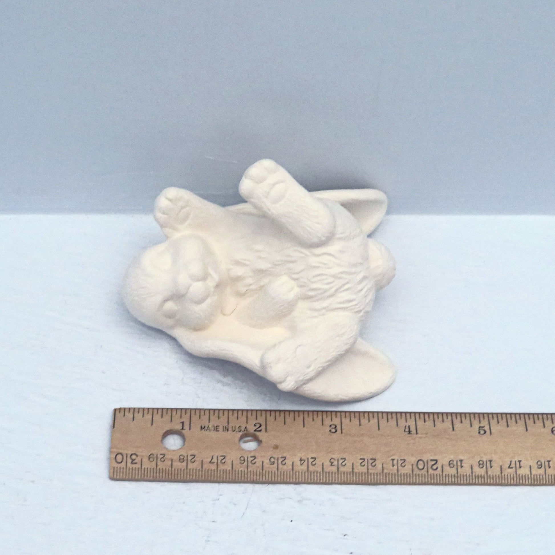 This unpainted bisque rabbit statue was slip cast and fired to cone .04. It is ready to paint with acrylics or glazed if you have access to a kiln. This paintable ceramic bunny is 4 inches long, 2 inches tall, and 3 1/2 inches deep. The bisqueware shows a lot of detail in the cute little face and in his fur.