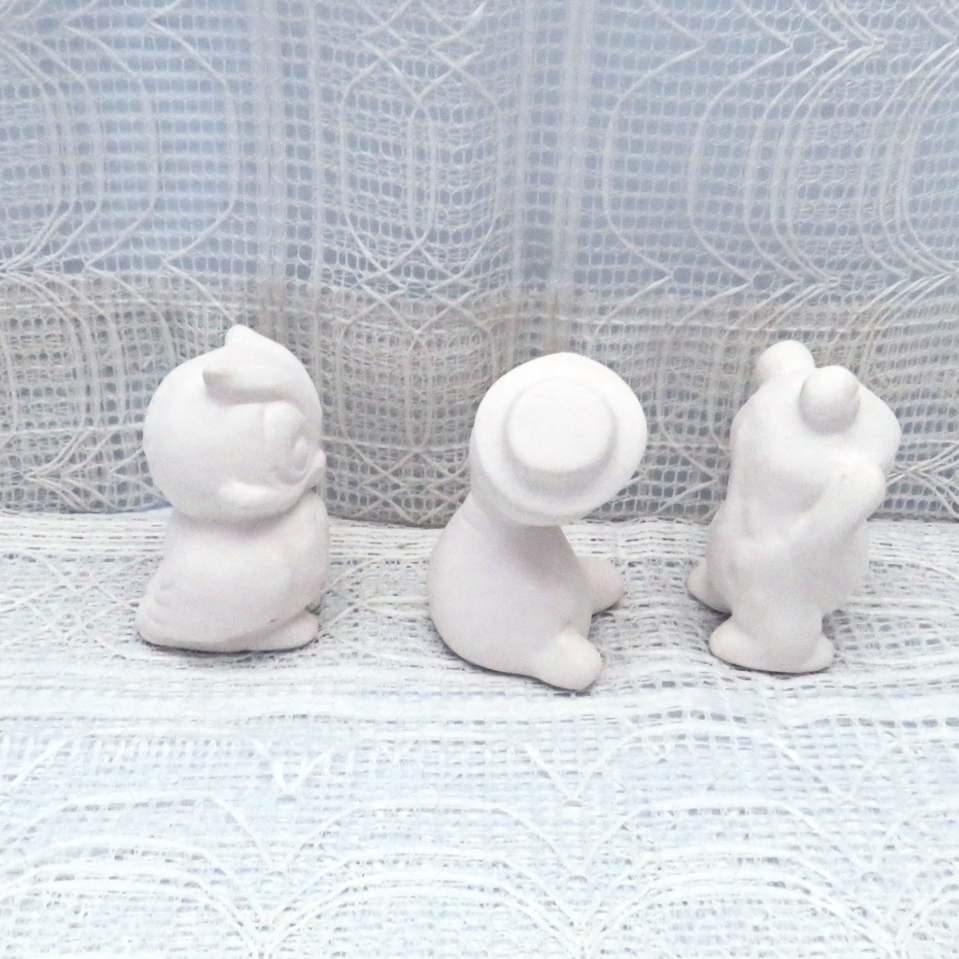 These turtle, owl and frog figurines were slip cast in my studio and fired to cone 04. They are 2 1/2 inches tall and 2 1/4 inches wide. They are ready to paint with acrylic paints or glazed and fired to cone 06. These paint it yourself statues will make a great addition to your woodland decor.