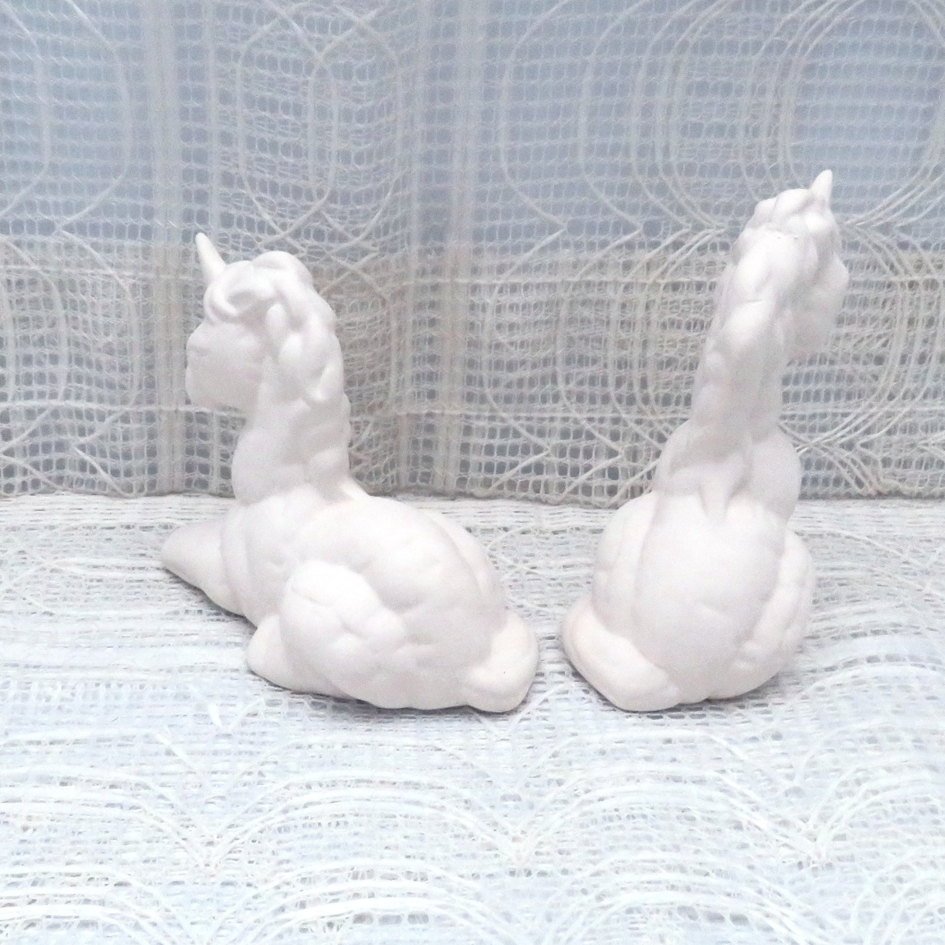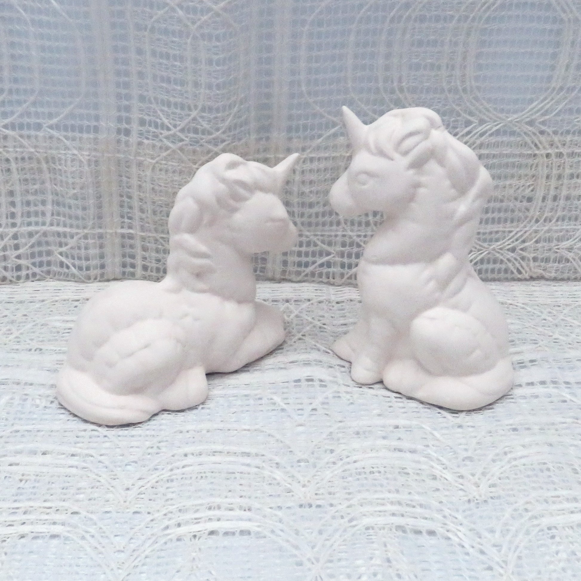 These unicorn statues are made to look like stuffed animals and are ready for you to paint or glaze if you have access to a kiln. One of these unicorn figurines is lying down with her head up and her legs curled underneath her. She is 3 1/2 inches long, 3 inches tall, and 1 3/4 inches deep. The second unicorn decoration is sitting with her head up, looking straight ahead. She is 3 3/4 inches tall, 2 1/2 inches wide, and 1 3/4 inches deep.