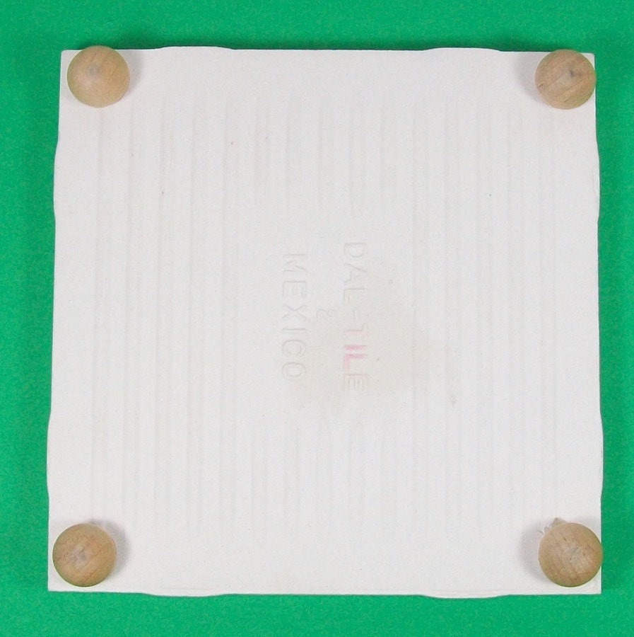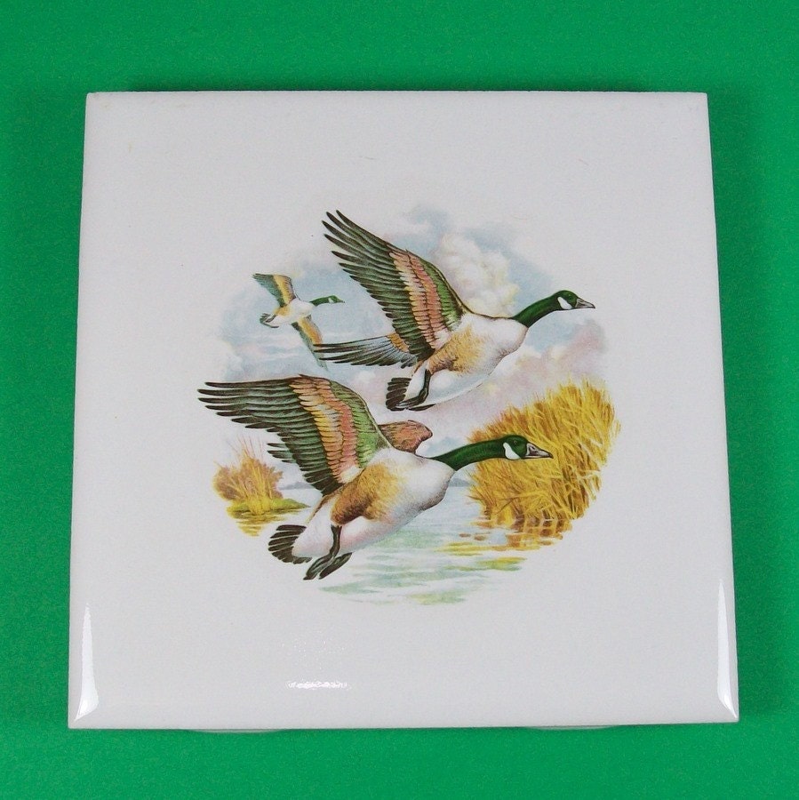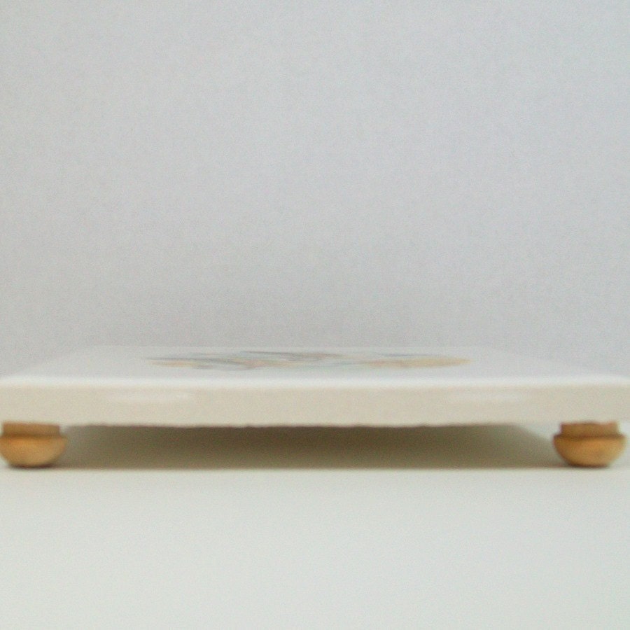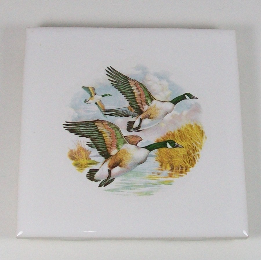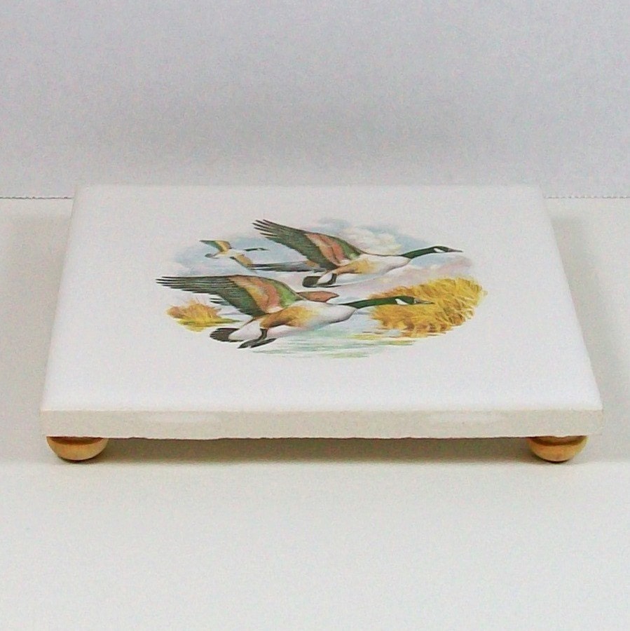 This 4 1/4 inch trivet was made from a commercially produced ceramic tile. I applied the decal with the geese and fired it in my kiln. There are little wooden feet on the bottom to keep it off your surfaces.