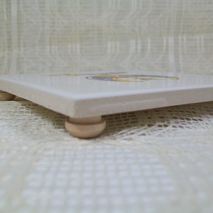 This wine coaster is 4 1/4 inches square and is 1/2 inch tall. The beverage coaster is white with the blue Shriner emblem in the center. It has 4 wooden feet to lift it off the counter to protect delicate surfaces, or to allow a dish to cool, if using it for a trivet.